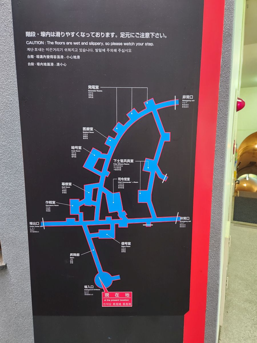 Out in the terminal, we pass through immigration (actual passport in hand – the Japanese are still so strict!), find the ATM then hit the Tourist Information desk for more info on how to get to the Underground Headquarters. We are thinking about taking the bus, but there is a laminated card on the desk providing taxi cost estimates, and we see the Headquarters is only 2500 Yen. When our turn comes, though, we get the lady who only speaks Japanese, not the English speaking ones – so it was a little hard to figure out what we wanted. She spoke and understood enough English to get us a brochure for the Headquarters – in Japanese – to show a taxi driver, and she gave us a nice map of Naha – but just mentioning the bus threw her for a loop. So….what the heck, we’ll just grab a taxi.