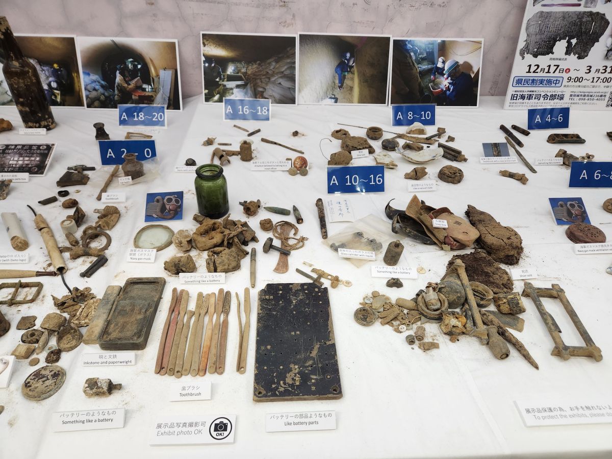 Heading downstairs, we pay our entrance fee and start in the museum which has lots and lots of artifacts from the time period. Most of the exhibit is in Japanese, but there is enough English translation to get the gist. Essentially, this underground labyrinth was used as the Headquarters for the Japanese Naval Command. Vice Admiral Minoru Ota, the Commanding officer of Japanese Navy committed suicide here, along with 5 others on his staff, when it was evident the battle was going to end in surrender. He sent a farewell telegram to the mainland before dying (the recording of the actual Morse code for the telegram is there in the museum!) and there is a carved farewell poem on the wall of the Commanding Officer’s room. The museum also provides details on the 2.7 million explosive devices used by the US – 4.72 per person “based on the population of Okinawa at that time.” In case you were wondering! We also learn that 2,400 “human” bodies were recovered at the Navy Underground Headquarters.