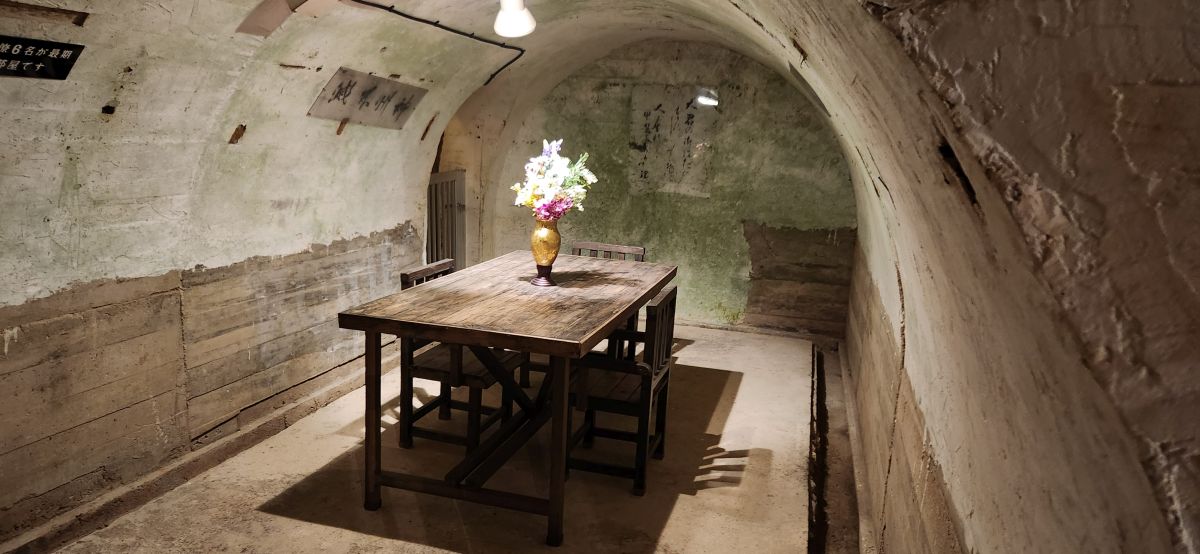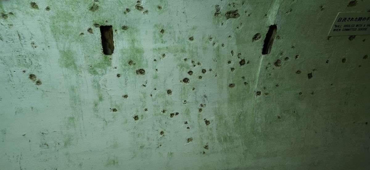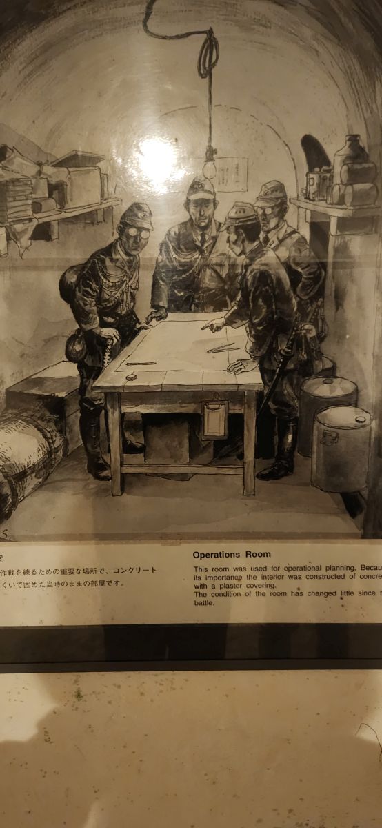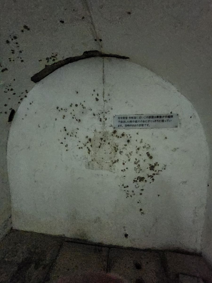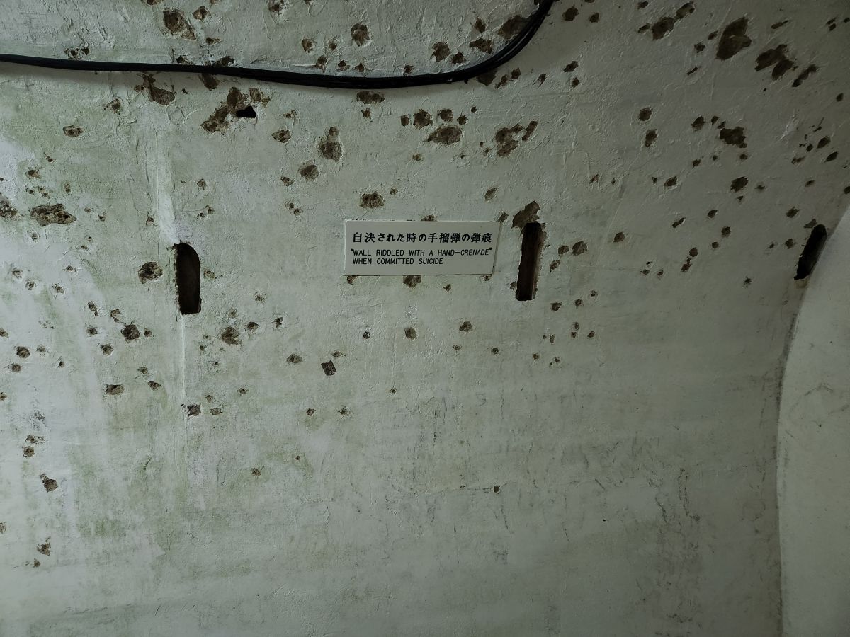 Then down into the tunnels we go. Fortunately it isn’t claustrophobic, a series of large tunnels that lead to the Commanding officers room, the staff rooms and the medic rooms. Some have these oddly carved tree like structures in them – almost like a faux support beam – made to look like nature or a natural structure. There is also the room where Vice Admiral Ota and his staff committed suicide, complete with all the bullet holes and shrapnel holes that caused the destruction and deaths.