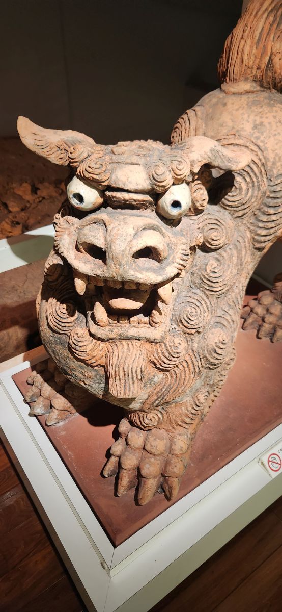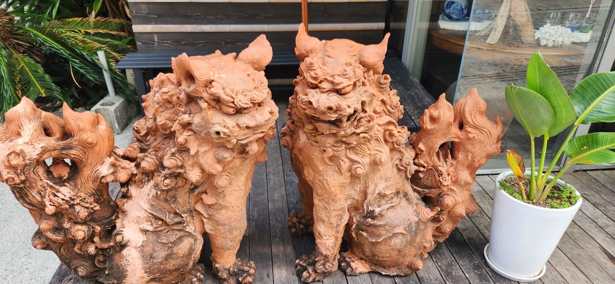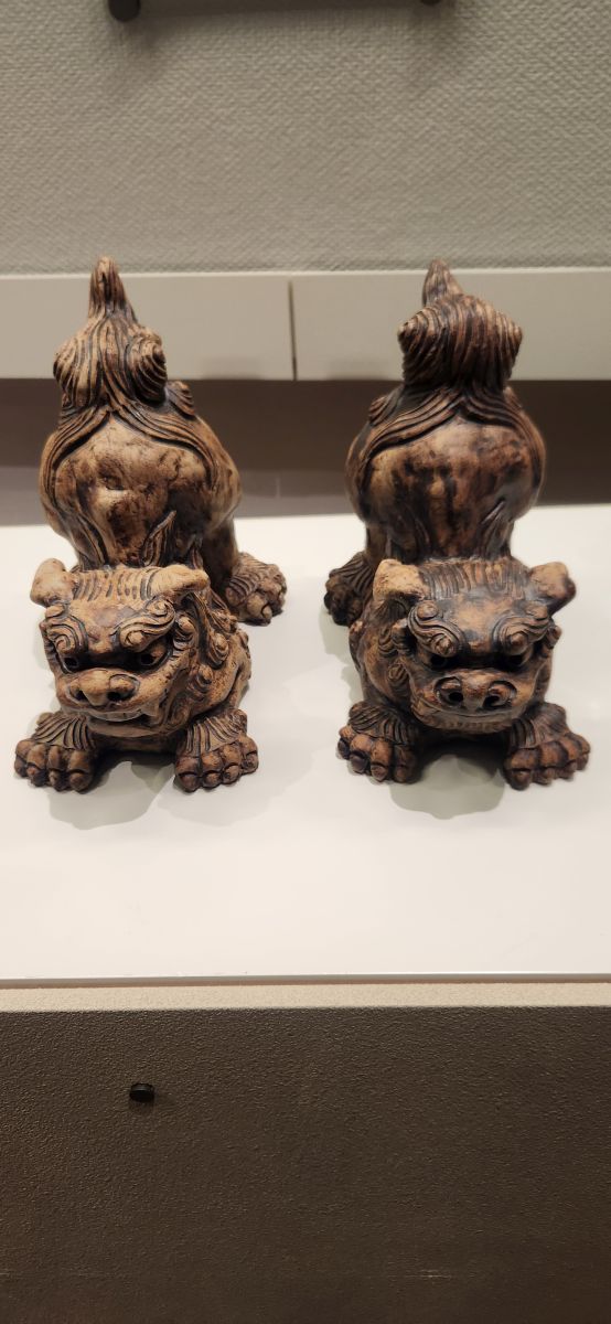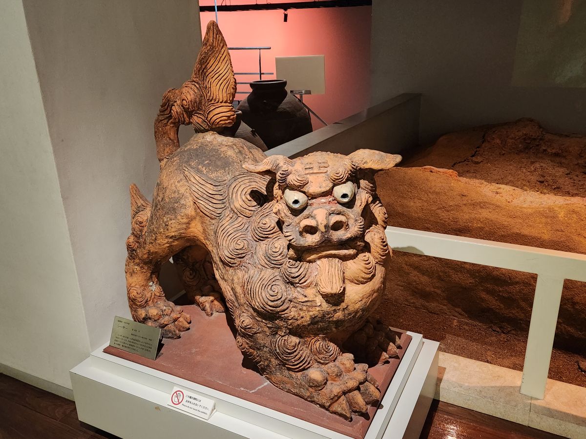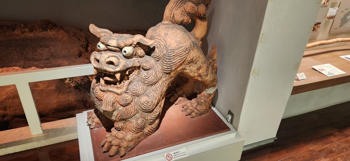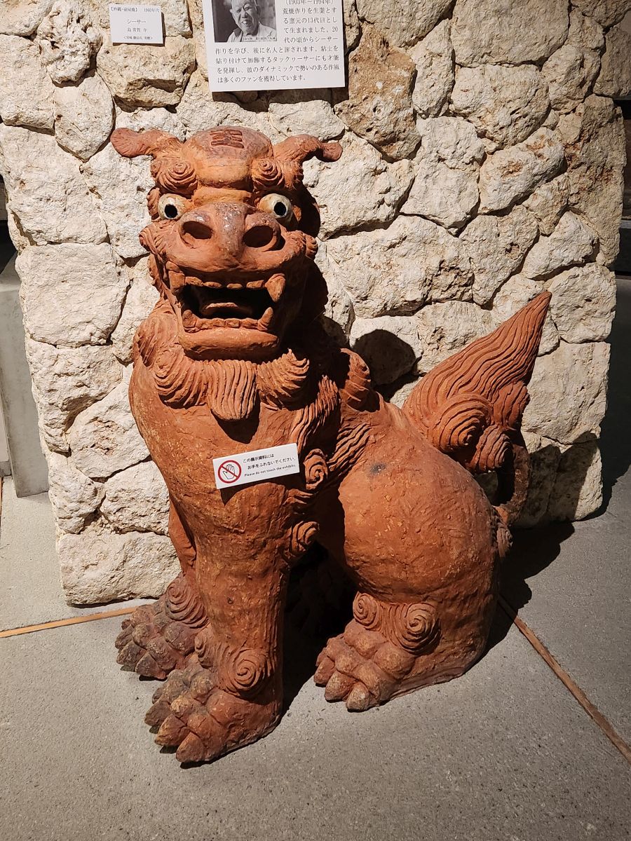 We follow the signs – carved into the street tiles with directions to different places – to the Tsuboya Pottery Museum, which is has fabulous displays of typical Okinawa pottery – and a whole explanation of Shisa – the Lions that ward off bad spirits and are typically Okinawan. Shisa is said to be representative of the Egyptian Sphinx, which you can sort of see in their proud demeanor. First introduced from China around the 13th to 15th centuries, the Shisa symbolizes power and protection from evil spirits. These “lions” can be seen everywhere – two each, one with an open mouth to ward off evil spirits, one with a closed mouth to keep good spirits in. These are found at the entrance to homes, shops, just about everywhere – and placed on rooftops as well.