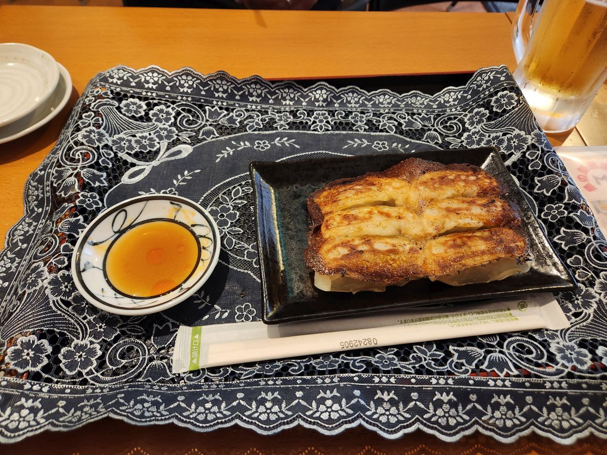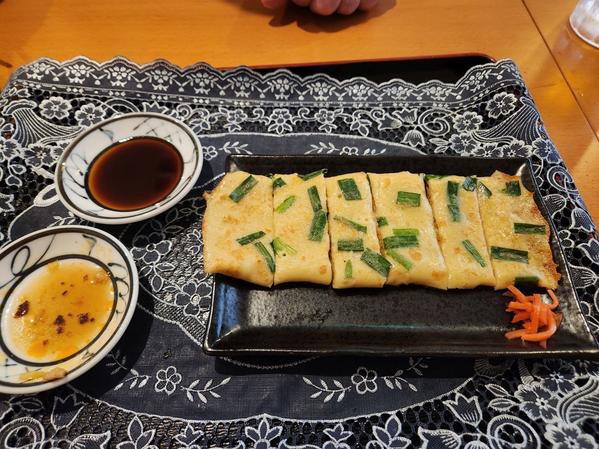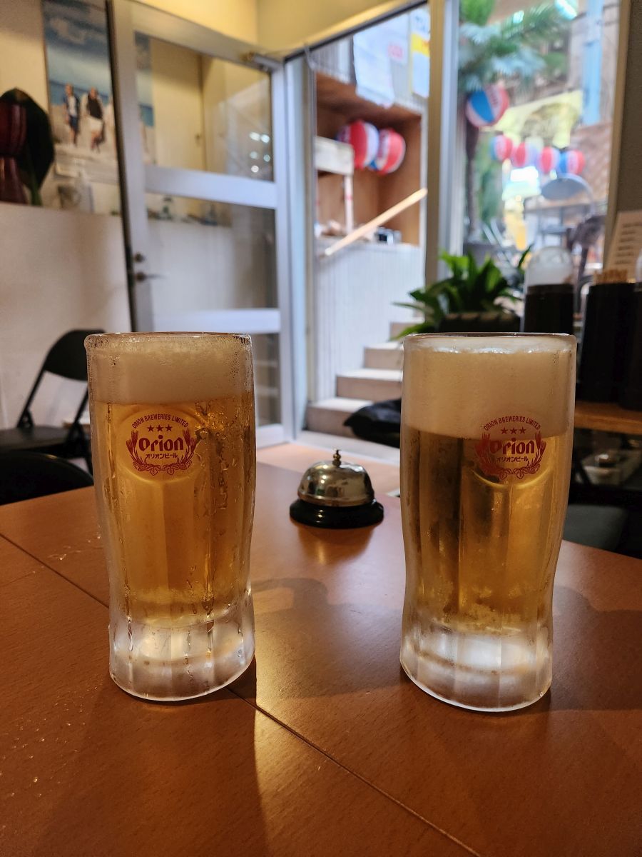 What is delivered are delicious gyoza – sauteed, well, actually caramelized – and crispy and delicious. Probably chicken (thus, the feathers) but who knows? They were delicious, which is all that matters. The Okinawan special is some sort of savory crepe. We’re damned is we know what it was -there were chives and something else inside the batter – but whatever it was, it was excellent! Two Orion beers (the local beers) completed our fabulous Midnight diner-esque meal. The perfect lunch!
