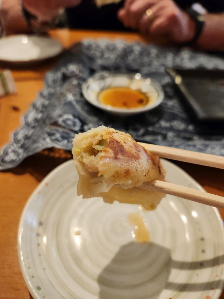 Then it is more wandering through the market, and then to the restaurant where the hawker was trying to sell us on eating earlier. It is a little teeny place – reminiscent of the Midnight Diner, only not so communal – at least not inside. But still, run by a sweet man who also plays the guitar outside on the patio type area at the top of the steps leading down into the restaurant. Here everything is either 400 Yen or 500 Yen – just take your pick! We choose gyoza – which is described as dumplings with feathers – okay! And also what is translated as an Okinawan specialty. Have no clue what it is – beside a specialty. Well, when in Rome….or Okinawa as the case may be!
