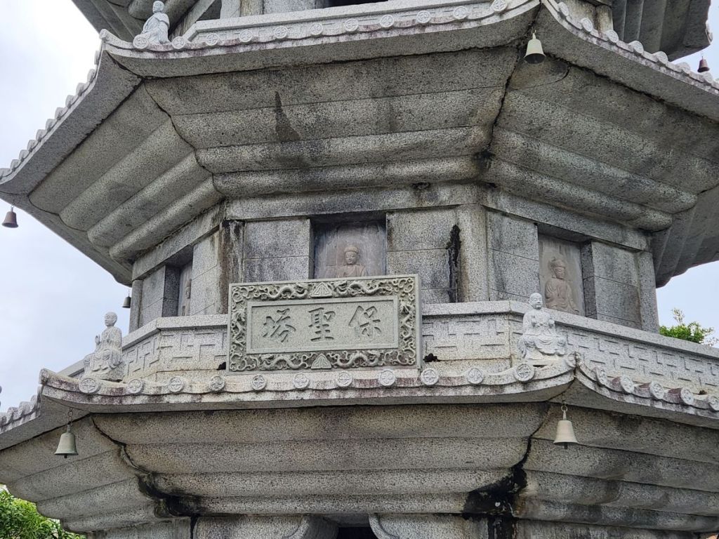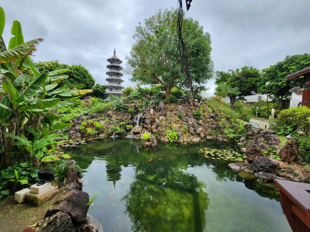 After the museum, with its fabulous displays and “open space” area outside with a little temple area, we wander the streets of the pottery area, perusing the many, many stores selling everything from ceramic chopstick holders to cups and plates and a bazillion different version of Shisa. We actually end up buying a set of Shisa with an Ishiganto carving – the carved stones that are placed at intersections to ward off evil spirits and keep you safe. Perfect!
