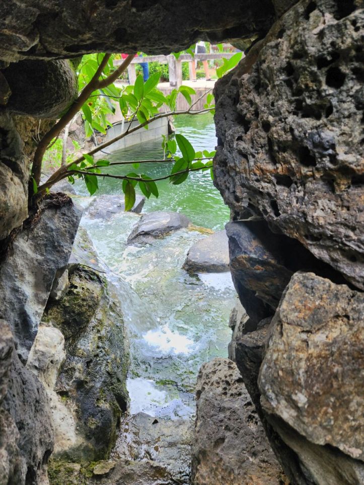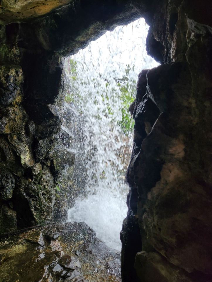 There is also an amazing waterfall that we can climb atop -along rough stone steps – for views across the park. We carefully pick our way down the stone slab steps and into the stone structure behind the waterfall. We could walk through it, but choose to stay dry and only take pictures and a video of the powerful water from a safe distance!