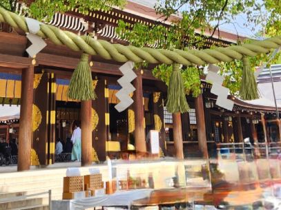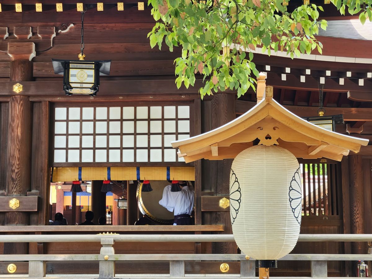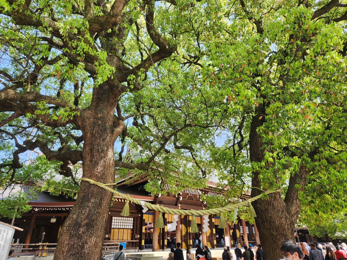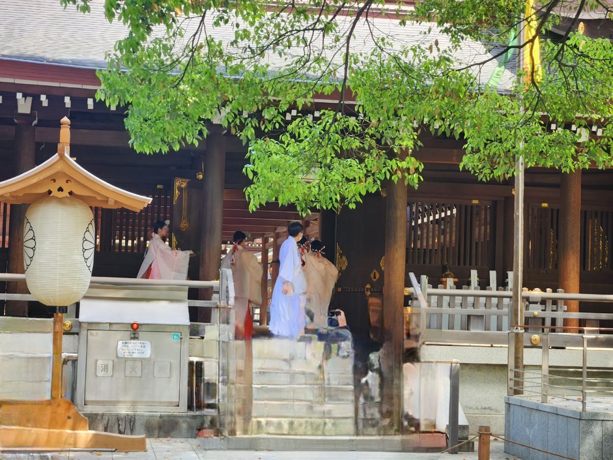 It turns out today is a special Emperor’s Day memorial festival and there are lots of priest processions and women in costume. But we can’t get near any of that. There are guards who are keeping us at a distance. We end up just wandering around – we have whisperers, so we can hear Osamu – taking pictures of the different gates and the sweet Camphor trees that known as the “Husband and Wife” trees. They have become a symbol of happy marriage and harmonious life within the family. Too bad it is such a zoo review at the shrine offering – otherwise we’d pay our alms and pray for a continuation of our happy marriage. Oh well, we’ll just make our wishes to the trees!