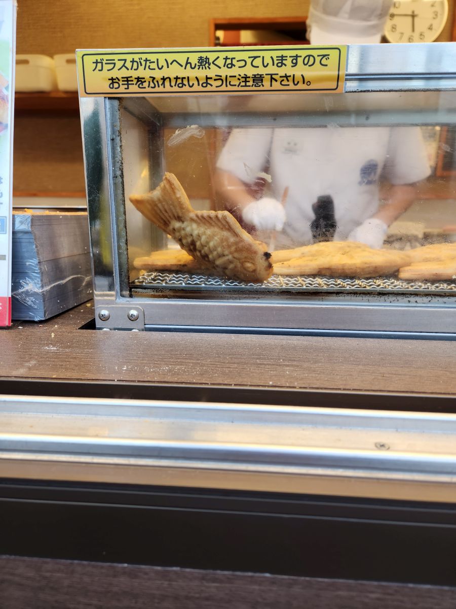 Later, Osamu walks a few of us (5 total) around to the train station, pointing out different shops and restaurants we can try later. This is perfect for us as we were looking for something for tonight and tomorrow! We get lost in the train station looking for stores – there is renovation and it throws Osamu off his directions – end up back outside wandering through the great little business district. We stop at a place that has sweet treats in the shape of a fish – filled with red beans or sweet potatoes or cream. Like a stuffed waffle. Osamu offers to buys us some for a treat – so sweet! He gets us bags of the stuff which we all share. The red bean is really good – and now we’ve had our dessert – so we’re coming back later for dinner!