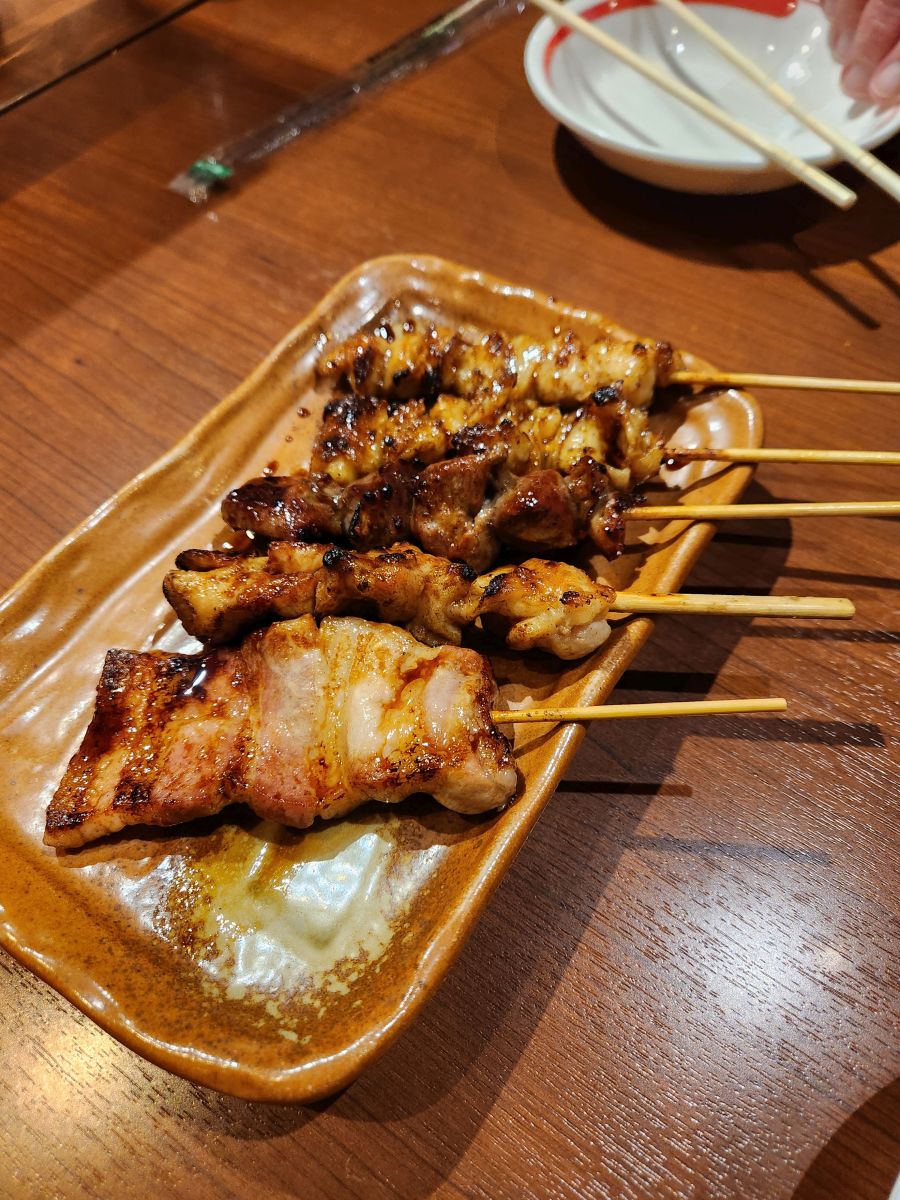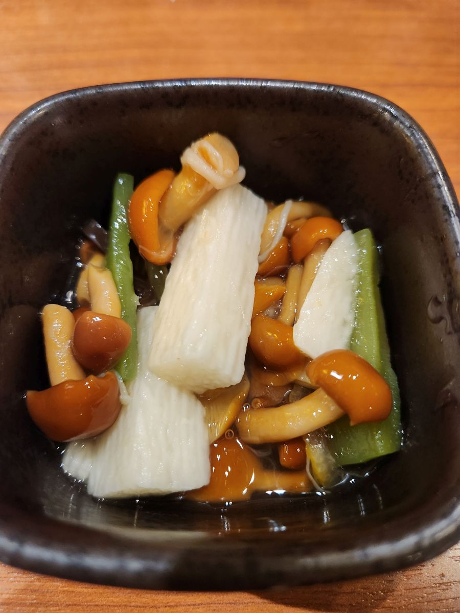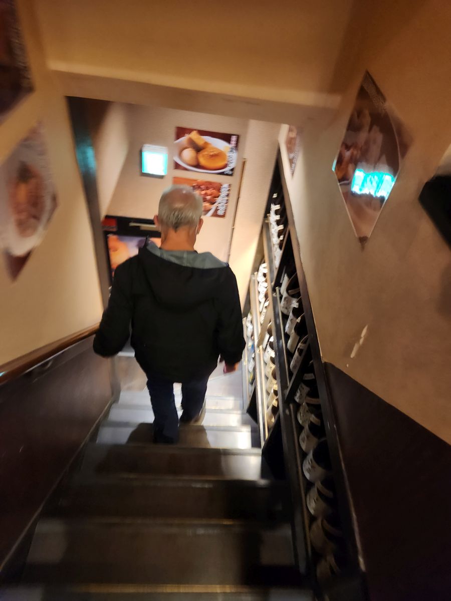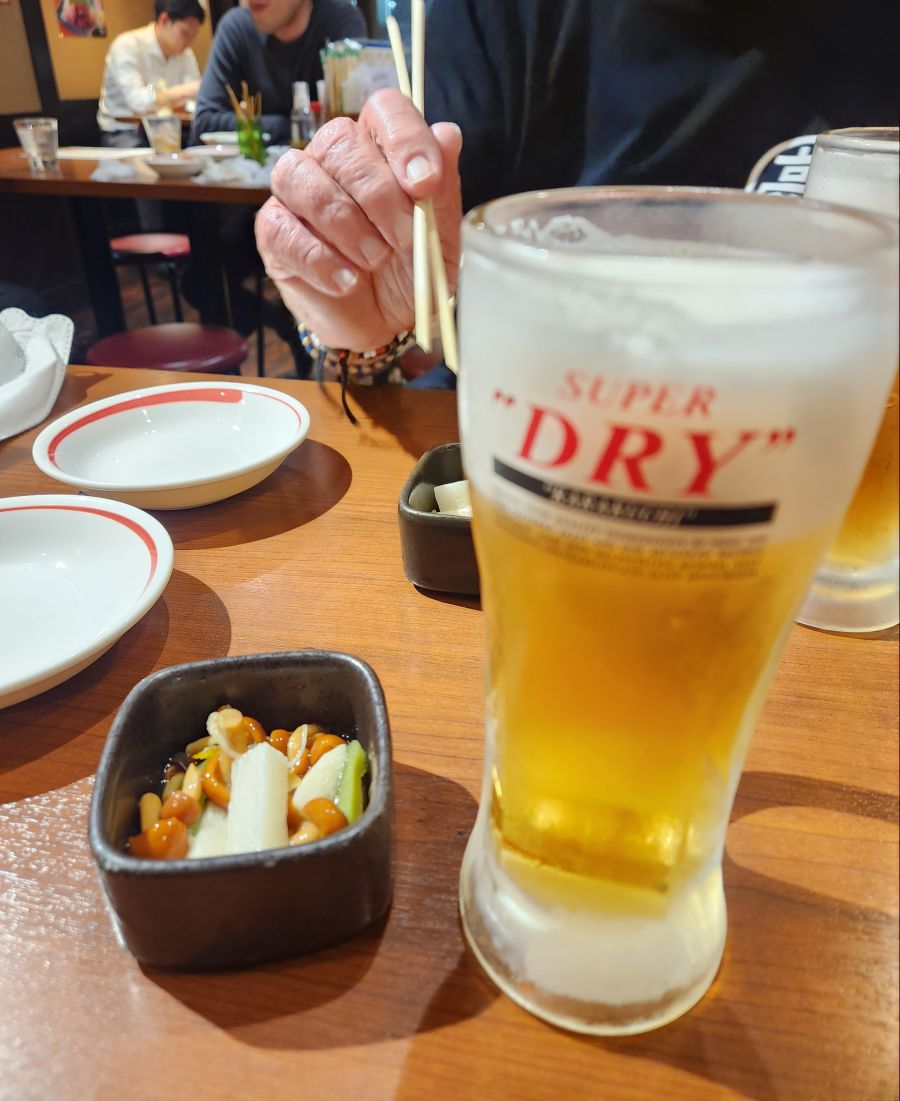 And later we do – choosing Masuya for our meal. A totally traditional Japanese bar/pub place on 3 levels, we walk up to the door and the guy holds up 2 fingers. Yes. Then says “upstairs.” Ok – up we go, to be seated at a big long table divided by menus and condiments. Here we order an assortment of snacks. Sashimi of Octopus, Salmon and Tuna, Pork Shumai and an assortment of skewers – along with 2 beers and little pickled mushrooms and veggies that comes along with our beers. Awesome! And so reasonable. $27 USD and we’ve had the perfect dinner!