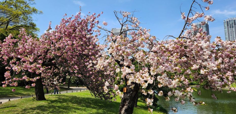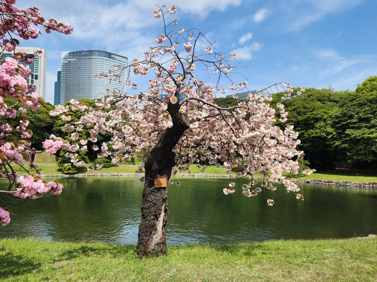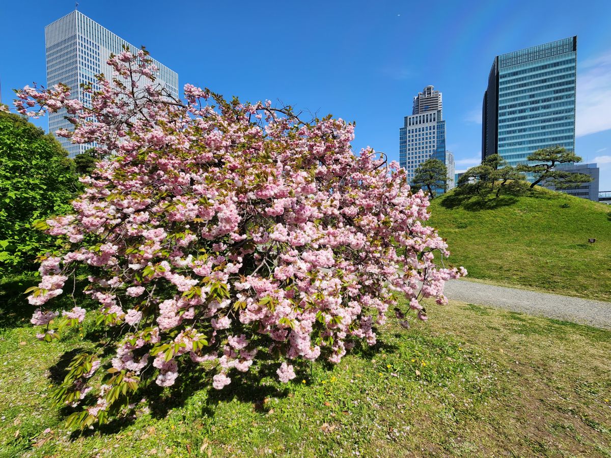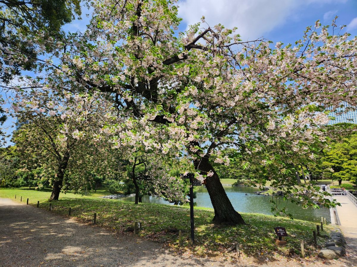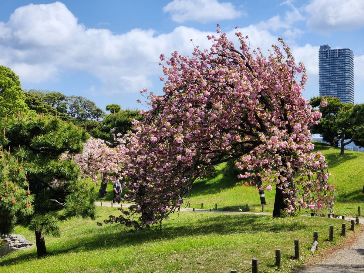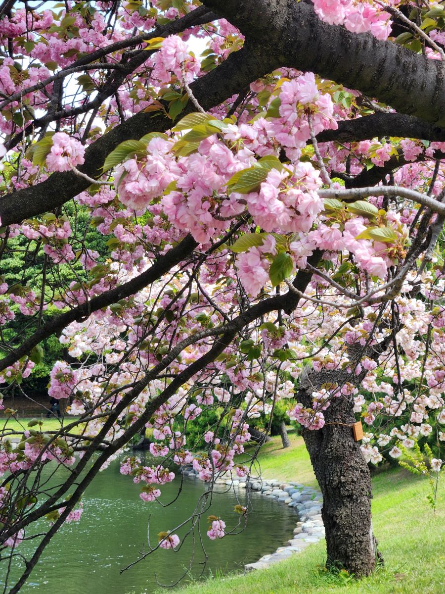 We find the last flowering cherry blossoms, some old stone pillars that are Chinese in origin, representing the mountain of eternal youth and immortality, then climb to the highest point of the garden for photos, before continuing on around past traditional Japanese stone carvings and then out onto the street heading for Hama-rikyu gardens.