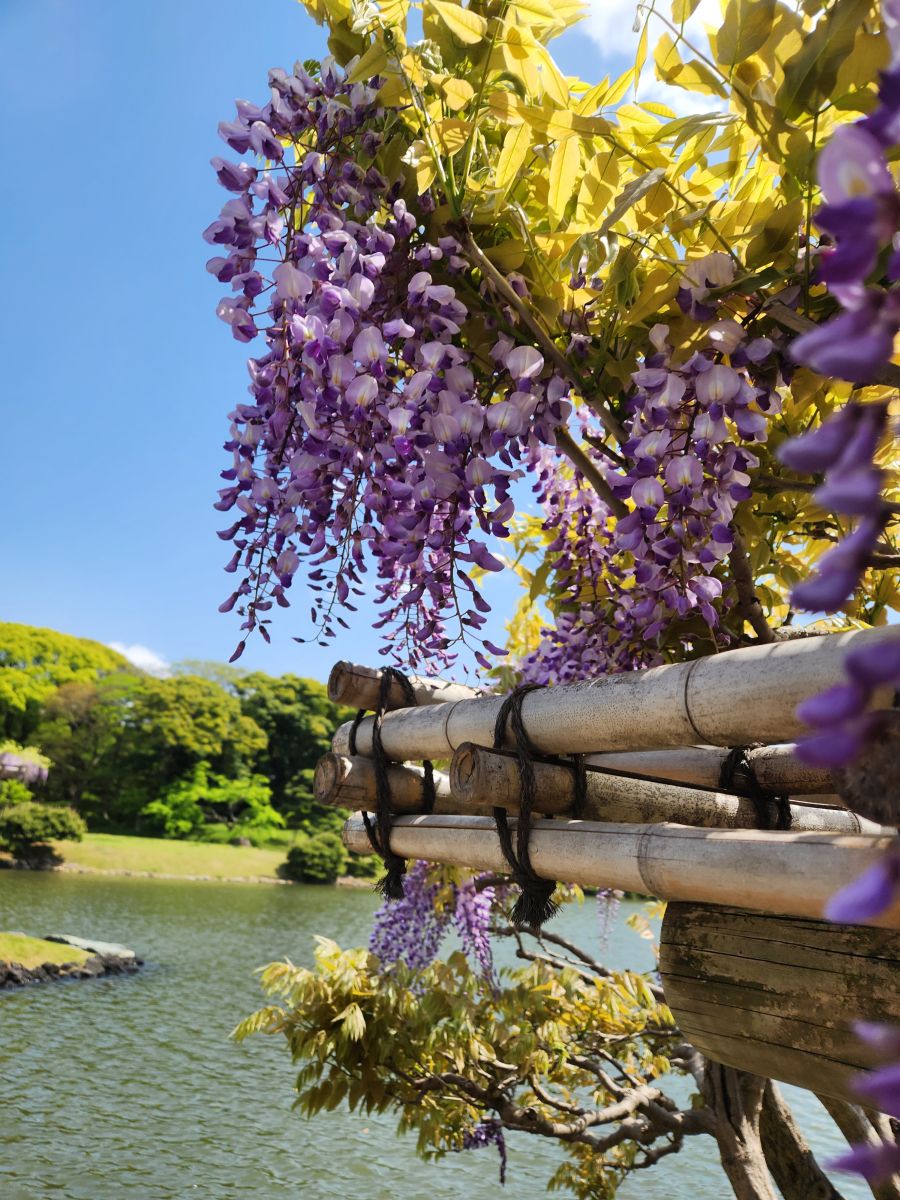 We circle the largest part of the pond, taking in views from the highest point and crossing the bridge that leads to the tea room. There are incredible flowers here on the trellis and an amazing twisted old pine tree.