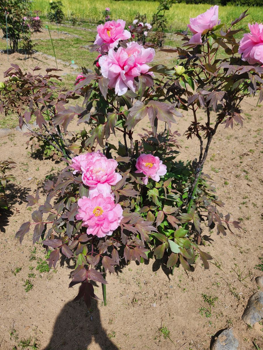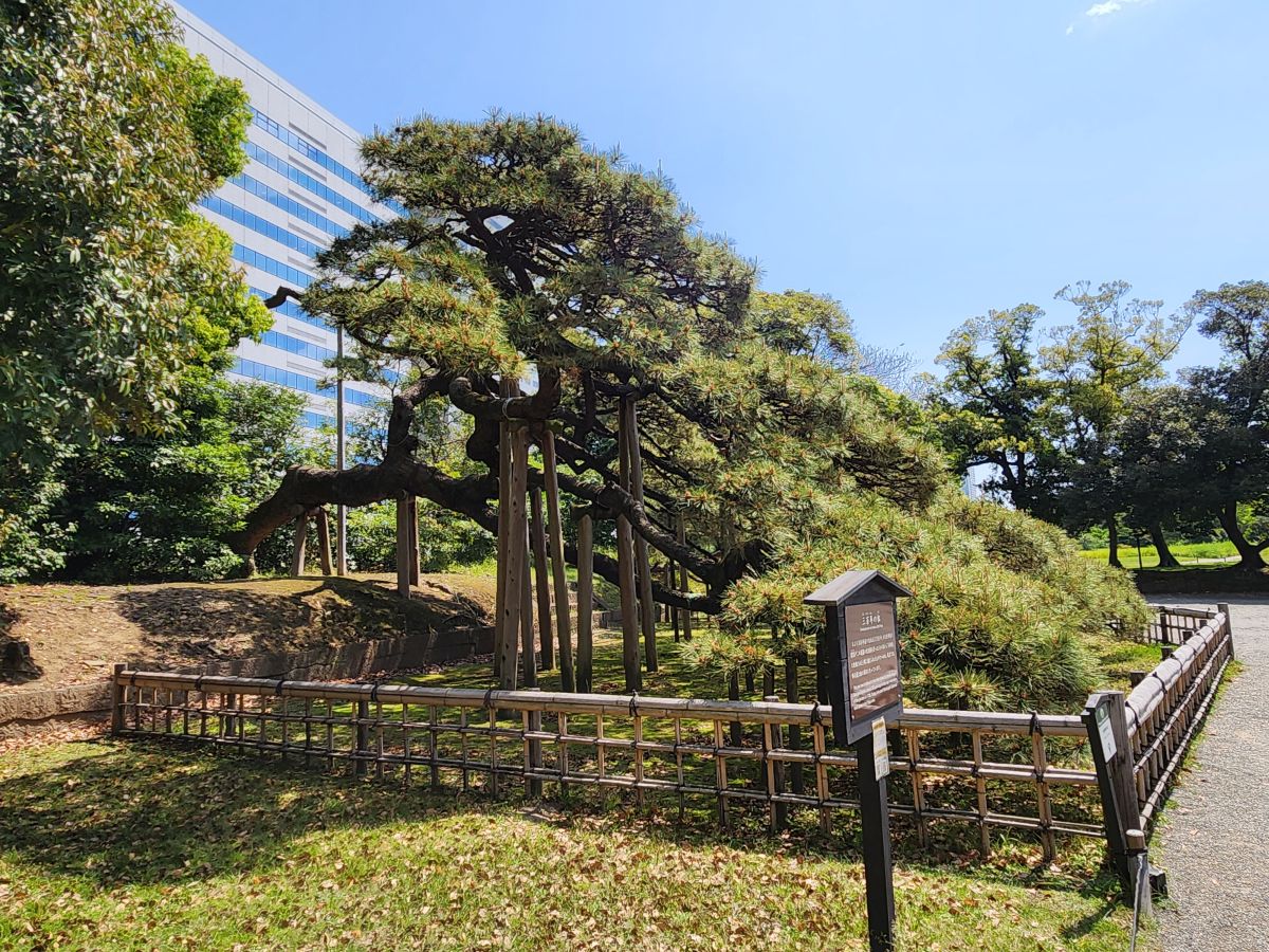 Then onto to the Peony field where the blooms are almost done, and onto the exit near the 300 year old pine, Sambyakunen-no-matsu. The pine is said to have been lanted to commemorate the great renovations made to the garden by the 6th shogun Ienobu. It is massive and spread out over a large track of land, but its branches are so low and close to the ground that they need to supported with thick wooden posts. Still an amazing sight!