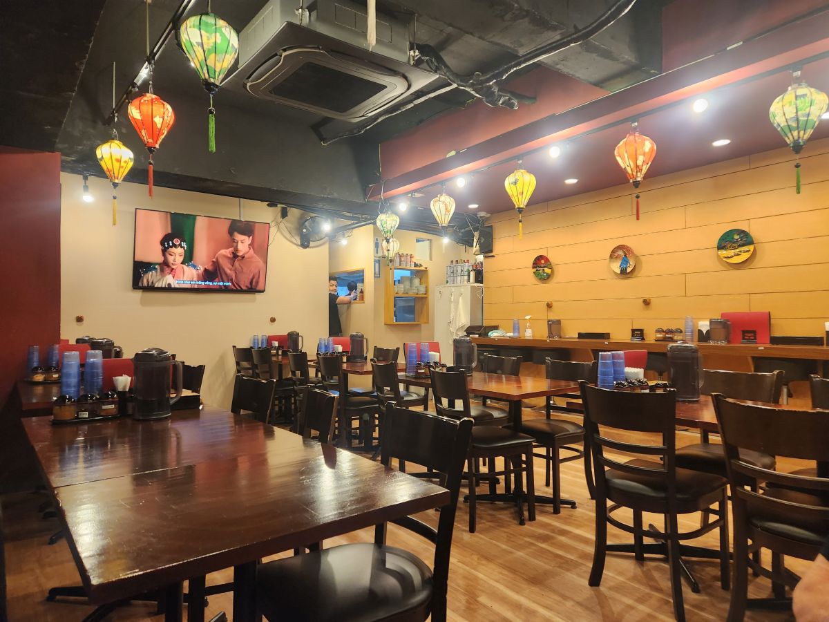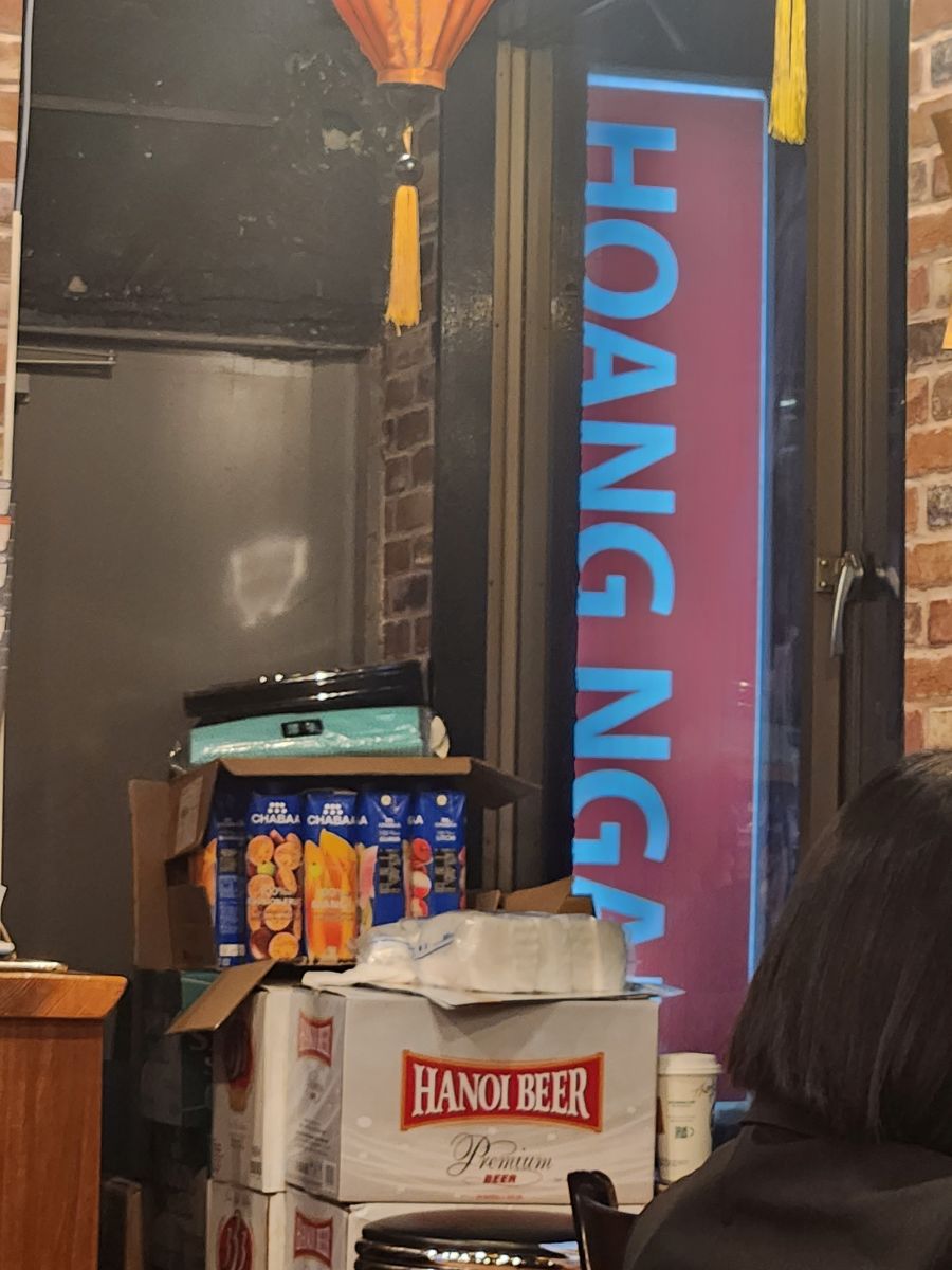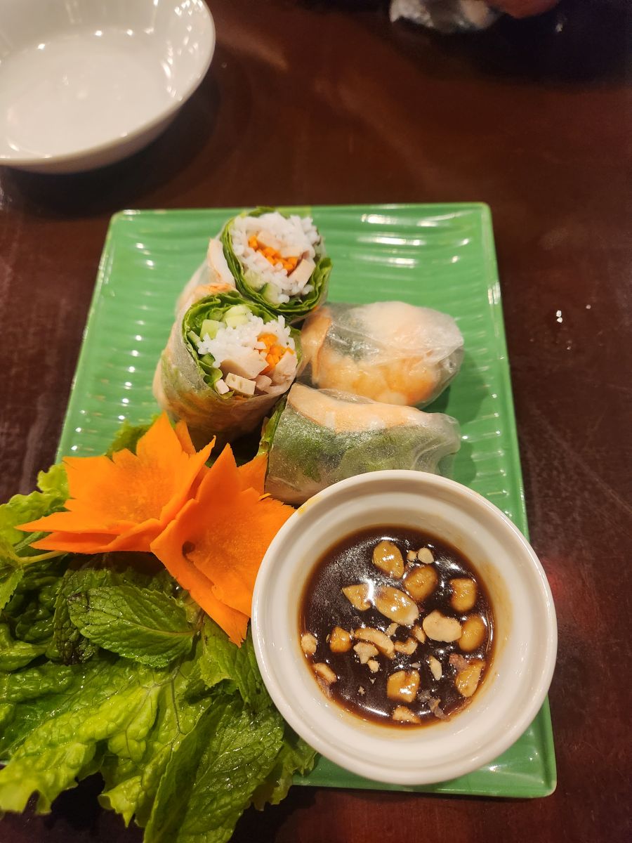 Google maps gets us there, but we still can’t really find it. Until we see an advertising sign – look up! It’s on the 4th floor! Taking the circular staircase, we arrive to a completely empty restaurant and are seated at this great little table where we have the best Vietnamese meal! Excellent shrimp spring rolls and a fabulous version of Bun Cha! And Saigon beer and a reasonably priced glass of wine! Plus the whole atmosphere and the setting (on the 4th floor) really makes us feel like we are in Vietnam! I’m teleported right back to Hanoi!