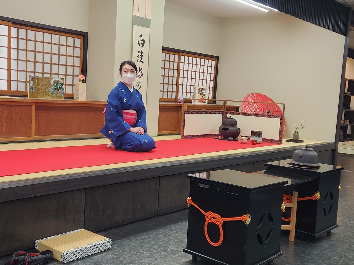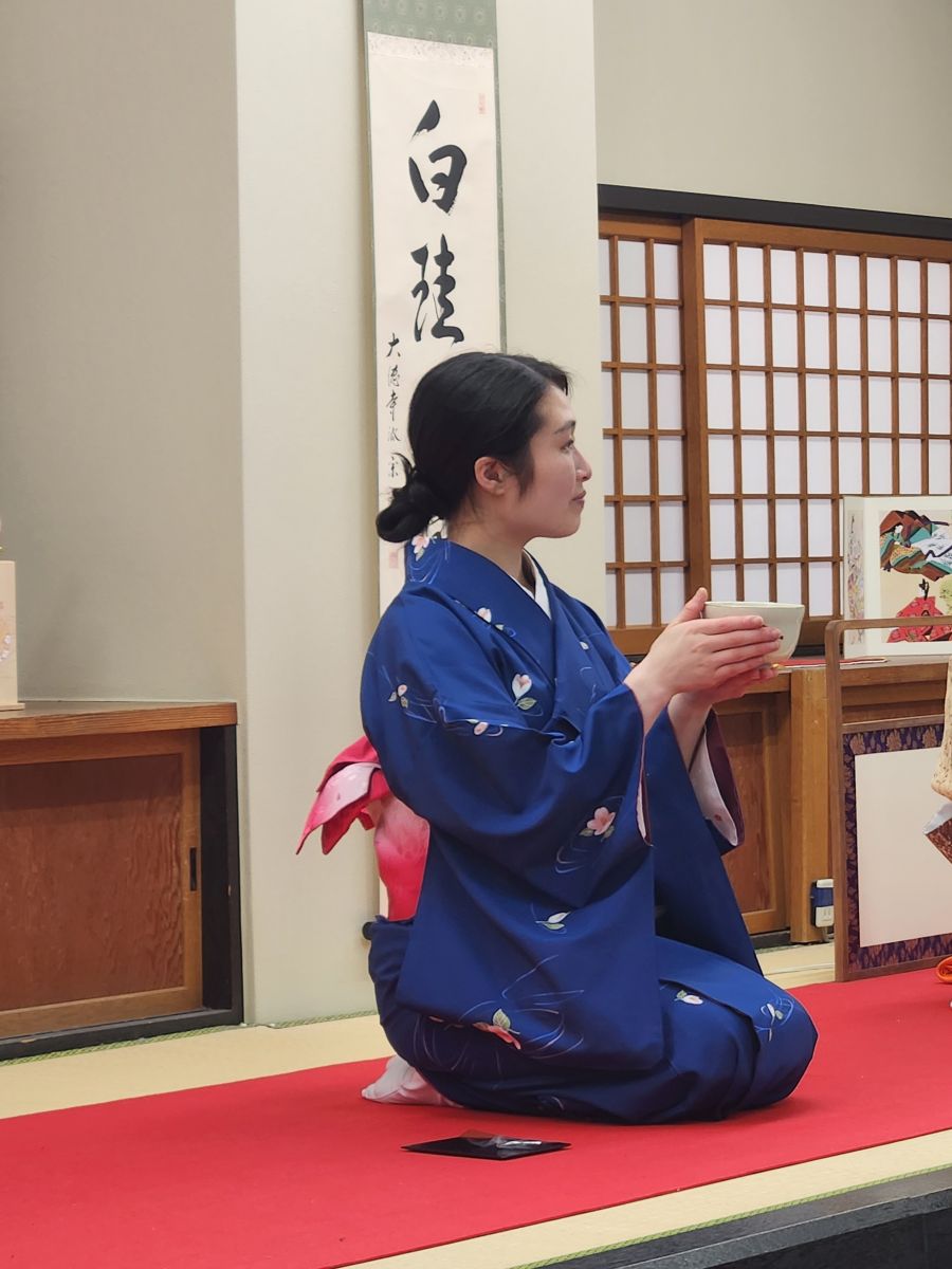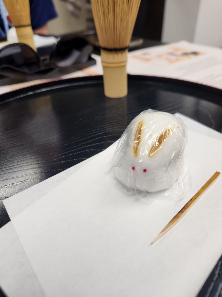 Back on the bus, we drive through Kyoto, over bridges with sparkling clear running water rivers, and to our first stop – the tea ceremony. Not our choice – but we have no choice. We are all herded up into the open room with the tools to make our own tea in front of us – and watch a lovely little show of the mamasan making tea for her guest. It is very Japanese – just what you’d expect a ceremony to be. Then we are served our tea. Ok – I am NOT a tea fan, and this matcha stuff is, well, in a word? Gross. But the best part about the whole thing is the sweets that are given to us first, so we can have sweet and bitter together. Don’t even bother with the bitter tea – just give me the sweets – which is in the form of an adorable little bunny. And totally yummy!