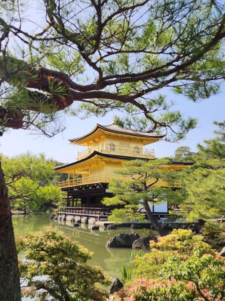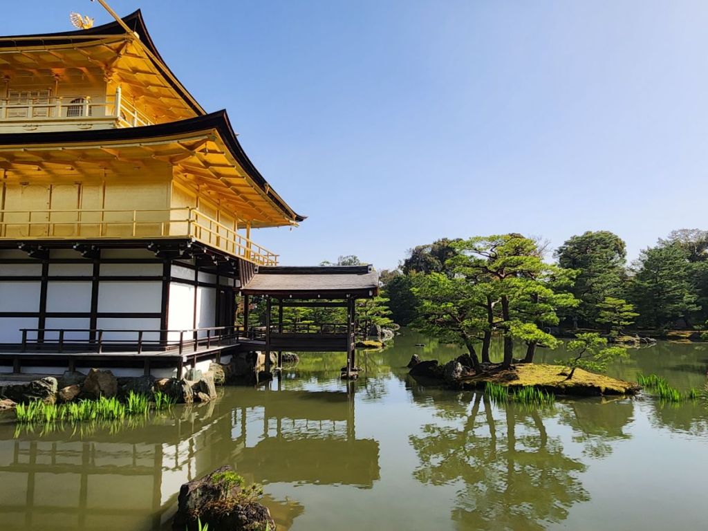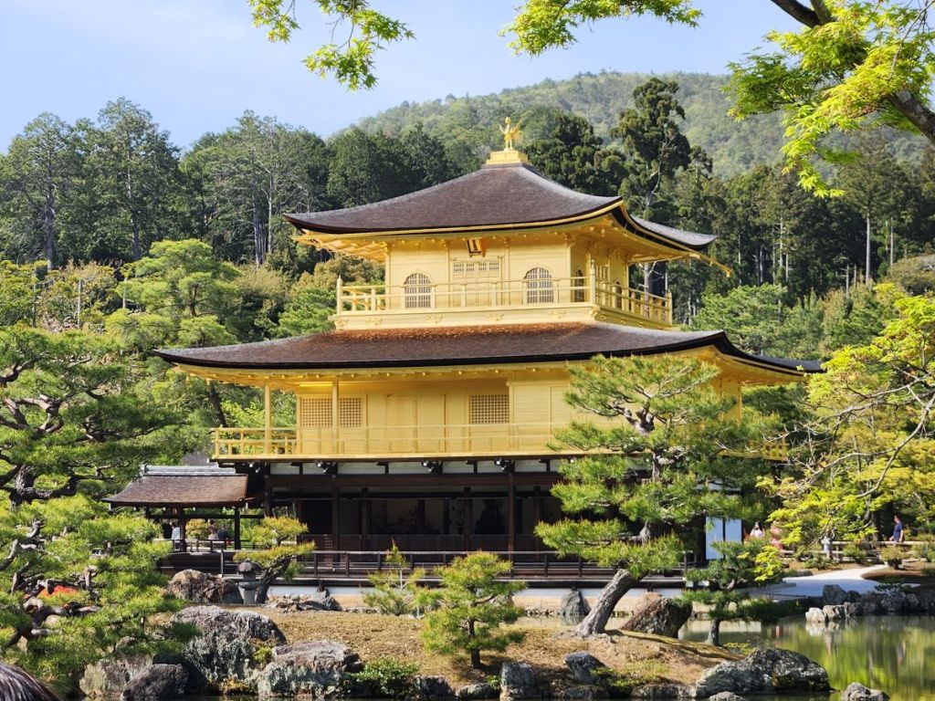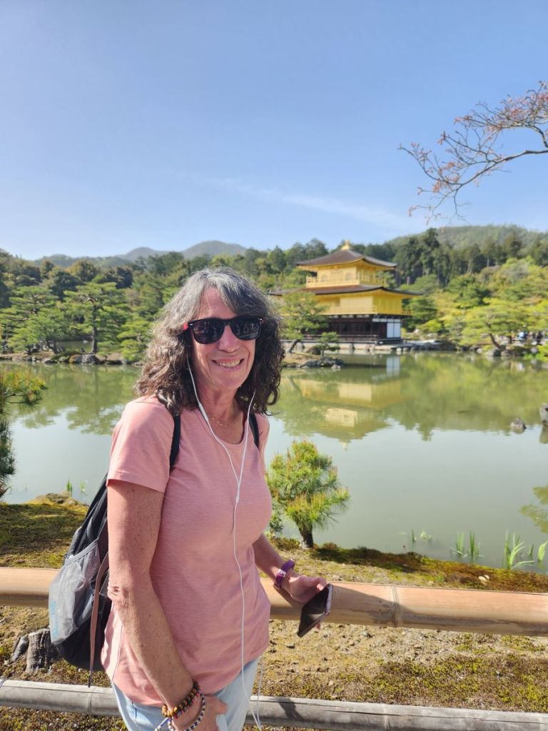 Back on the bus, we head off to the Kinkaku-ji Temple, or Golden pavilion. Originally built in the 12th Century as an aristocrat’s county estate, then taken over by a Shogun, it was converted to a Buddhist temple after the Shogun’s death in 1422. Largely restored in the Edo period, it sadly burned down in 1950 and this is an exact reproduction, including the gold leaf encrusted temple – thus, the “golden pavilion” moniker. We have 30 minutes here to walk the one-way circular trail. Of course, we take off, A) because it is crazy crowded here and B) because we just can’t walk as slow as Osamu’s style! Even though uncomfortably crowded, we can at least bob and weave our way around to get some fabulous photos! It is a perfect day to wander here – gorgeous sunshine, mild temperature – if only there weren’t so many people!