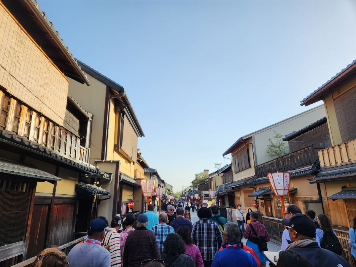 Sadly, we should have just stayed there and filled our stomach because the next 45 minutes can only be described as painful. This area is tourist laden – or overburdened – take your pick. The streets are crazy crowded, we are walking painfully slow, Osamu is droning on about geikos and shows and rich business men who pay for an evening with the geikos. The street is lined with old traditional wooden buildings and lanterns, but it is so crowded you can’t get a good picture. Then there is the bossy know it all Aussie/NC chick who has seen the signs that say “No photos on private streets” and is yelling at everyone to not take pictures. Come on man (or chippie) – this is NOT a private lane – it is the major thoroughfare through Gion. The little lanes leading off of here are the Private streets where pictures are forbidden. Sigh.