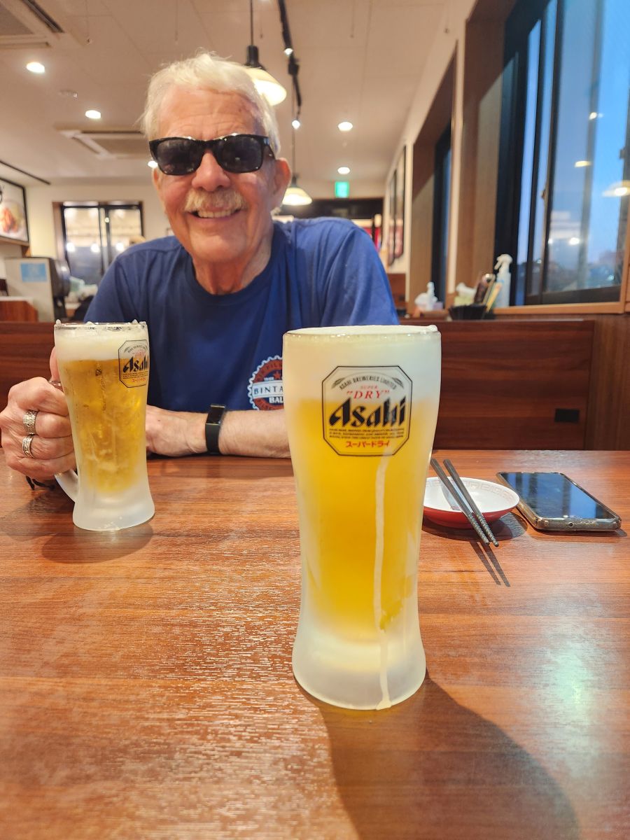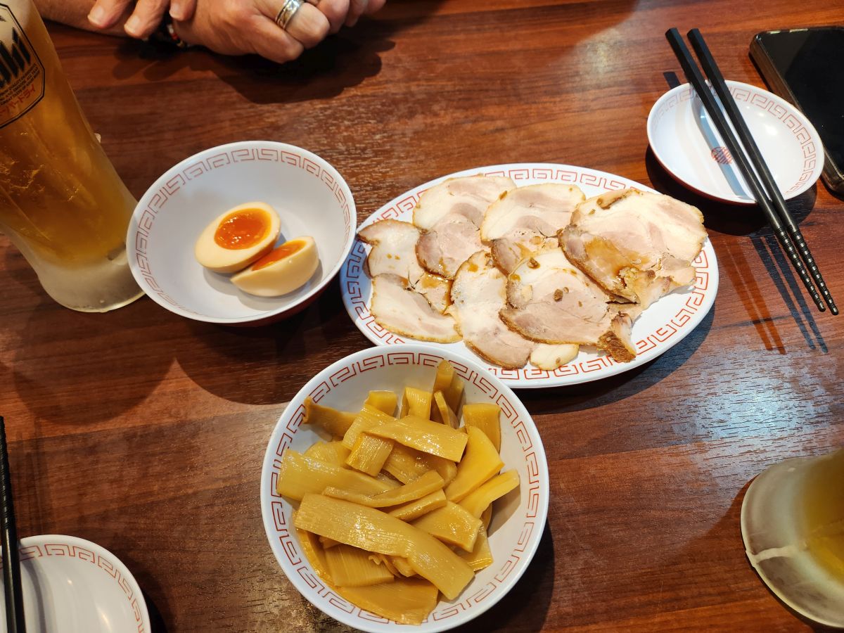 Checked in, freshened up, we hit the road, heading to a little place I found in my research which has an assortment of everything – from sushi to tempura. Finding it was easy – but getting in not so easy. Unfortunately, there are no seats available in the tiny restaurants. Poop. Plan B – we wander! Actually ending up in a great place that we’ve deemed the Japanese Denny’s (for some reason – maybe coz it sort of looks like a free standing Denny’s). There are spacious tables, we get to order on the tablet that the waitress helpfully changes to English. Perfect! A repeat of lunch plus a few dishes – Gyoza, fried chicken, marinated bamboo shoots, a salted egg and this great thinly sliced pork! Plus 2 beers and it only cost $14 USD. Happy campers.