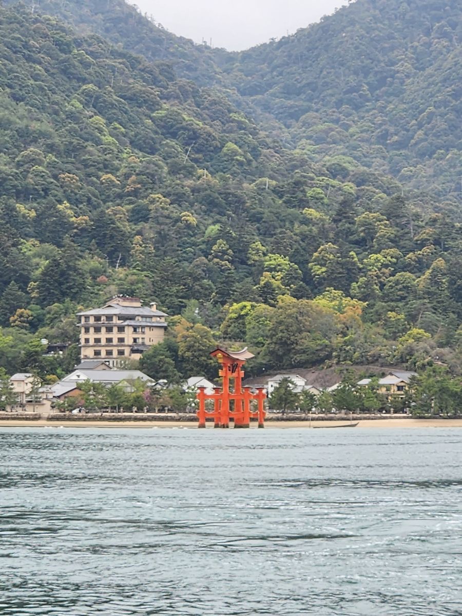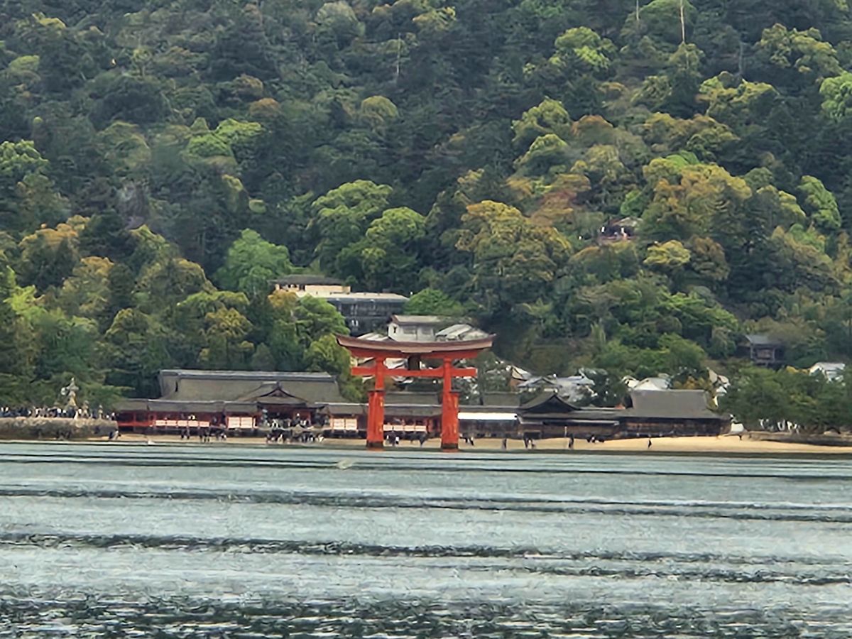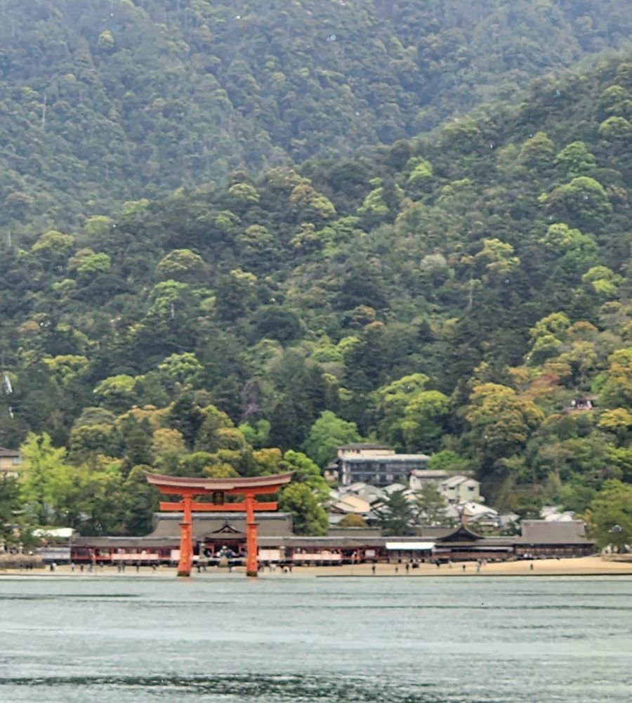 90 minutes later, we are in Hiroshima being herded onto our full-size bus! Wow! Great surprise. We thought, along with Osamu that we would have a minibus. Luckily now we can all spread out. Sadly though sick camera lady is one row back on the other aisle, hacking up a storm and blowing her nose, with no mask in sight. And we’ve got an hour’s drive to the pier for the ferry to Miyajima! Double masks!!!