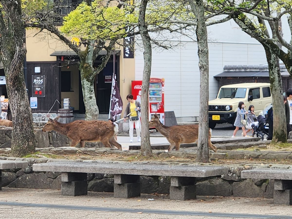 Then its back toward the ferry terminal, picking up a beer to enjoy while we sit outside watching all the kids and the Shikano. One particular group comes by with a deer dutifully following – essentially because they are teasing him with a skewer of meat. Even though they are cute and tell us the guy is Santa Claus, it’s a little mean. They finally do give the deer the meat on the stick – so in the end it is all right, I suppose. Kids will be kids.