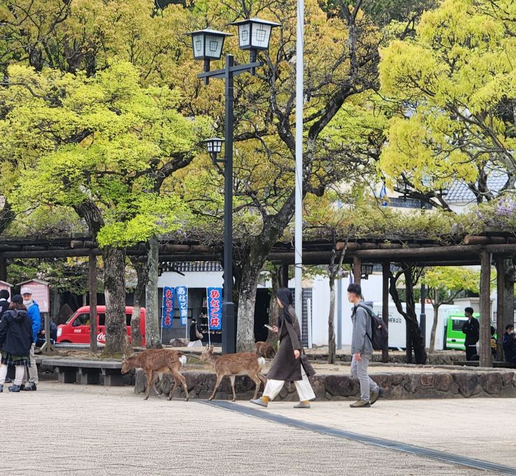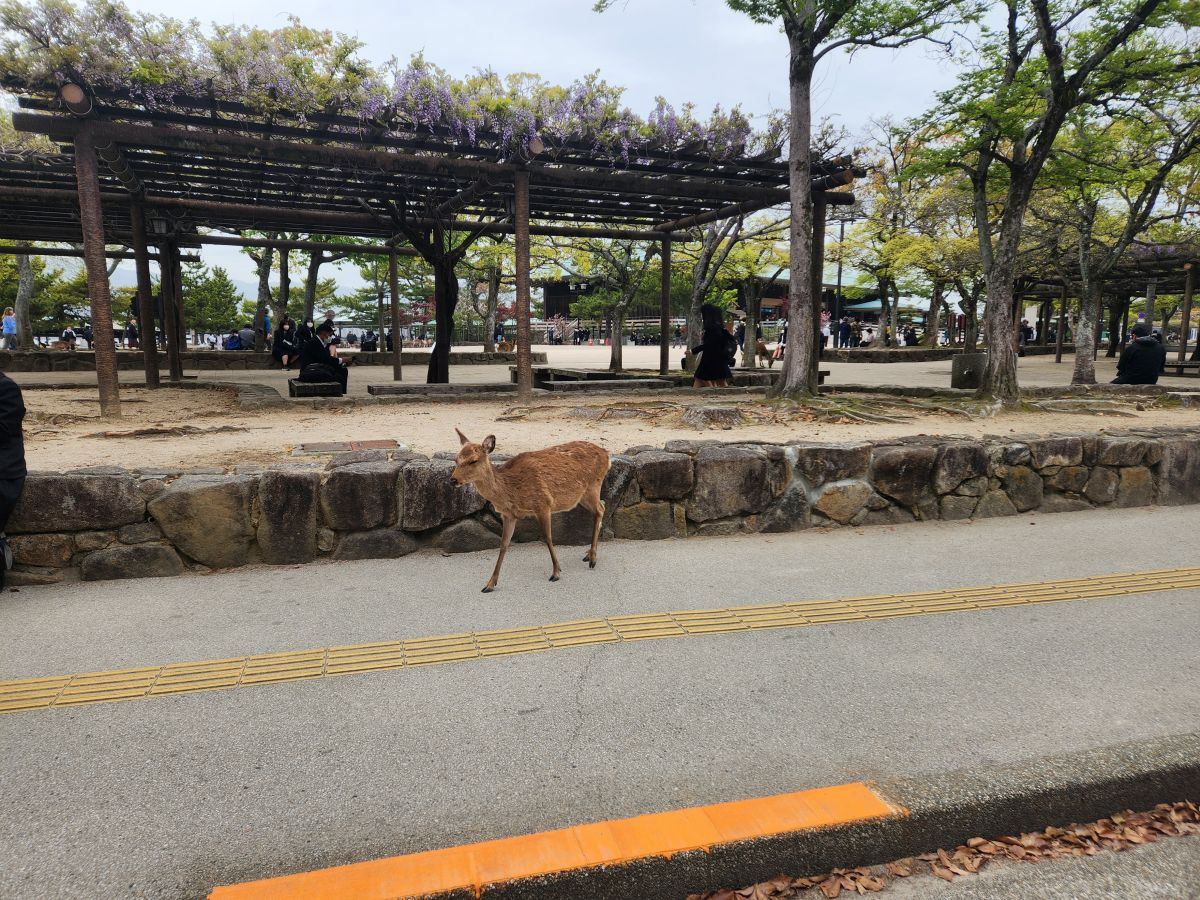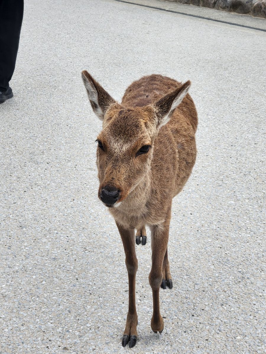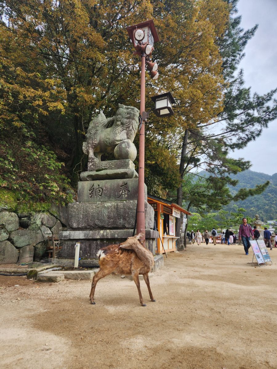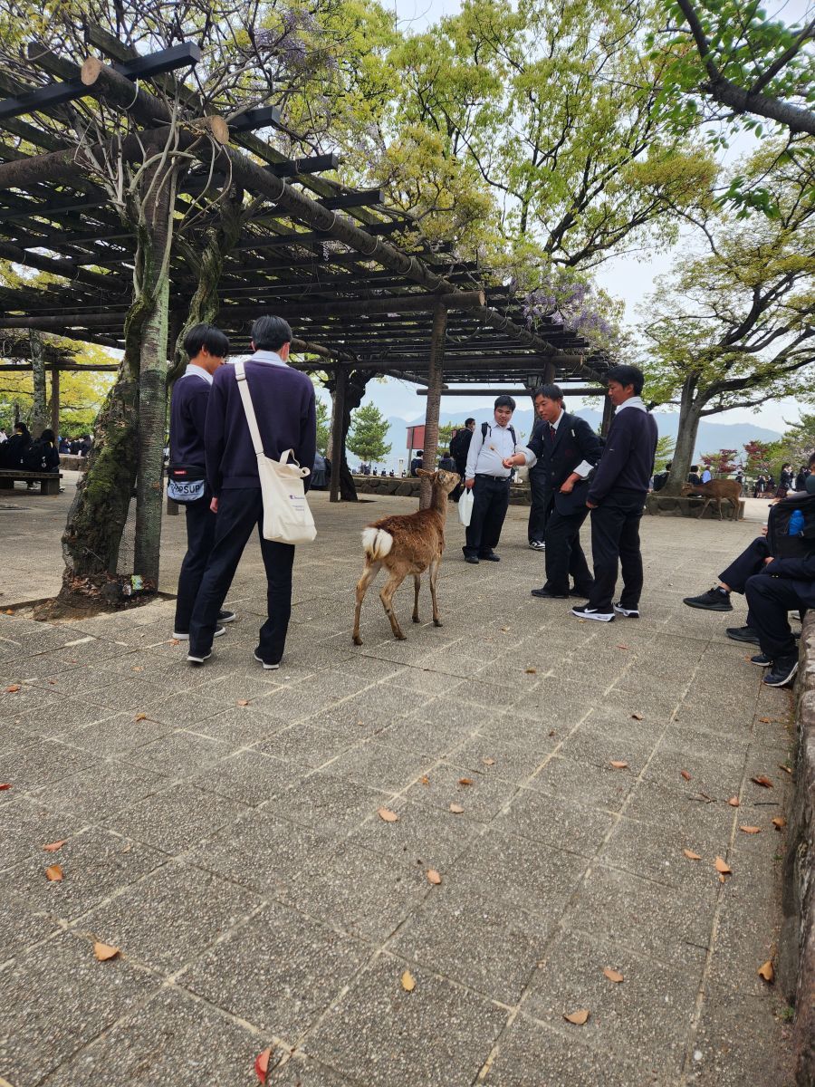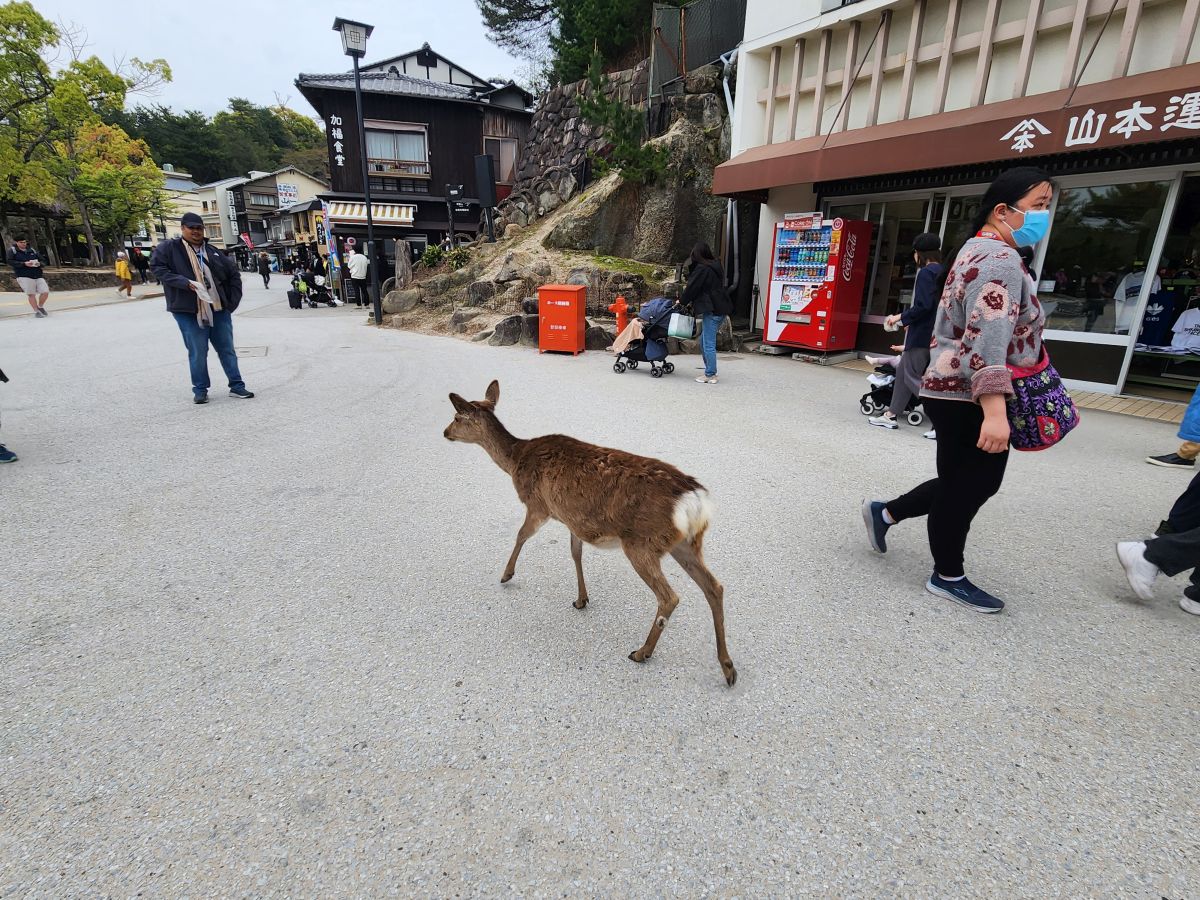 We disembark the ferry and wade through the crowds, the only excitement is watching the free roaming deer – Shikano – meander through the throngs. Sweet. But as Osamu reminds us – don’t touch! We don’t, but we can’t help touching the other tourists, not by choice. It’s just crazy packed. Enough that we put our masks on, and we usually don’t when we are outside. The joys of traveling in 2023. And the worst part us, this is where we are supposed to find lunch! In this mess? Plus, Hiroshima is known for its oysters, so we would love a roasted oyster lunch but we can’t see that happening.