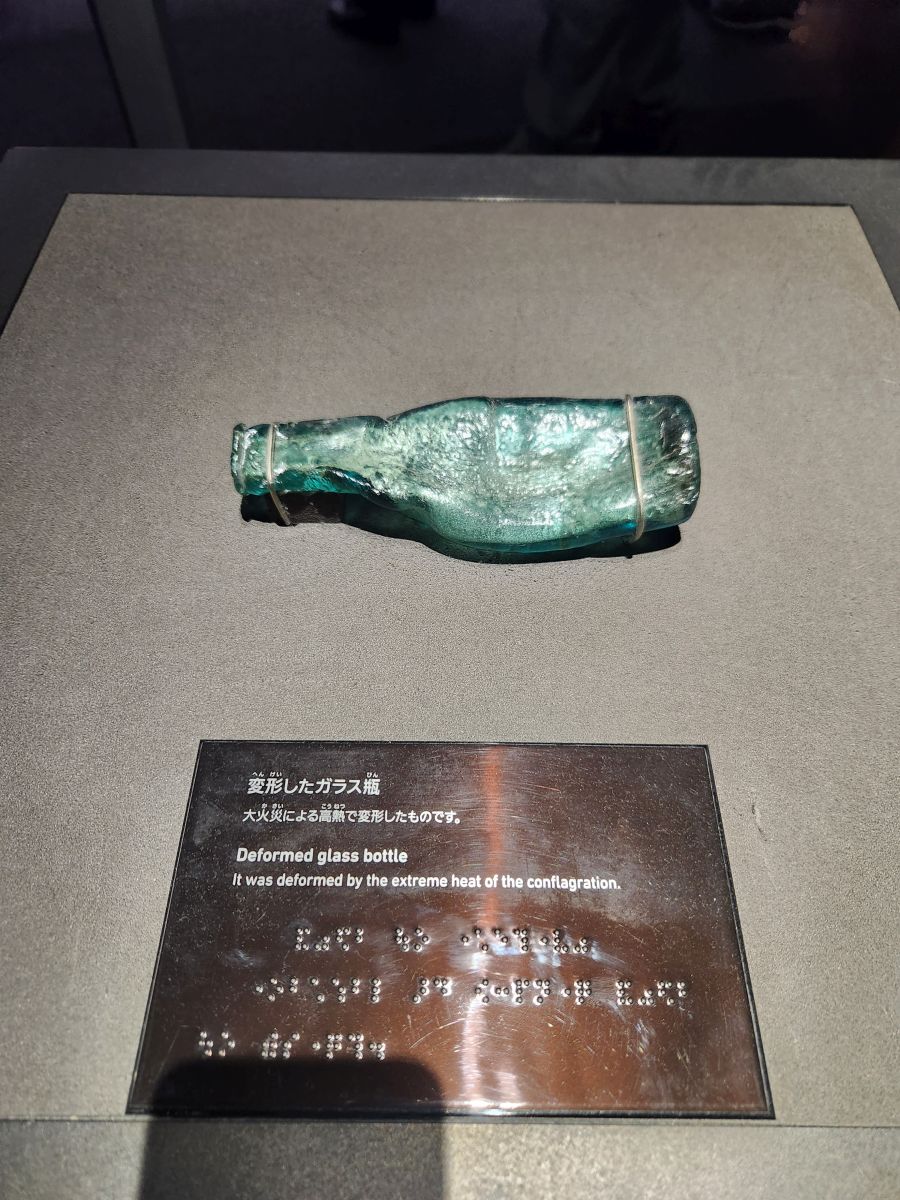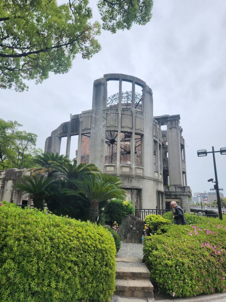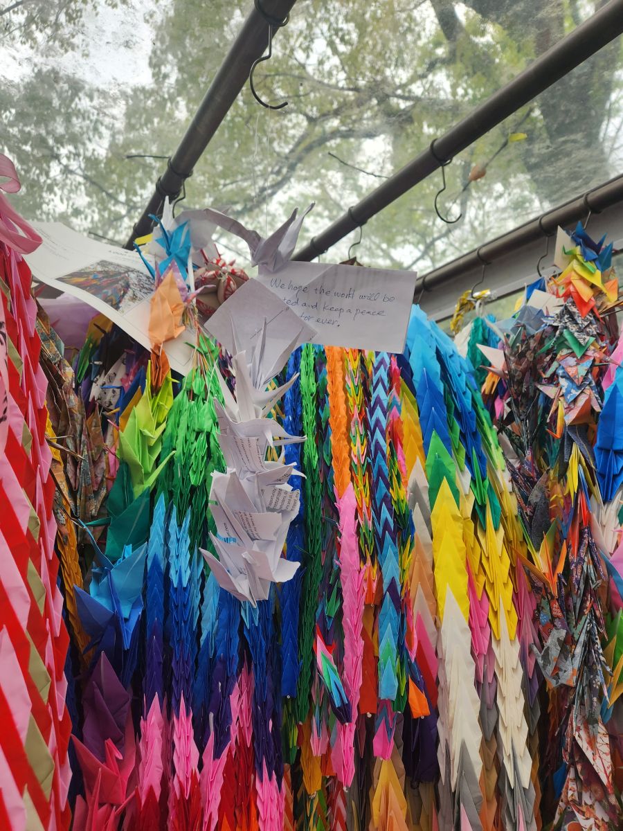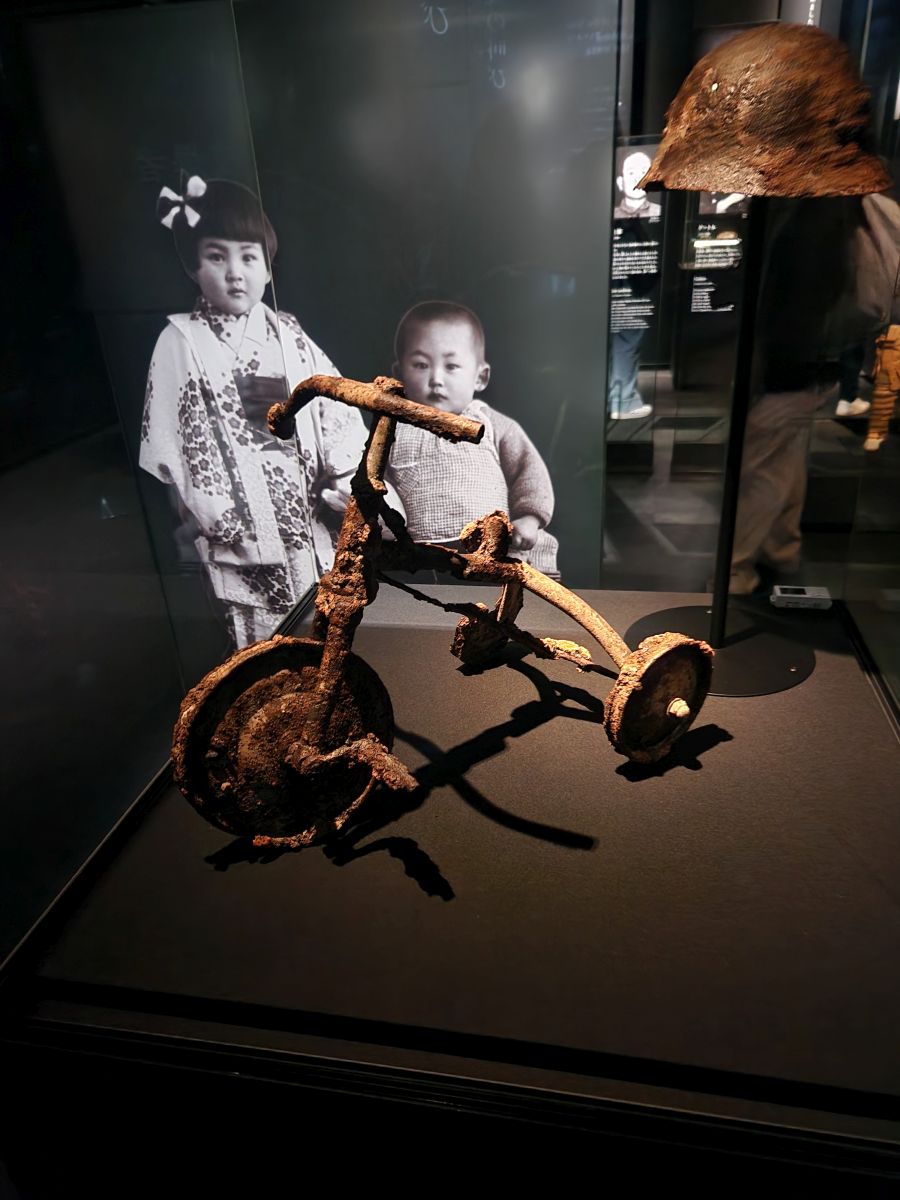 Then we are into the museum, which is probably a really great place to reflect upon the horrors of nuclear bombing and wars in general – but the reality of it is actually the horrors of overcrowding and over-touristing. Uncomfortably crowded. We do manage to take in a few exhibits – like the stones that have the “shadow of a human” on them – where someone must have been sitting or standing when the bomb exploded. And some terribly sad displays of destroyed children’s bikes, a lunch box and clothing, along with the stories of who they belonged to and how and why they are here in the museum.