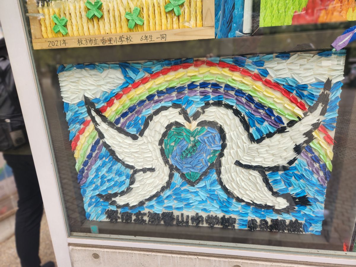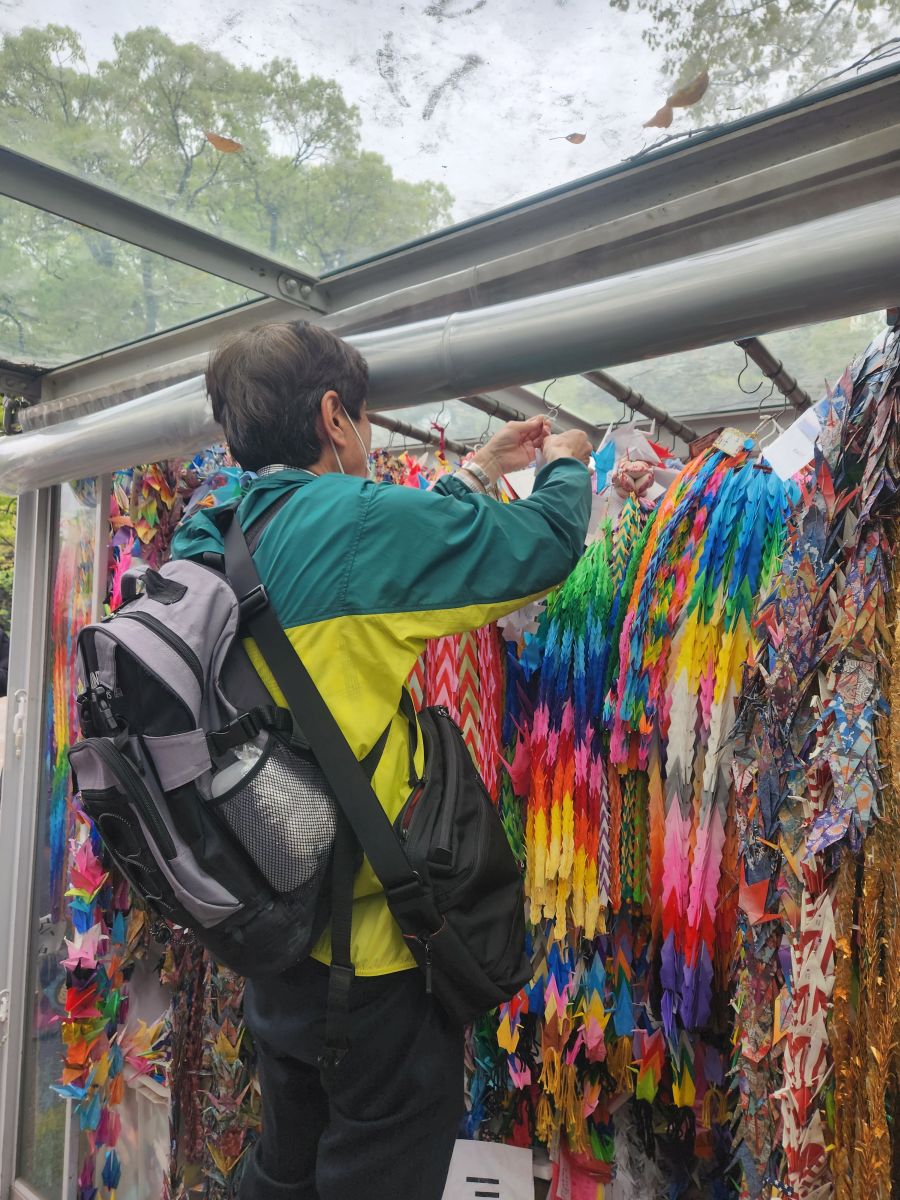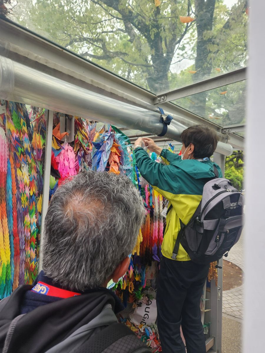 Moving on, we walk along the riverfront to the Children’s Peace Monument, for all the children killed by the bomb. Originally inspired by the death of Sadako Sasaki, a child who survived the bombing when she was age 2, but 10 years later was diagnosed with Leukemia and died, her classmates began to call for a monument to all the children who died due to the war. Thus, the beautifully sculpted monument we see here today. Behind the monument are kiosks filled with origami swans that people have made to pay homage to the event and send wishes for world peace. Some of these things are works of art! Just gorgeous. Our little swan hanging is nothing to compare, but it is the through matters, and Osamu hangs our offering in the middle of one of the kiosks (you’d be able to see it better if the idiot Arizona guy wasn’t standing right in the way of everyone seeing him hang our offering. Sigh).