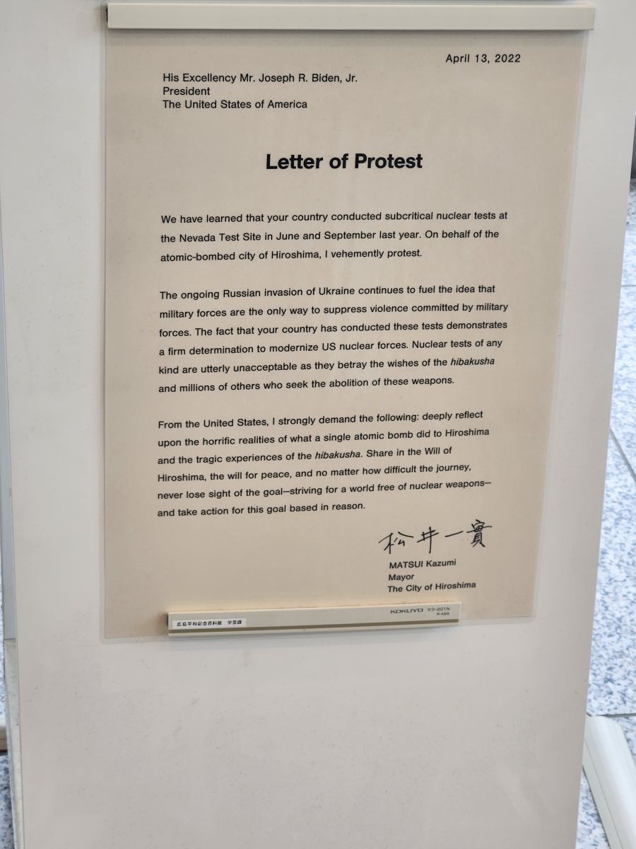 And then finally into the museum itself, with the Peace clock that counts the number of days since the first dropping of the A-bomb and the number of days since the last nuclear testing. There is also this really amazing letter from the Mayor of Hiroshima written to President Biden condemning the recent nuclear tests held in Nevada and demanding the US work harder on world peace. Pretty strong!
