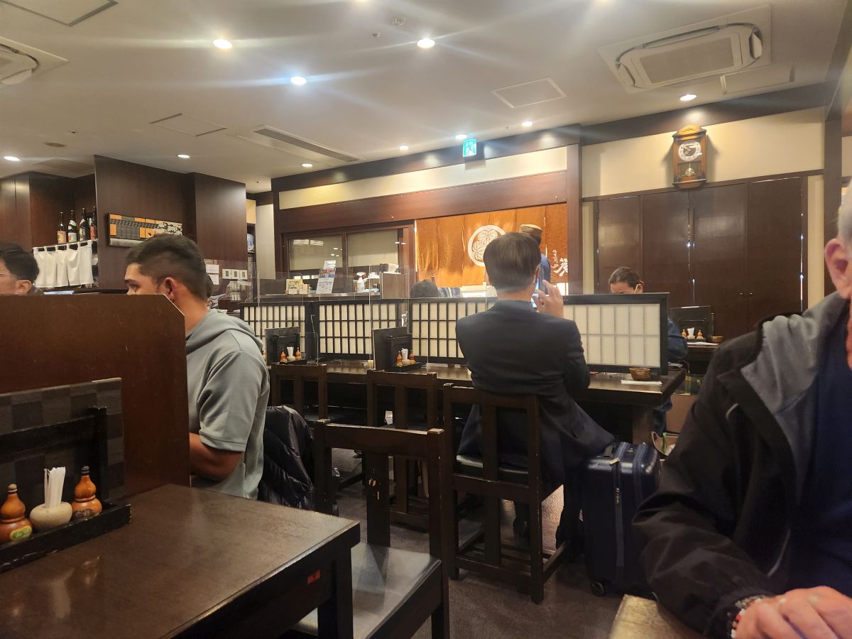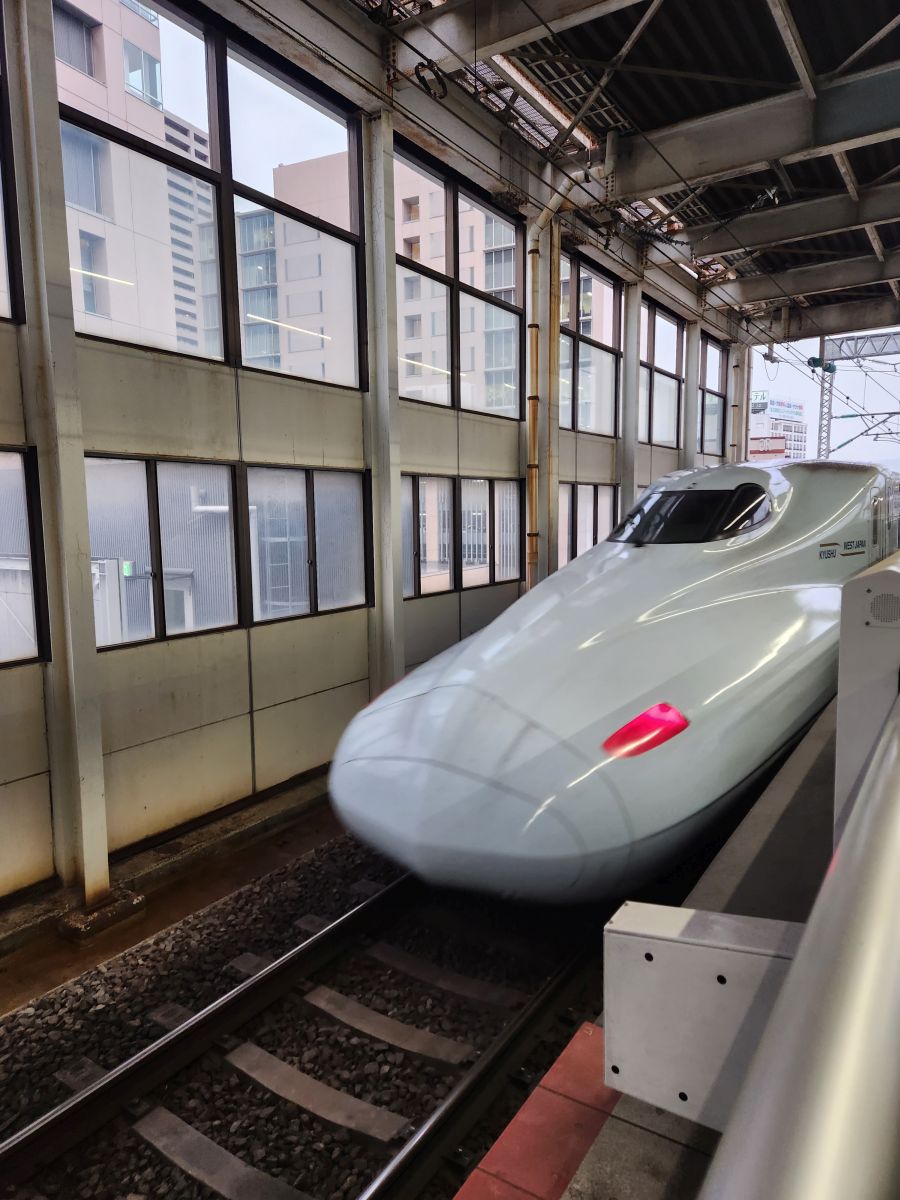 Everyone arrives on time – that’s one thing we definitely have going for us on this tour- at least they are punctual. We have our own private shuttle but we are totally packed in there like sardines. And of course there is only us and the young couple who have on masks. At the train station we watch the bullet trains come and go, then we all line up for our train car. Osamu tells us the seat rows and we are, of course, the first on to get seats on the 2 side. Success! Is anyone surprised? Thought not!