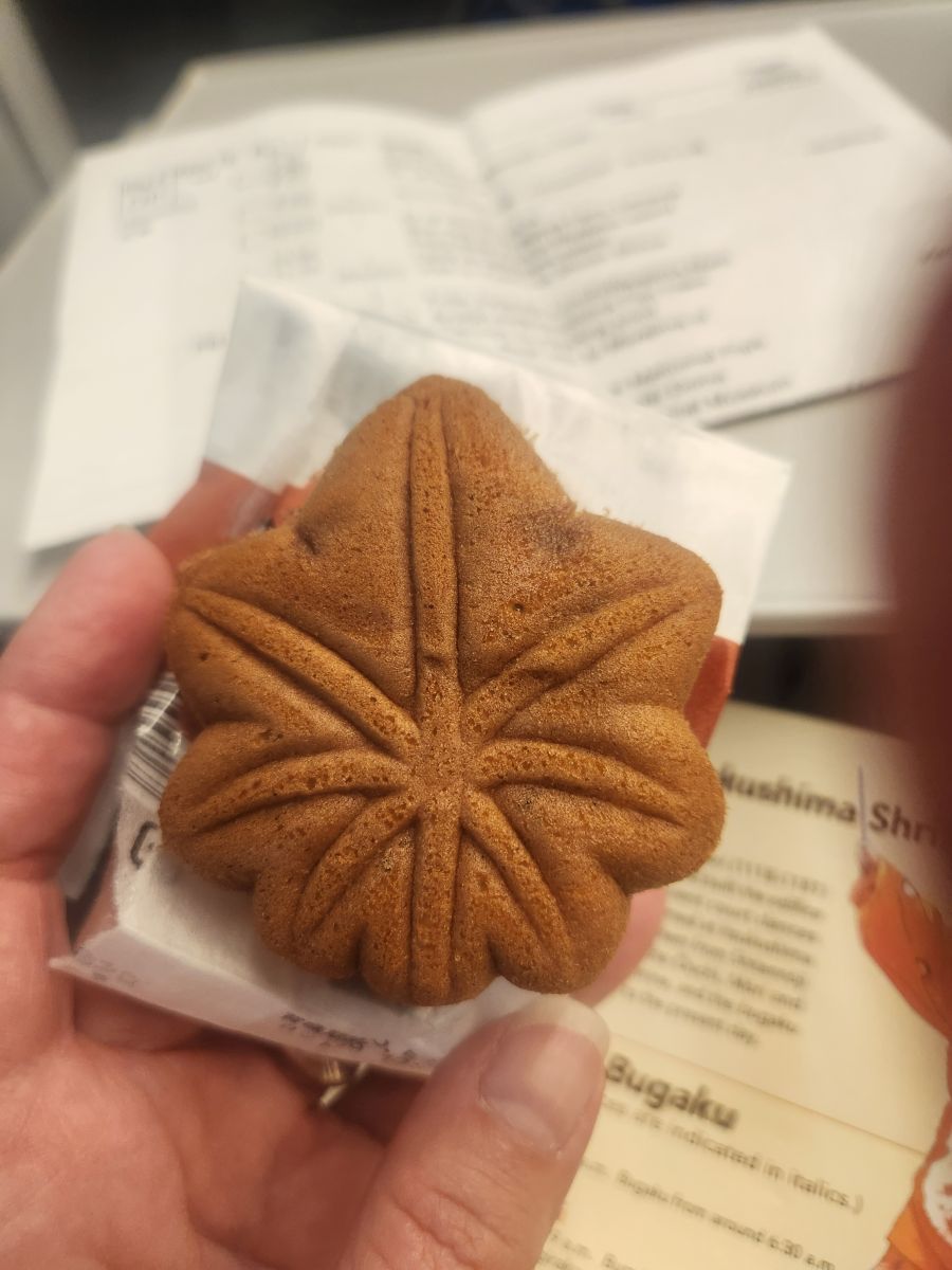 We manage to hang on to the entire group and hit the bus and the train station easily. We have 15 minutes before we need to go to the tracks, most of us taking the opportunity to hit the 7&I for snacks and beverages for our ride back to Kyoto. We grab 7&I beers! Wish our 7-11’s were this equipped! Plus some salty snacks and enjoy the ride back to Kyoto with that – as well as a little maple pancake cookie Osamu had bought us in Miyajima (they are famous for the maple trees and maple syrup, and this is a specialty of the area – filled with bean paste – and decidedly not tasty!).
