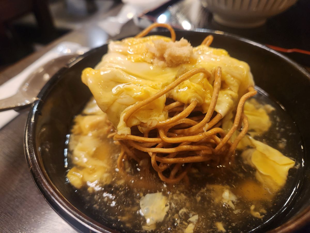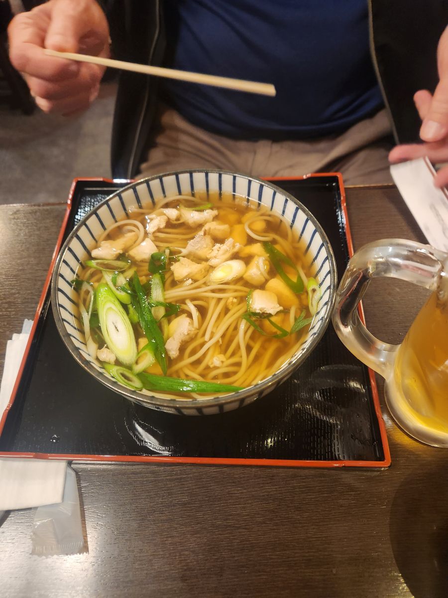 Arriving at the train station, we are finally released, having the rest of the evening to ourself. There is a 9:05 special shuttle just for Gate 1 back to the train station, but we’re not doing that. This morning was enough – we’re walking. It’s only 20 minutes and will give us some nice fresh air and a chance to stretch our legs. In the meantime though, we need dinner. We leave Osamu to walk the others around and wander through the restaurant area, finally settling on a place that had soba noodles. We order one regular soba noodle dish for Ed, but I experiment with Agesoba no Kieran – fried soba noodles topped with egg “dressed with a thick starchy sauce.” Okie dokie! And it is amazing – sort of like egg drop soup, but richer and thicker and oh, those fried noodles. Excellent adventure in eating!