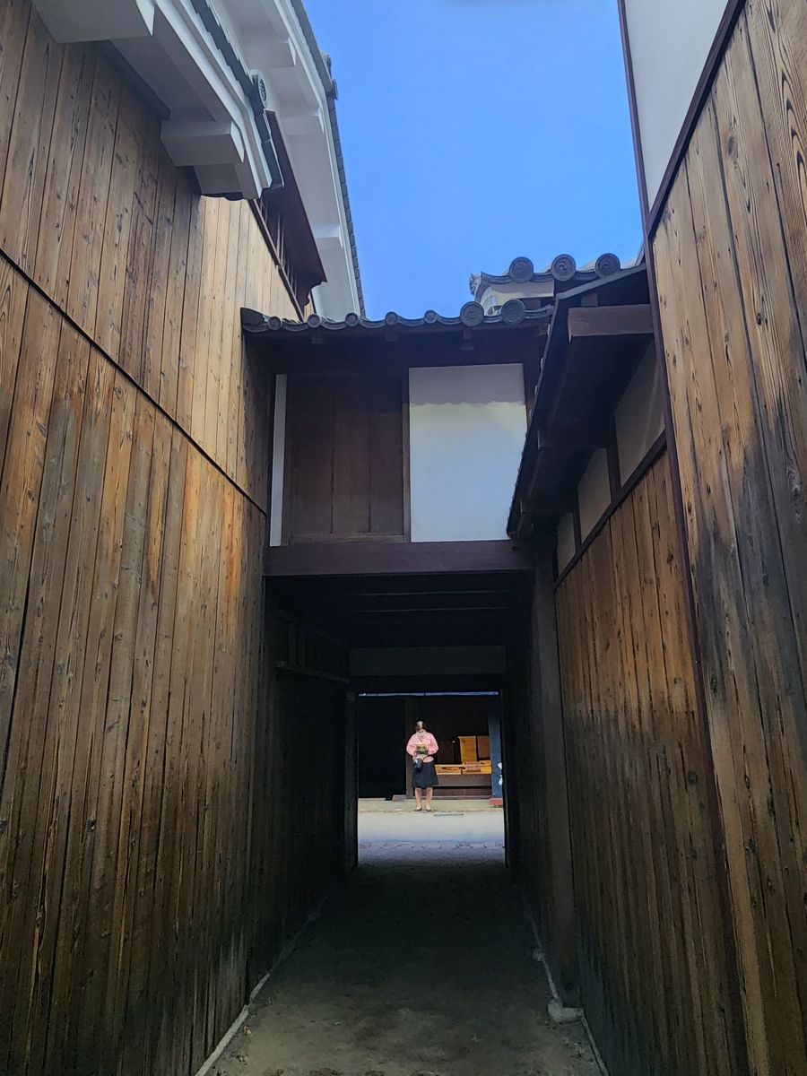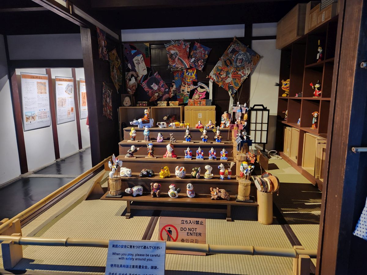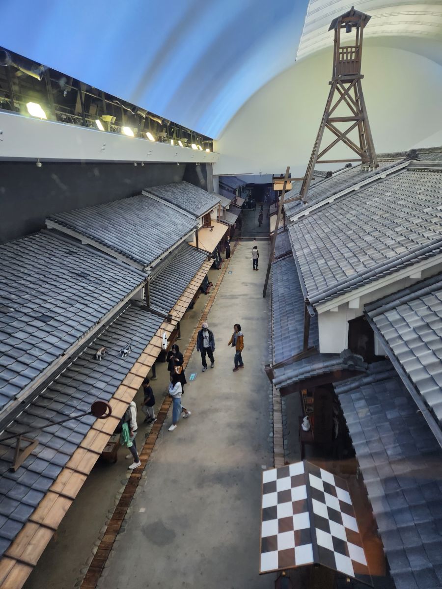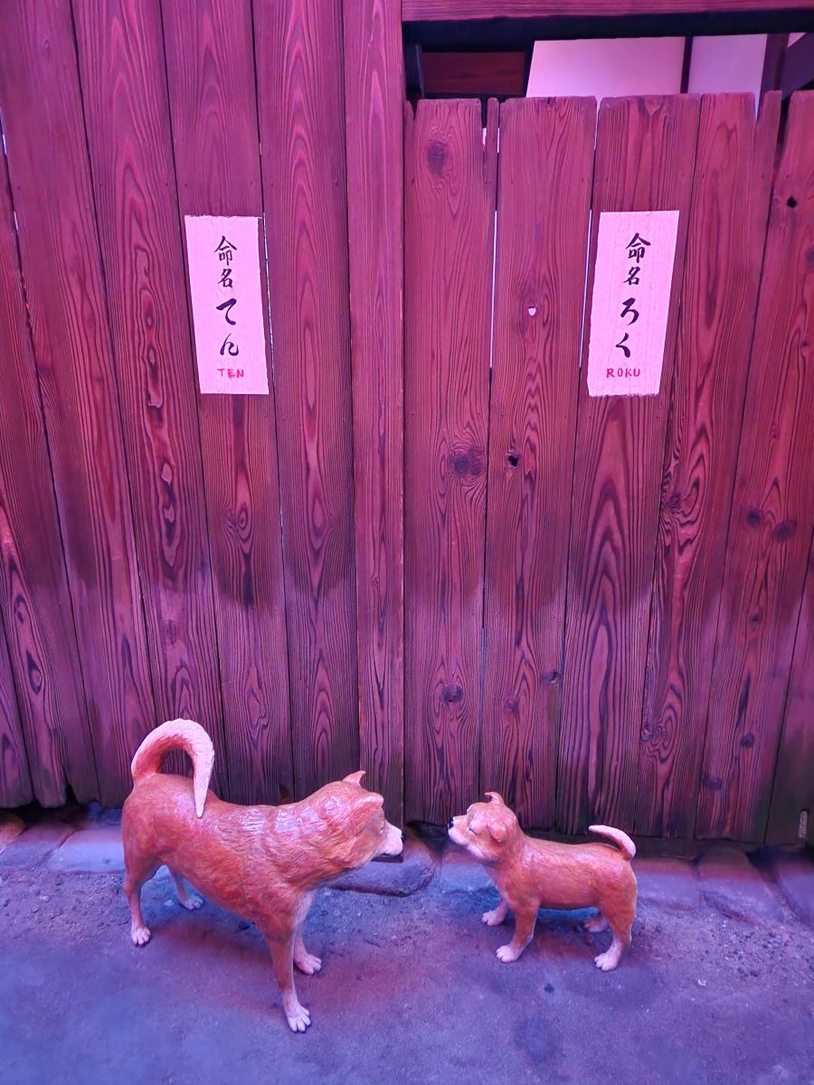 There was the Karamonoya store, for imported goods, the Fabric store, the pharmacy, book store, everything a village would need. You could walk inside all these shops, and we did – exploring all over, including through the back alley where the mascot dogs were standing – Ten and Roku, whose names have something to do with the name of the town (at least that’s what I remember from the audioguide). We really enjoyed learning about all the history and the different types of buildings – including the backstreet tenement houses – which the audioguide helpfully explained that even in those days the rich had gated communities (pretty funny actually!).