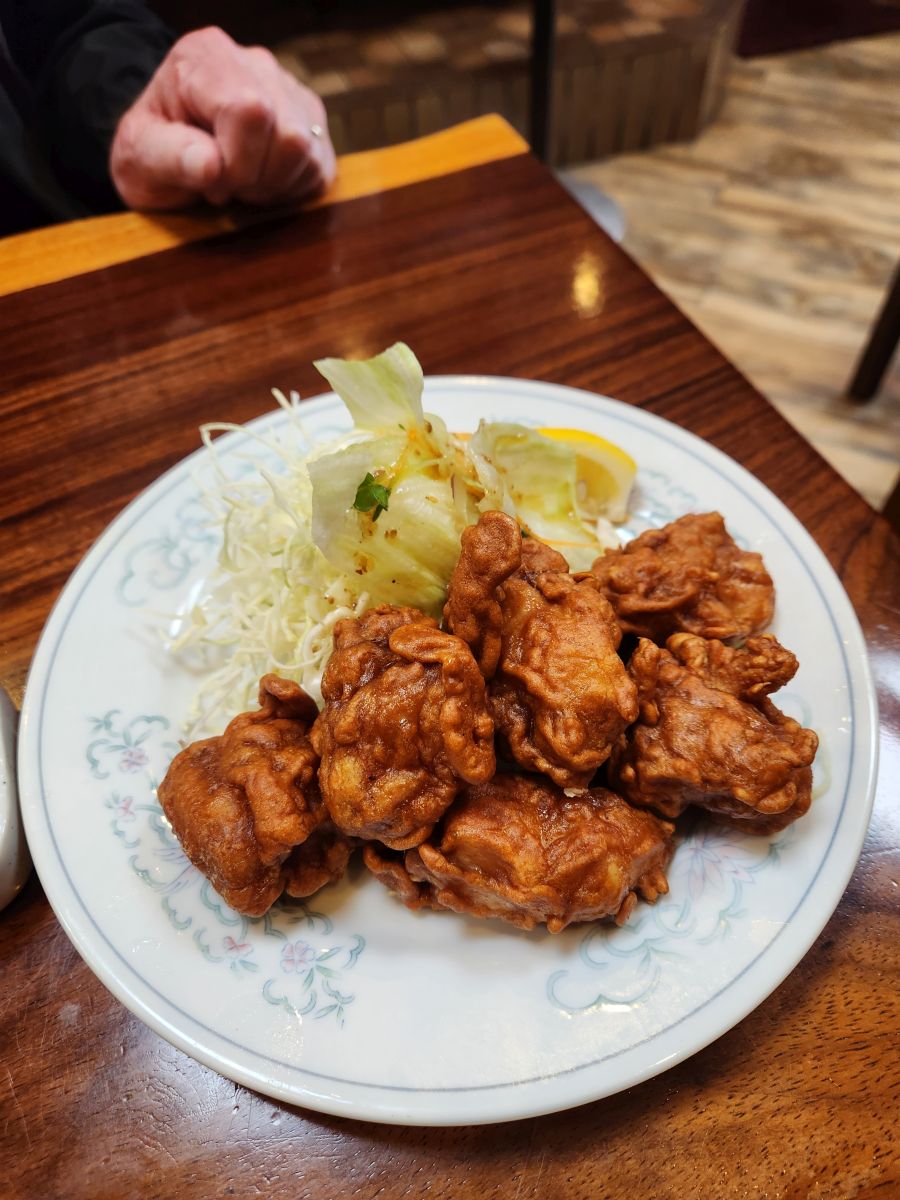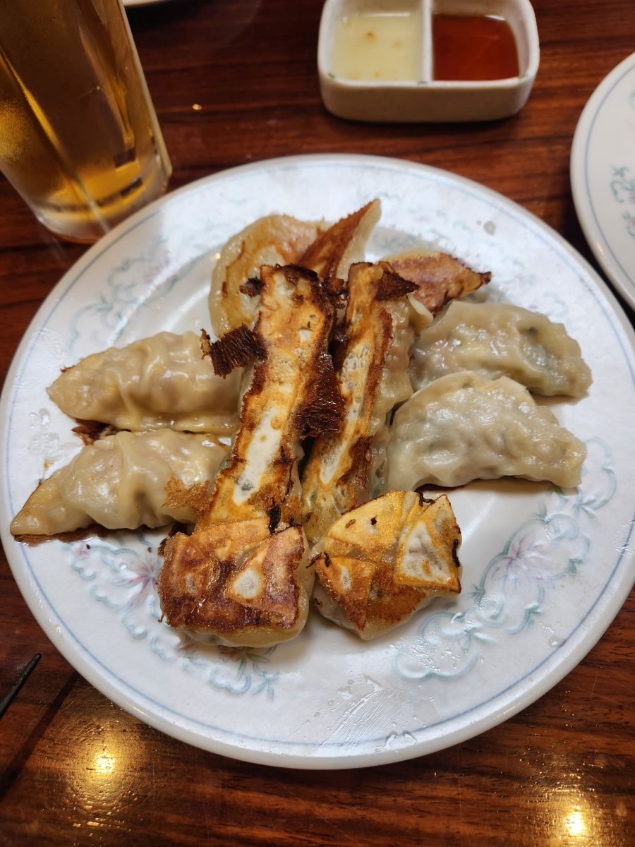 It is getting on time for lunch, so we walk through the local shopping arcade, Tenjinbashisuji, located right outside the museum, in search of lunch. This is supposed to be a more local shopping area, and it definitely doesn’t have that touristy vibe, with shops that sell more home goods and material and textiles and things. But restaurants? Oh, there are quite a few, and every one of them had lines – one place had this huge long line, so long in fact it wasn’t even at the front door of the restaurant! It started at the corner of a block and wrapped around the street – we couldn’t even figure out which restaurant they were waiting for! Okie dokie, this isn’t going to work! Once again, taking off out of the main street and onto a back street we found an excellent little Chinese mom and pop restaurant (literally mom out front, pop cooking) and had a fantastic meal of an assortment of excellent gyozas and, yes, Karaage! We love this fried chicken! Nice, unrushed, uncrowded, and best of all, dirt cheap. Win, win, win.