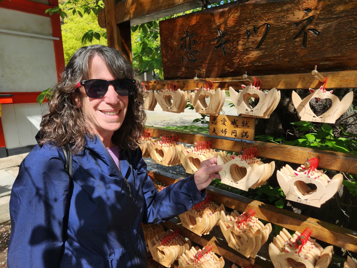 Probably one of the best things about this place though, is that you could buy a votive, which is actually a piece of wood cut into a shape reflecting the shrine and write out your wishes. In this case, the votive is 2 foxes cheek to cheek and is for maintaining a strong love relationship. Well, you know we had to do that! Perfect for us!