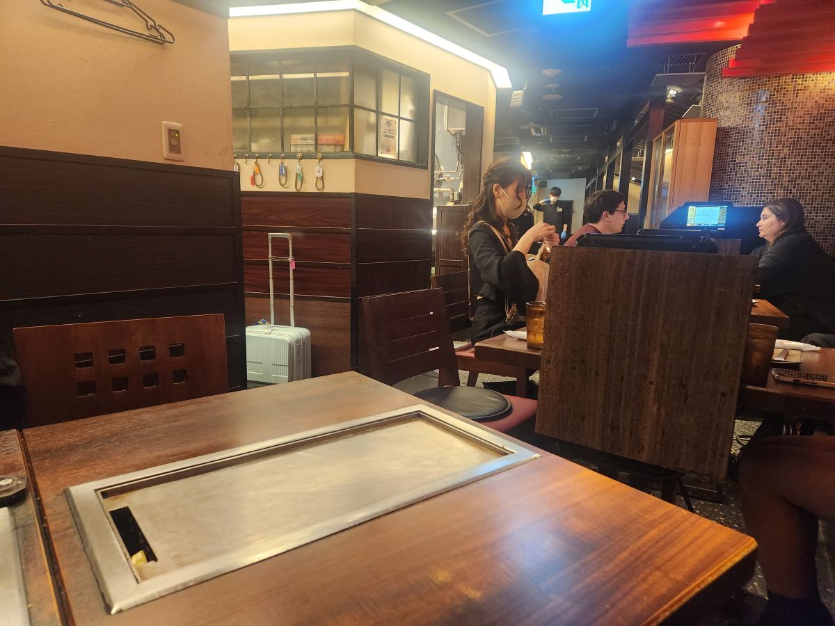 The hostess comes back with her order pad, and we realize this line might be only for takeout! We mime going into the restaurant and end up, once again at a perfect table in the corner. But this table has a little grill built into it, that is on. Hmmmm….curious.