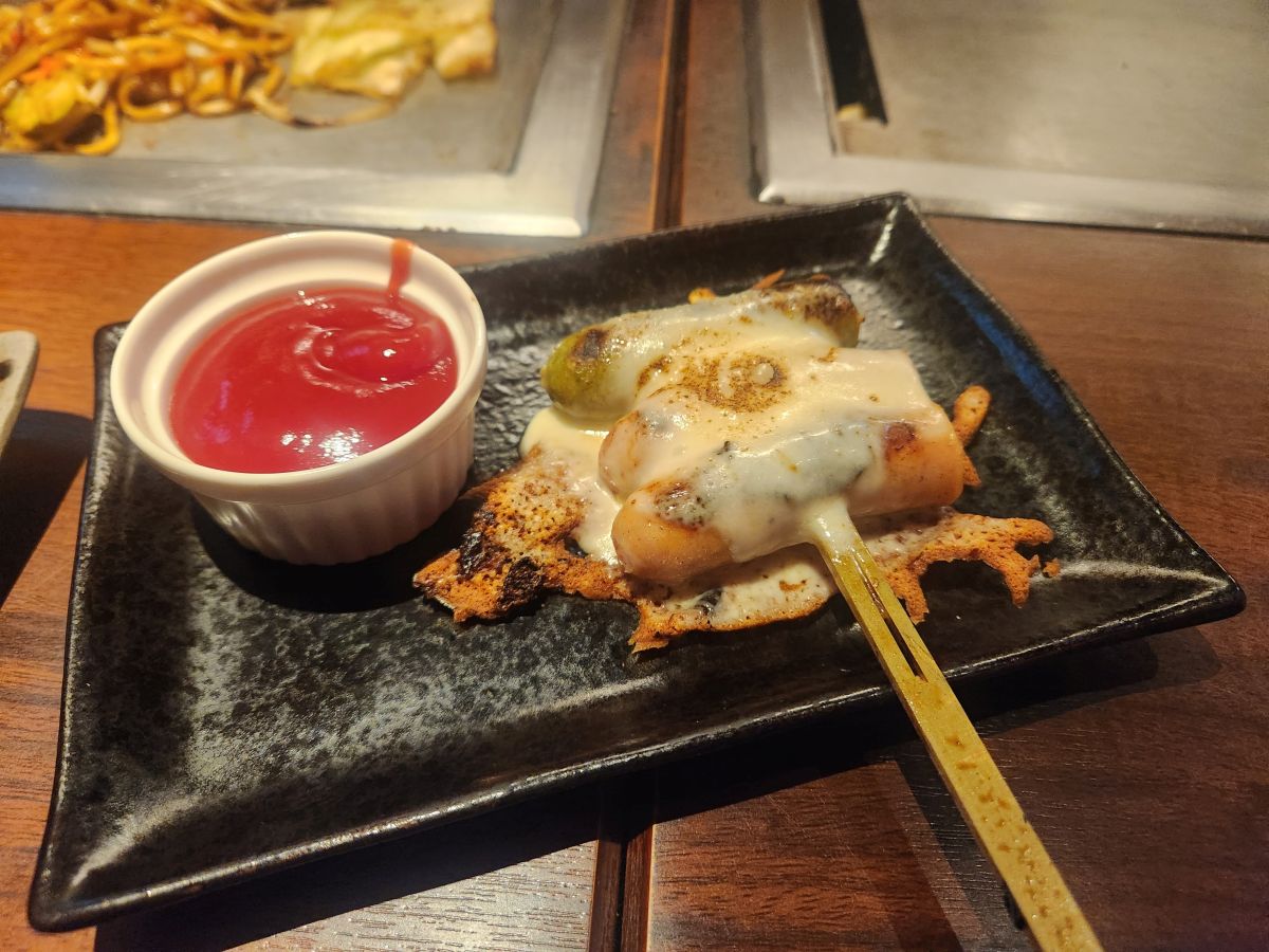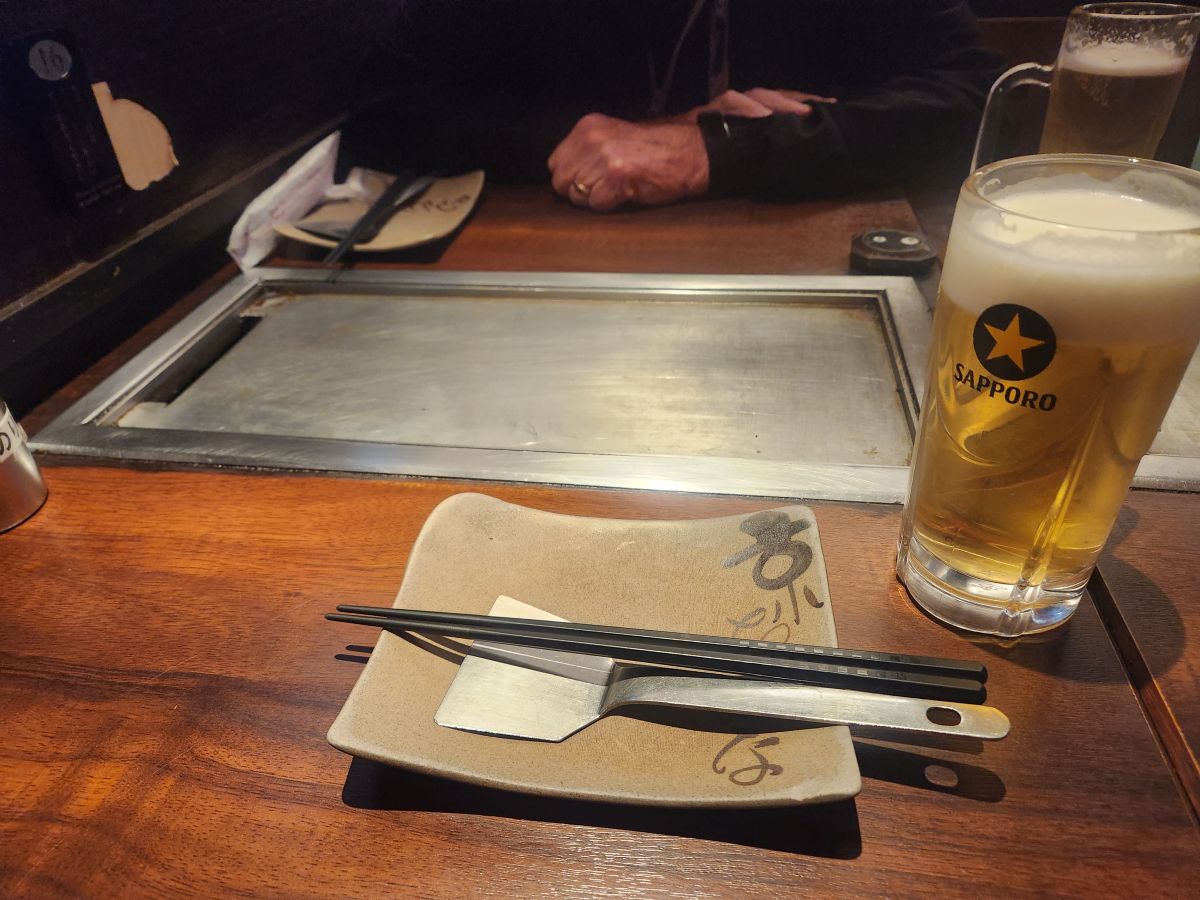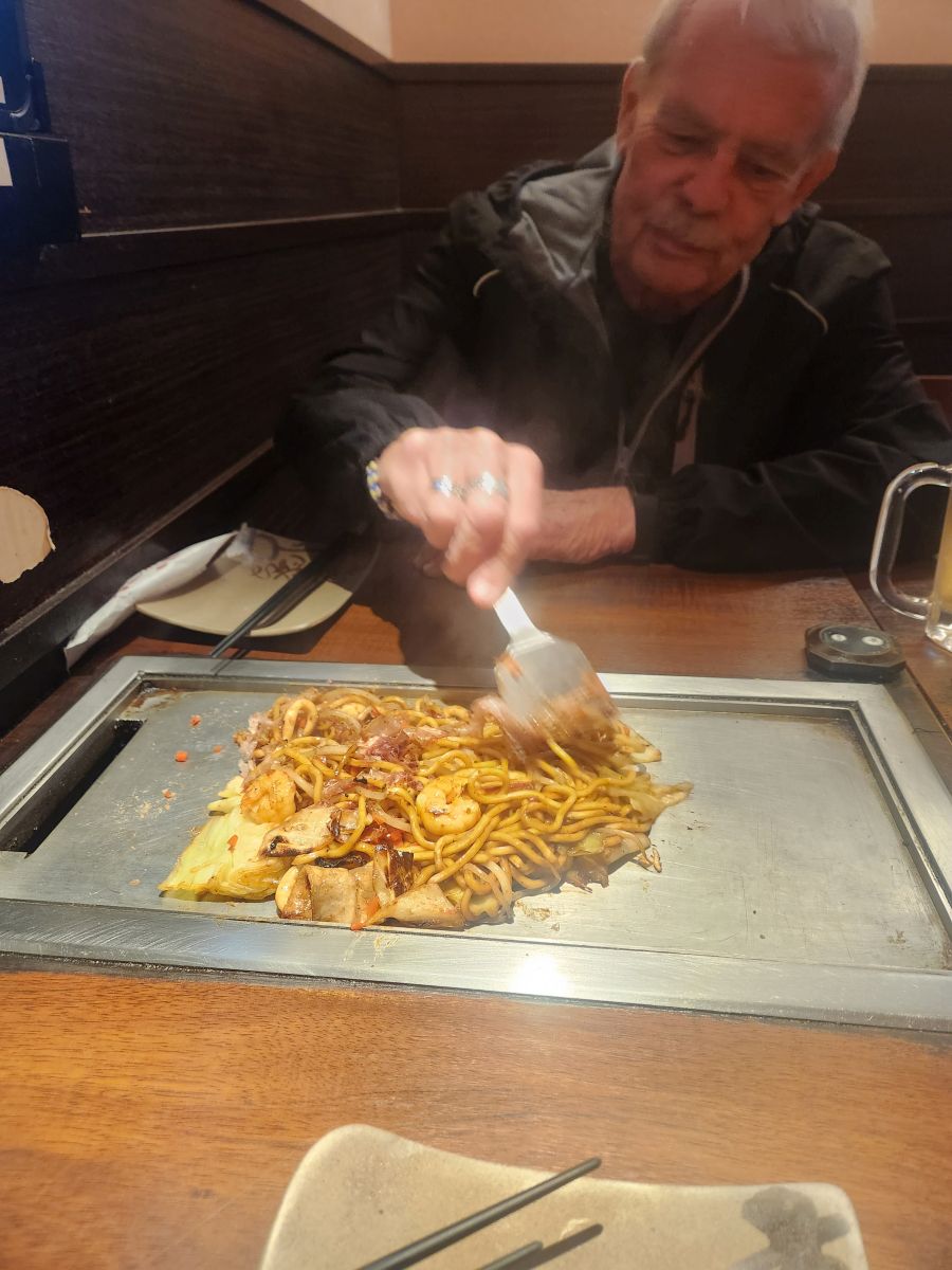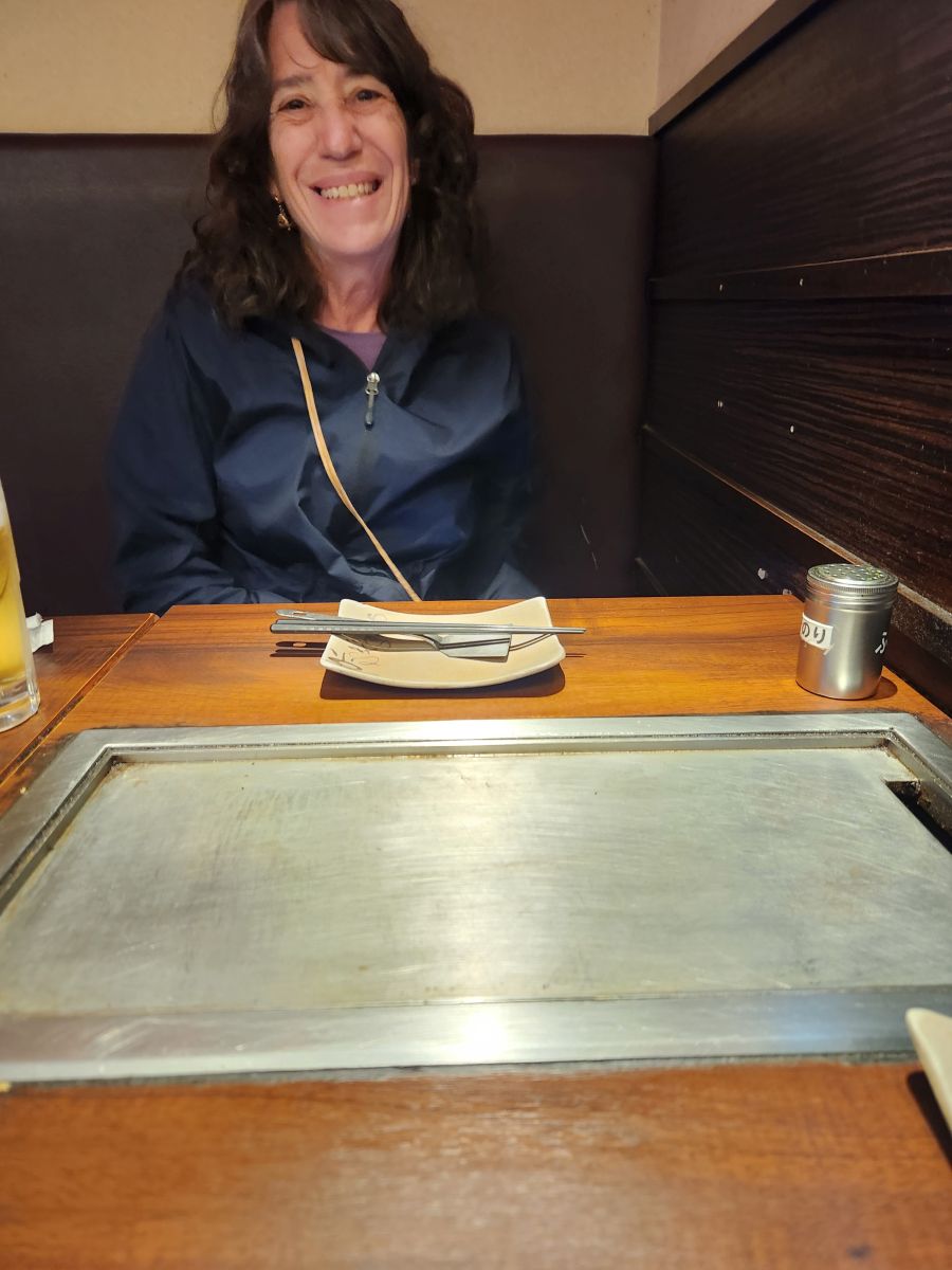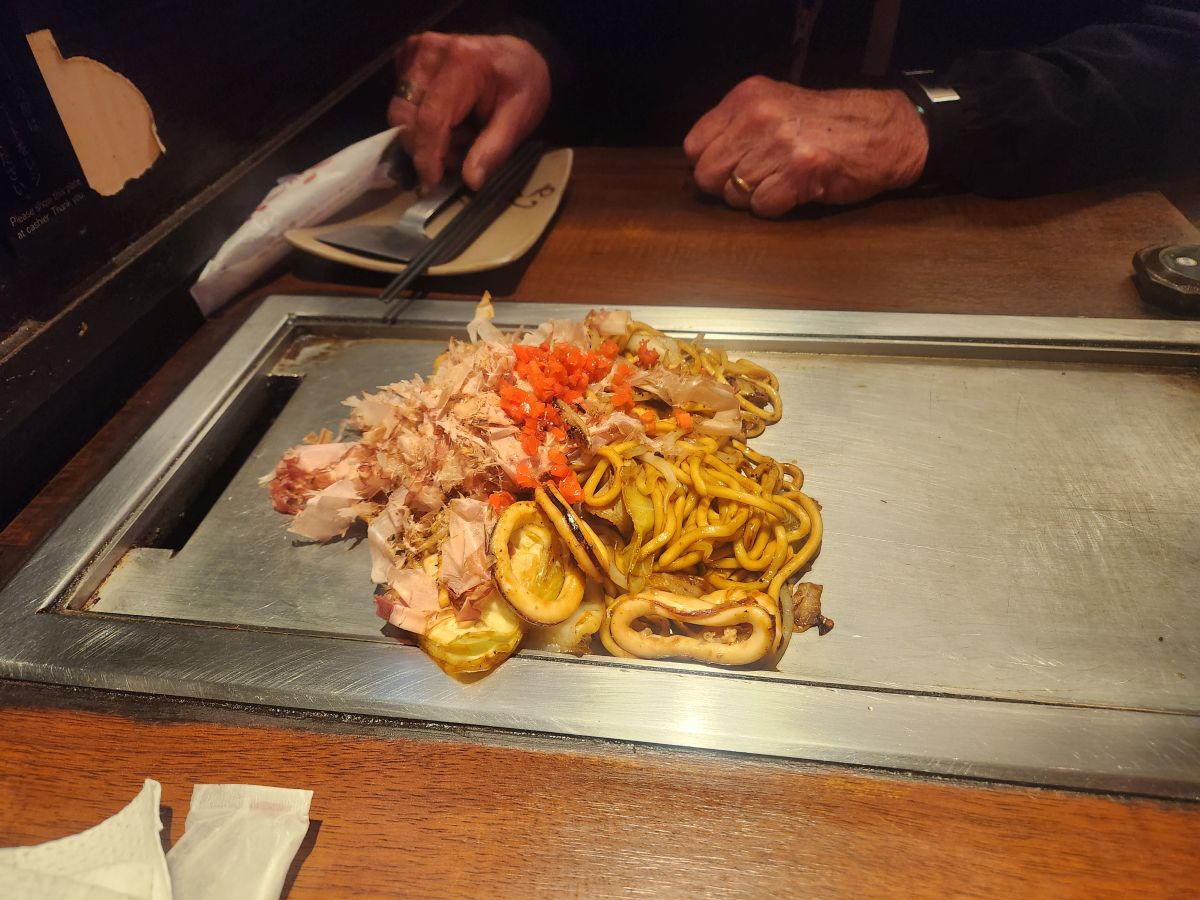 We order on the tablet again – we’re getting to be experts at this – getting beer, of course, one mixed Okonomiyaki, one Yakisoba and a little assortment of sausage skewers. Fun! But, oh, so much more fun when the food comes! They bring out the yakisoba first, and essentially scrape it all onto the hot plate grill in front of us. So we get to basically heat up the dish and serve it from the grill. Fab! And it is excellent – with seafood and great spices and tastes. Same with the Okonomiyaki, again, excellent. We are both in heaven. The little sausages come on their own plate, and Ed enjoys them – I’m too full to even try!