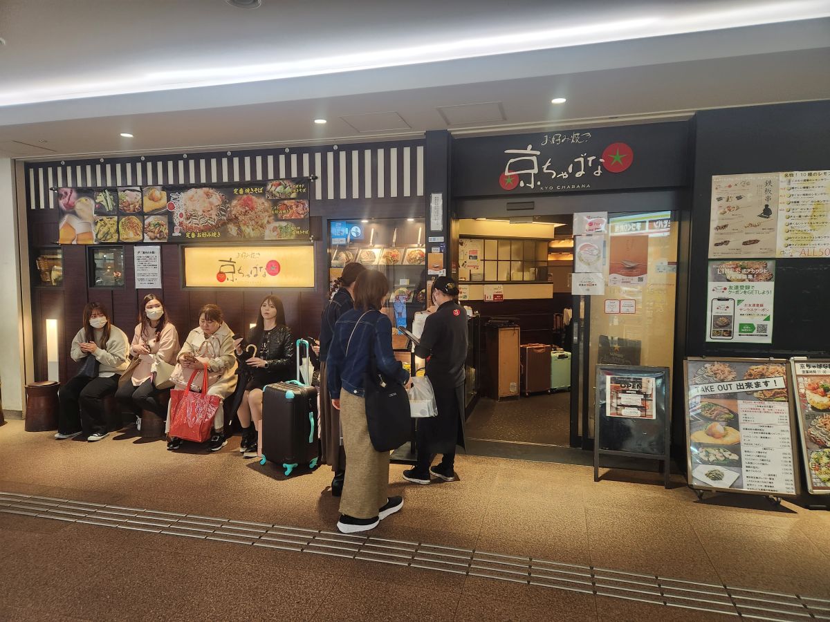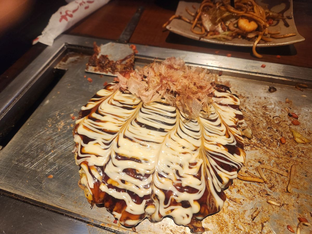 So at dinner time, we march back to the train station to the little restaurant we saw last night with the line out front. We figure we’ve got all the time in the world, so if there is a line, we’ll just wait. And there is. At least 4 people sitting on the little chairs out front. I sign up for a table (I think), the hostess gives us a menu and we preview our meal. It’s Okonomiyaki heaven!
