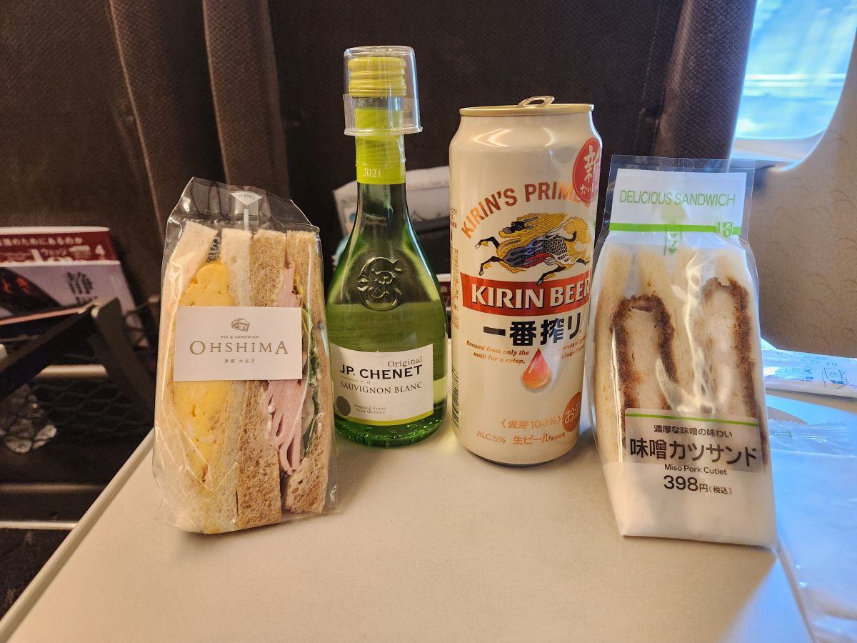 After our reconnaissance, we start thinking about lunch. The train arrives in Tokyo at 12:45 which is too late for lunch for us – so we peruse our options and end up with a couple of sandwiches (Pork Katsuo with miso, a ham sandwich and a weird egg sandwich) plus a big beer and a bottle of wine, that comes complete with a little plastic glass! These Japanese think of everything!