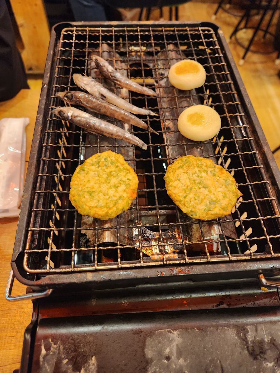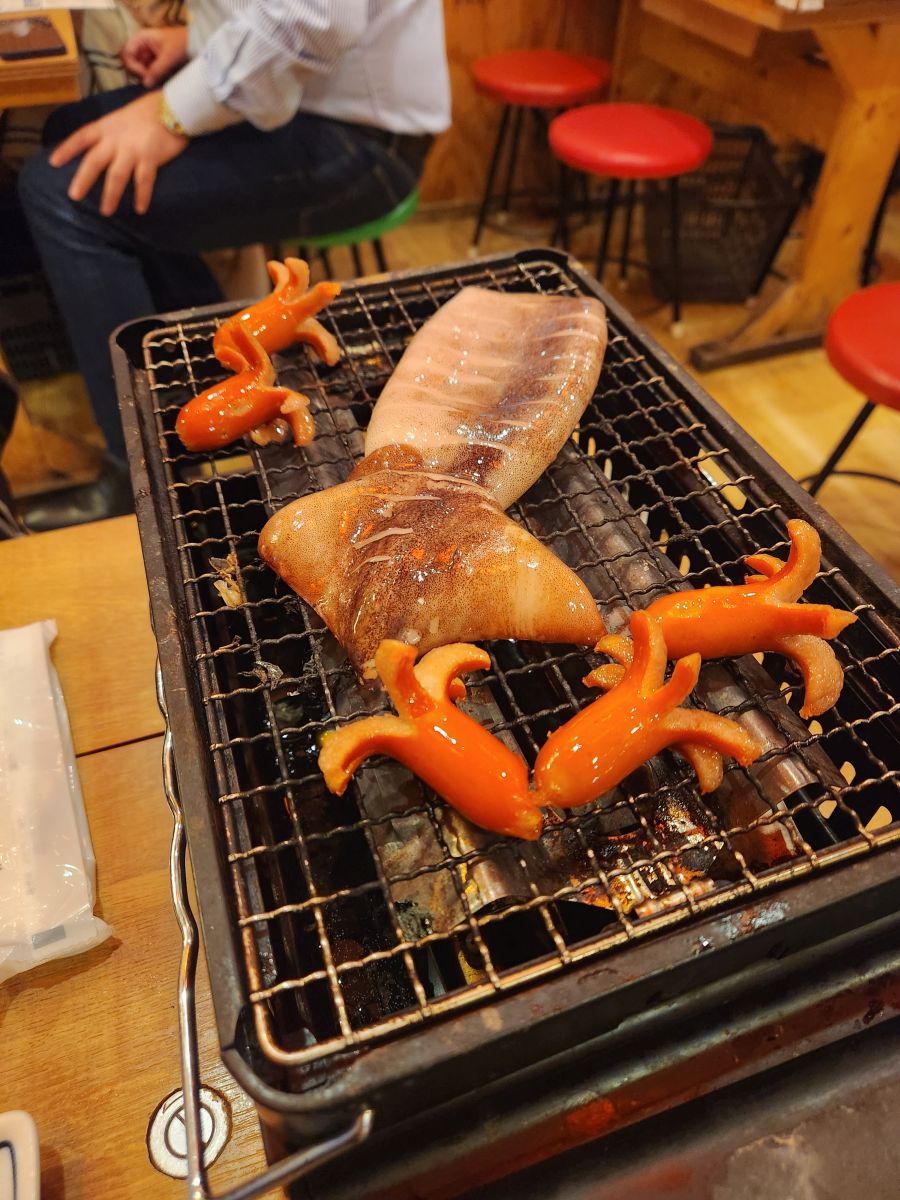 This place is teeny though, there are maybe only 10 tables, and once again we’re escorted to a corner table and shown the tablet – only this one works, and we can choose our language – and we’re off to the races. We get the sushi assortment, which is bigger and more expensive than the one in Osaka, we’re figuring because it is dinner maybe? We also order these great little sausages and the squid again (hey, why mess with a good thing?). As we are enjoying our drinks, the waiter brings by a plate of sardines, little patty looking things and bun type objects. Um, we didn’t order this? He explains it is Japanese appetizers. Okaaaay. Oh well, nothing ventured, nothing gained. If we’re charged, we’re charged. It’s our last night in Tokyo – we’ll go out with a bang! Figuring we’re at a BBQ joint, we better grill all this – because, with no instructions, we’re going with our gut! So grill we do – all by ourselves because this guy doesn’t have time to help – and we think our waitress in Osaka was used to tourists and just did the cooking for us assuming we’d be clueless!