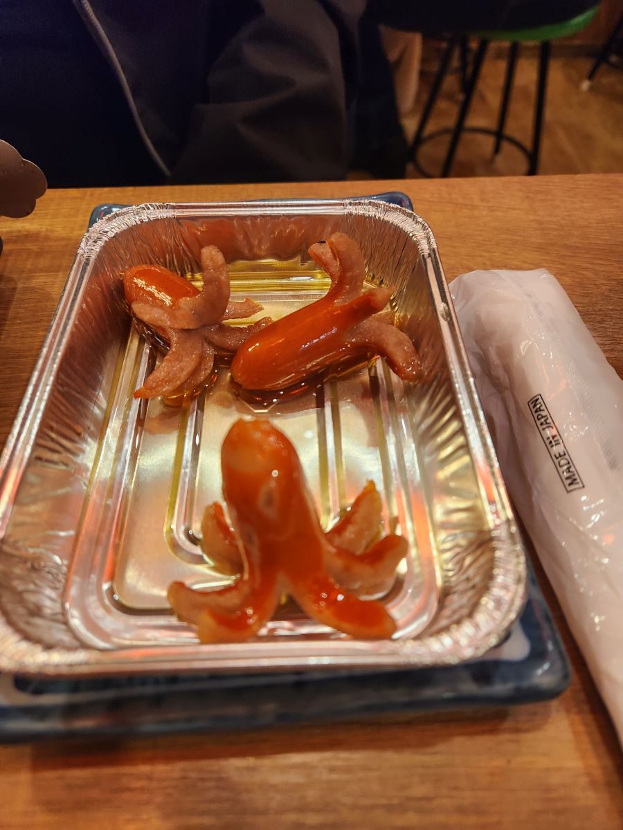 At any rate, we munch on these very good crab or shrimp or some sort of cakes and the equally good little white buns with some sort of cheese or sauce filling. We even eat the sardines, bones, heads, eyeballs and all. They aren’t too bad – if you don’t think about it! Next comes the cute little sausages that look like little octopus, served in a tin foil tray and the squid. We pop all onto the grill and start our BBQ. Ed mimics how the waitress the other day grilled the squid, by holding it up and letting the liquid drain out, then he cuts it up into rings and it ends up perfectly done. It is one of the most tender, tastiest squid we’ve had. The sausages are great too – especially as their little “legs” get charred and sort of crispy (of course another couple gets the sausages too, and they leave them in the tinfoil tray and put the whole thing on the grill….so….we may have done it wrong – but it was oh so good!).