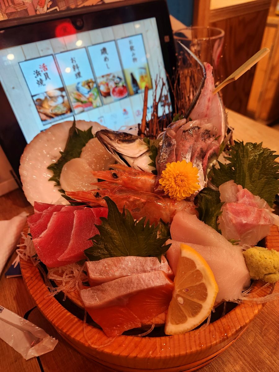 The main event is the sashimi, though. It is a HUGE tray of fish, 6 different kinds, including a newly flayed fish. I have the video! That thing was still moving – when you watch the video, that isn’t my hand shaking, that is the fish in its last death throes! OMG. But, hey, when in Japan….and it was some of the best fish ever!