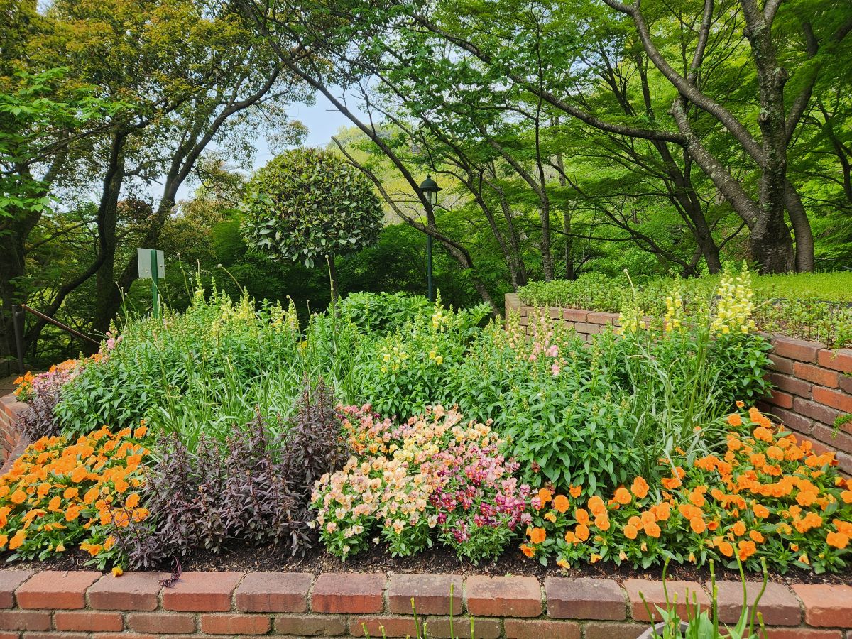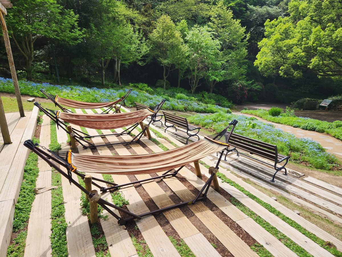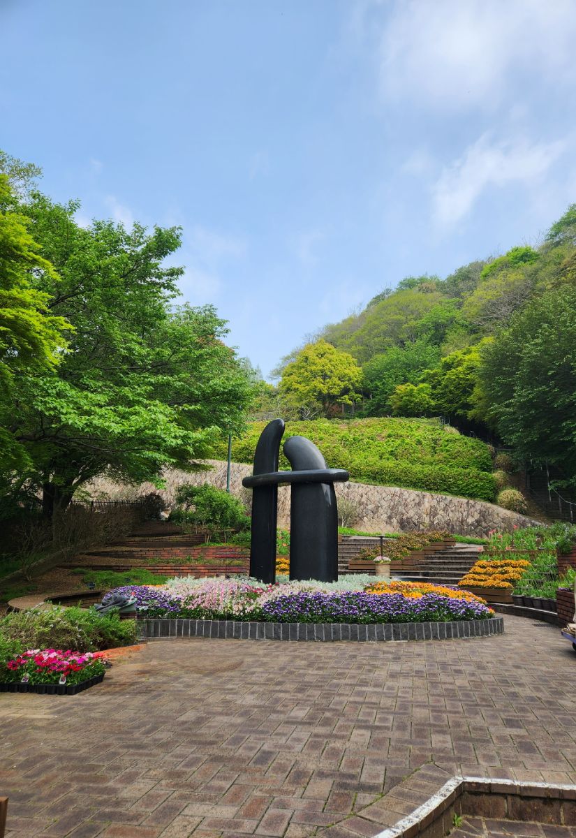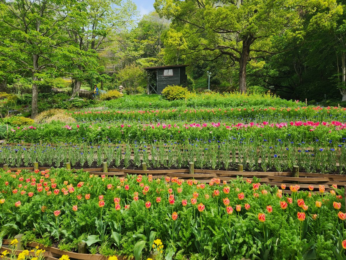The final section of gardens are terraced beds full of tulips and other freshly planted bulb flowers, then a section of rhodies and little rest areas full of hammocks. A totally lovely way to spend an hour or so on this beautiful day in Kobe. We are so glad we did this tour today and not the last time we were in Osaka. It would be miserable in the rain!