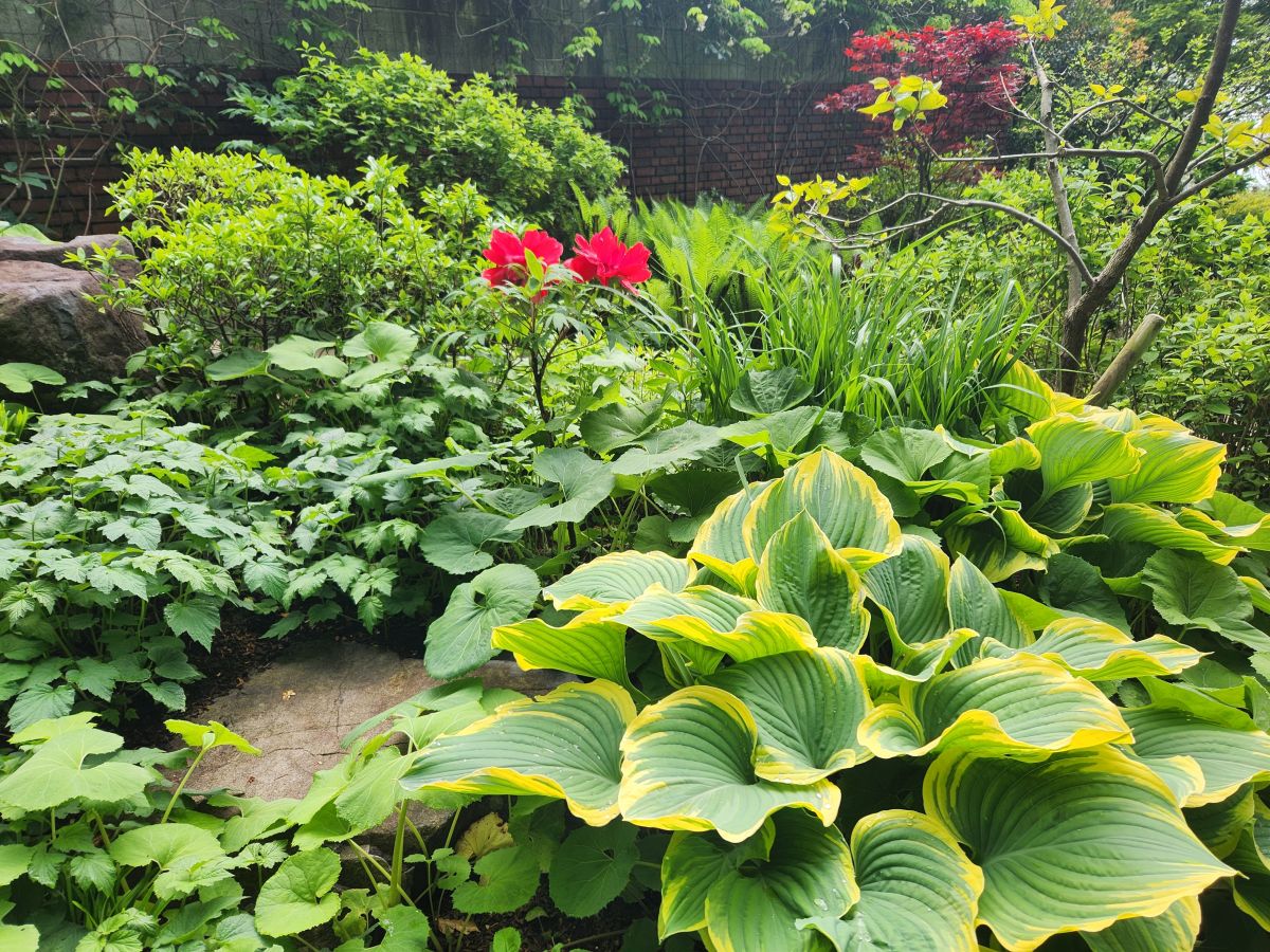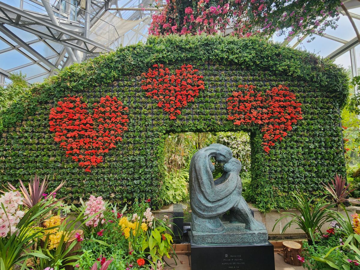Continuing down the trail, approaching the glasshouse (i.e., hot house), there is a lovely garden filled with newly planted spring flowers and an equally lovely marble sculpture. The glasshouse contains more gorgeous flowers and trees – of the more tropical variety – such as ferns, banana trees and orchids. There is also a fabulous wall of little herbaceous plants, interspersed with red flowers in the shape of hearts. It is beautiful – and I use it to be an Insta-whore, posting that photo with the hashtag of the garden to get a “gift” on the way out. Hey, what can I say?