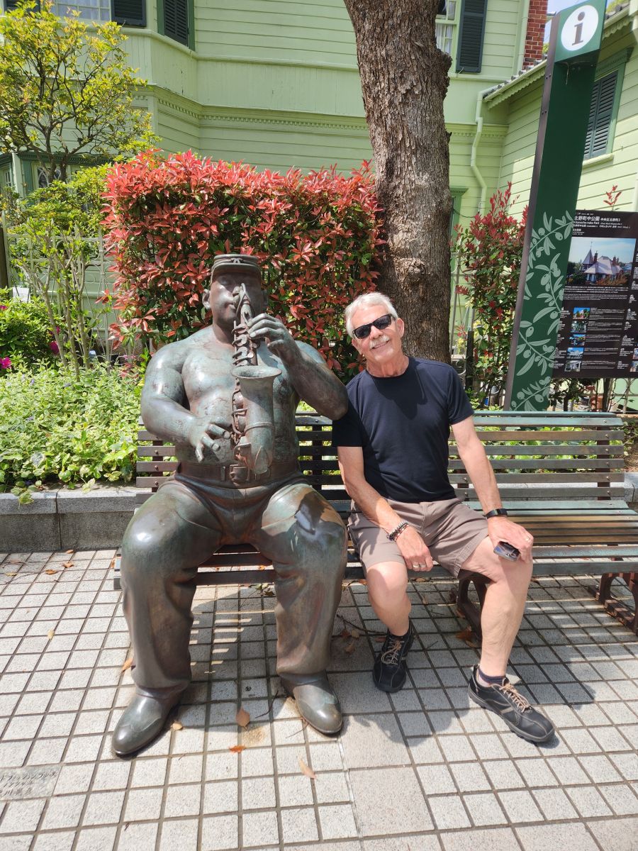 We finished our tour of the seafront at the Kobe Maritime museum – which was also surprisingly good and interesting. Sponsored by Kawasaki, the museum had tons of model boats – of all sizes – depicting the ships that frequented the Port of Kobe, plus lots of historical displays and current day ships – both cruise ships and freighters. They also had a ship handling simulator which we knew better than to try! And a 3D Sea photo spot which I didn’t get at the time – but looking at the resulting photo, I guess I can see what they were getting after. Maybe?