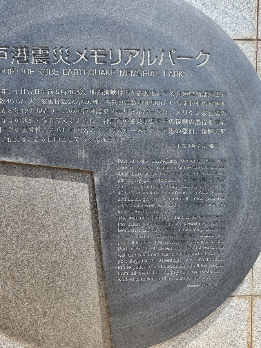 On the waterfront, we visited the earthquake memorial, dedicated to the 1995 Hansin-Awaji earthquake that so devastated this area. It is a fascinating, in an awful way, memorial exhibit – with part of the original destroyed dock preserved to visually show the damage, photos of the pier and pier buildings, as well as a video on the destruction which was mindboggling.