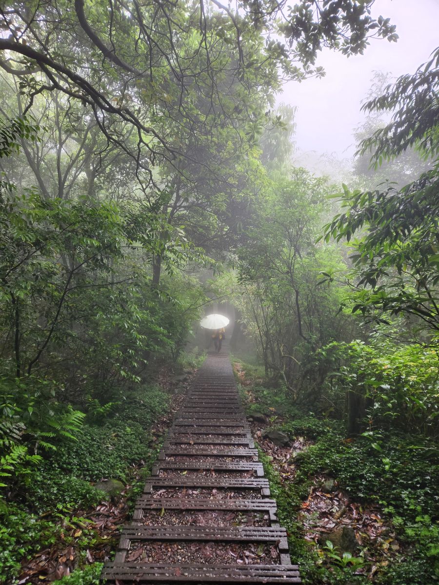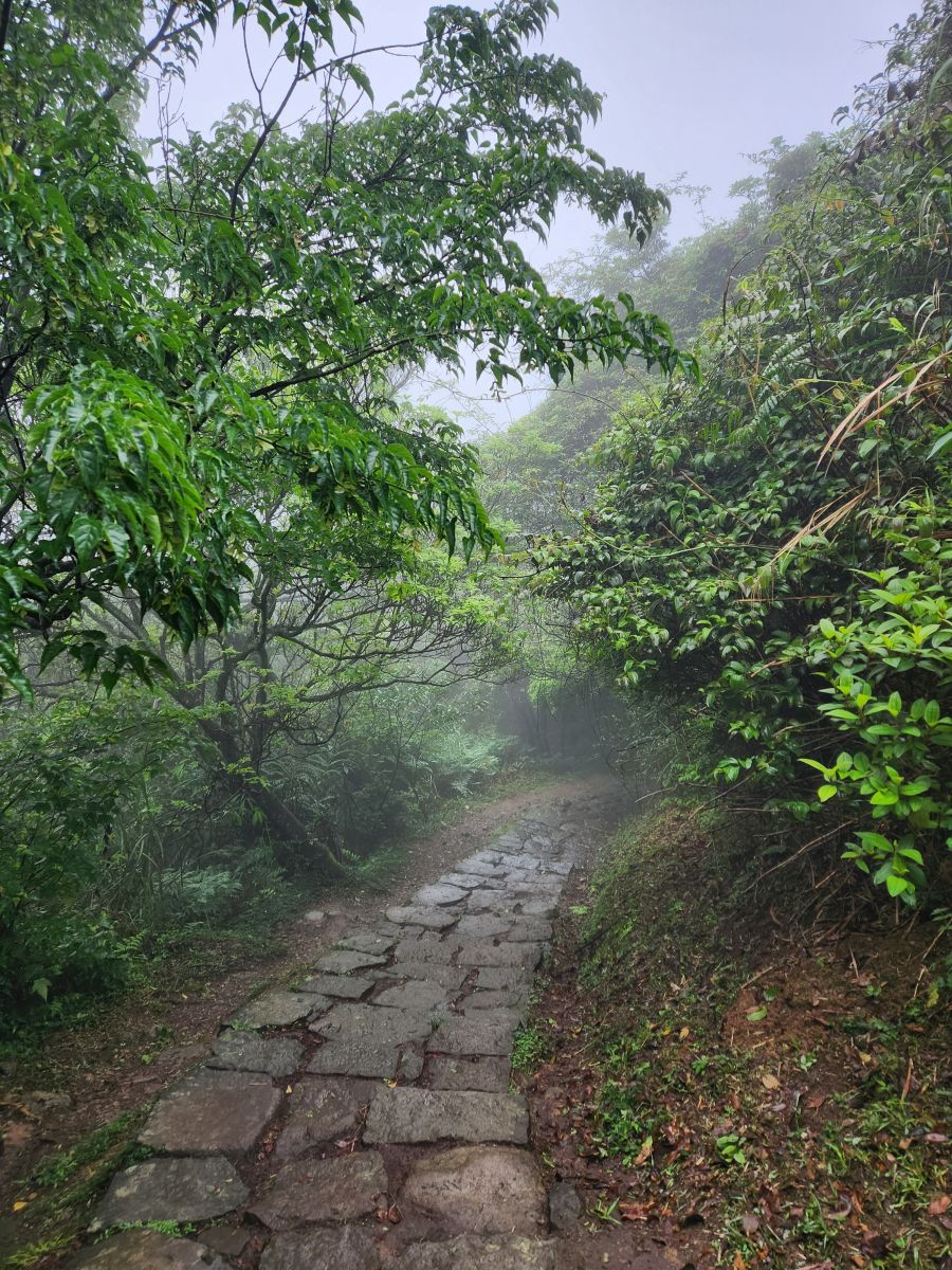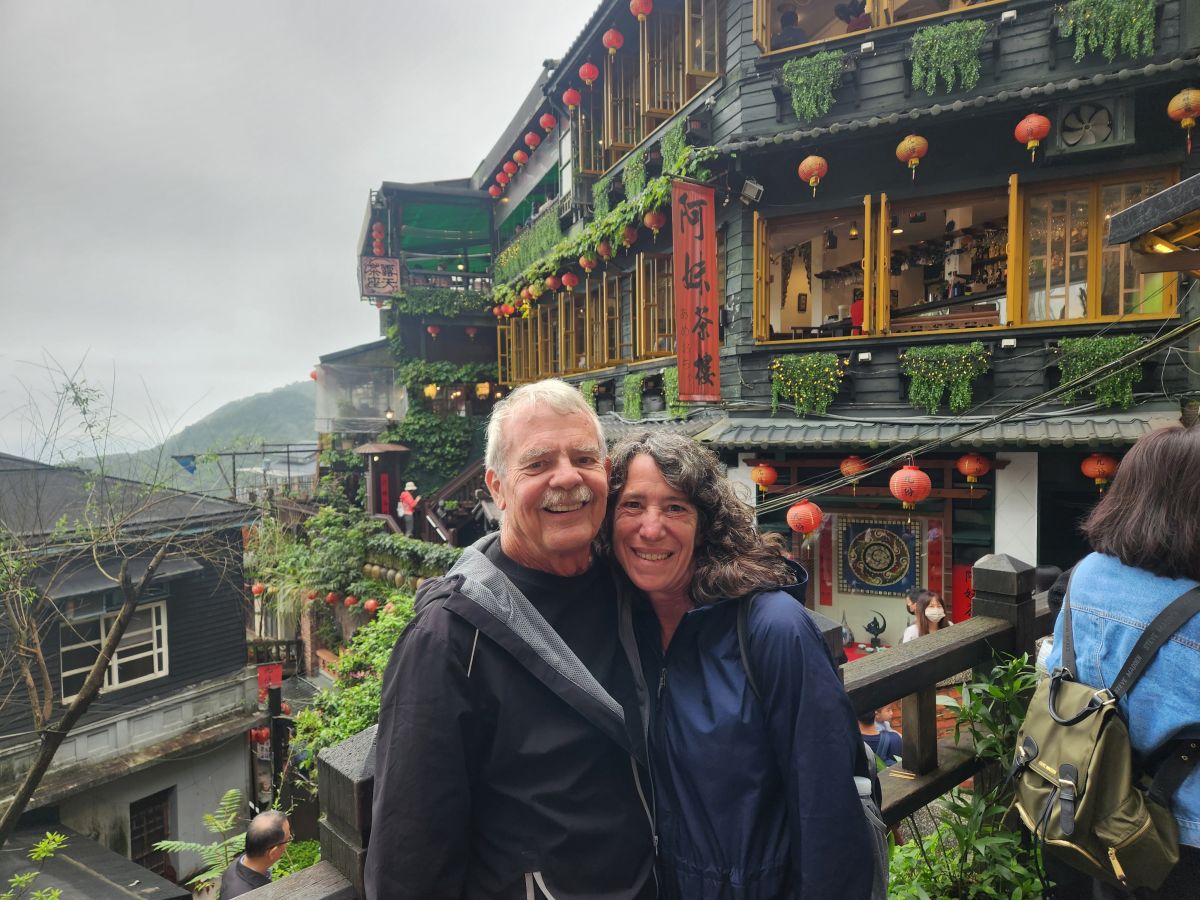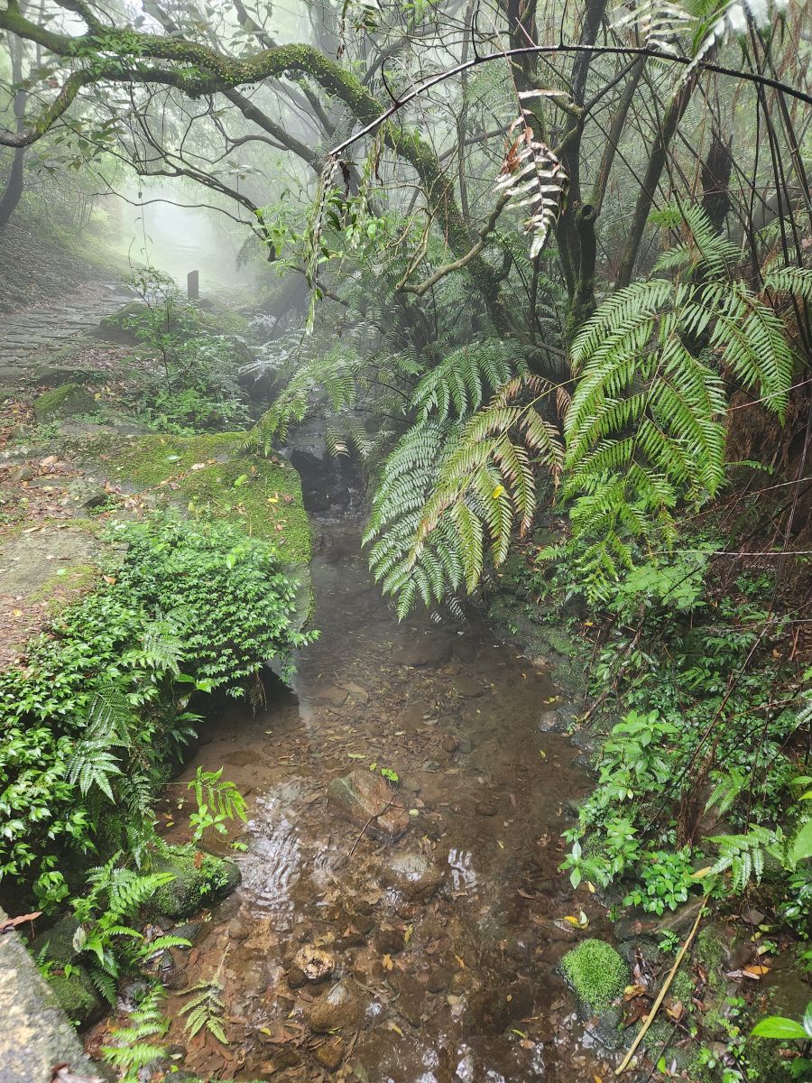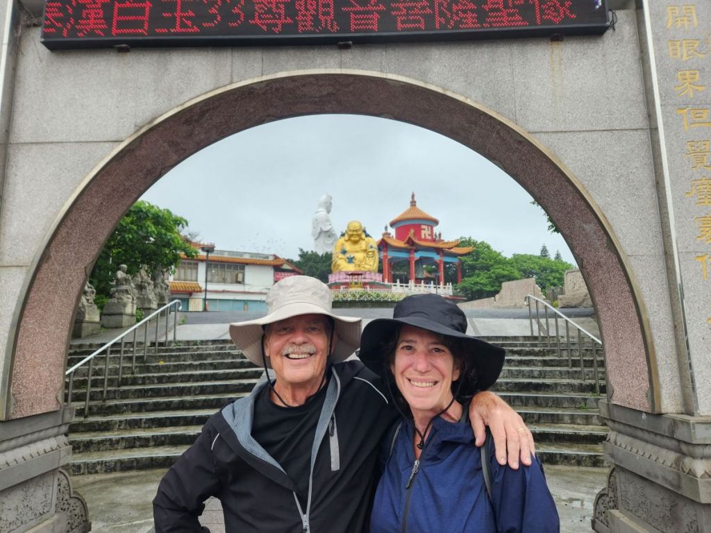 On through the traffic we go, skirting around the main center of Taipei, then up into the mountains on a winding road that would have beautiful vistas if not for the fog. It wasn’t raining when we started out, but now it is sort of misty, foggy, drizzle. Oh well – not like we aren’t used to this type of weather! We’re equipped.