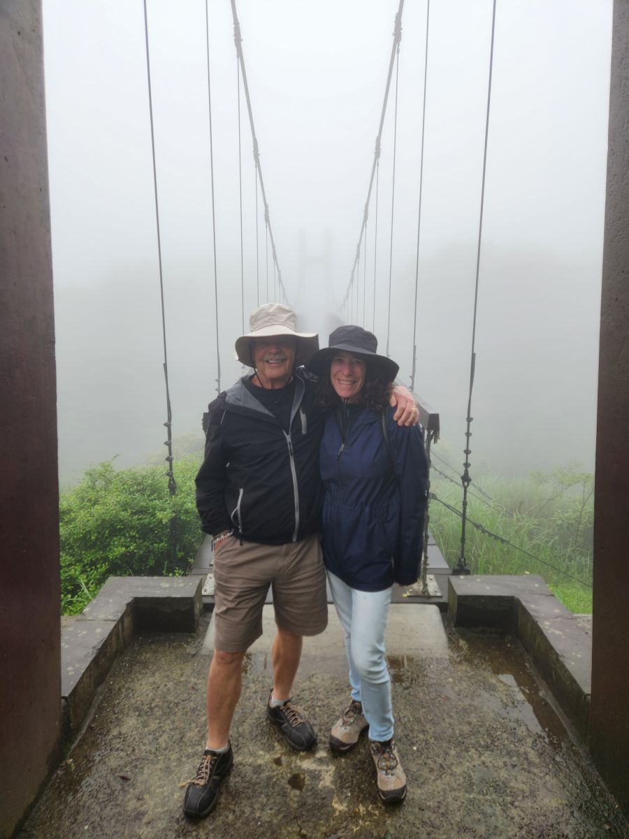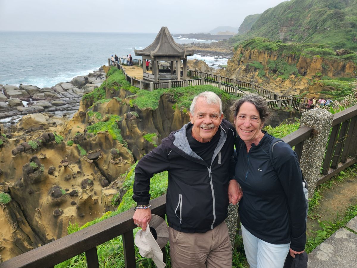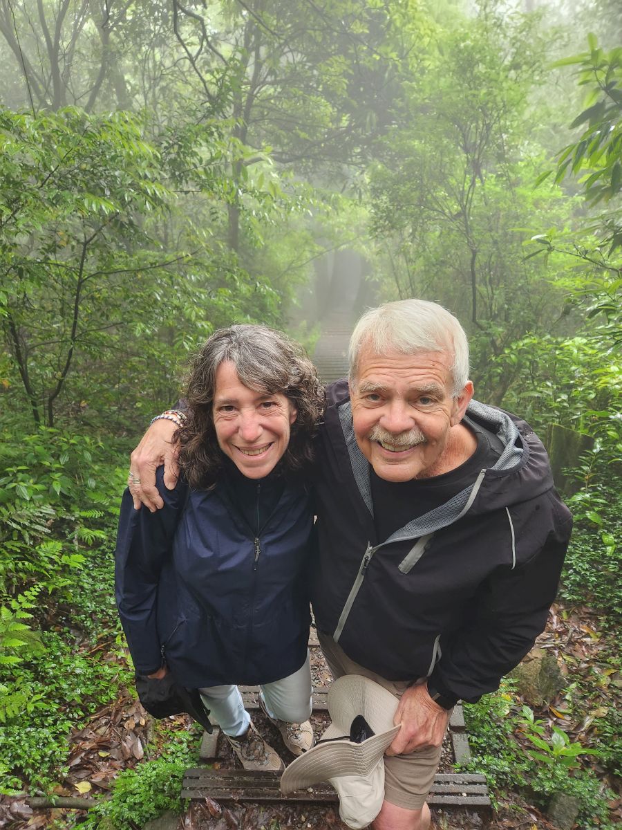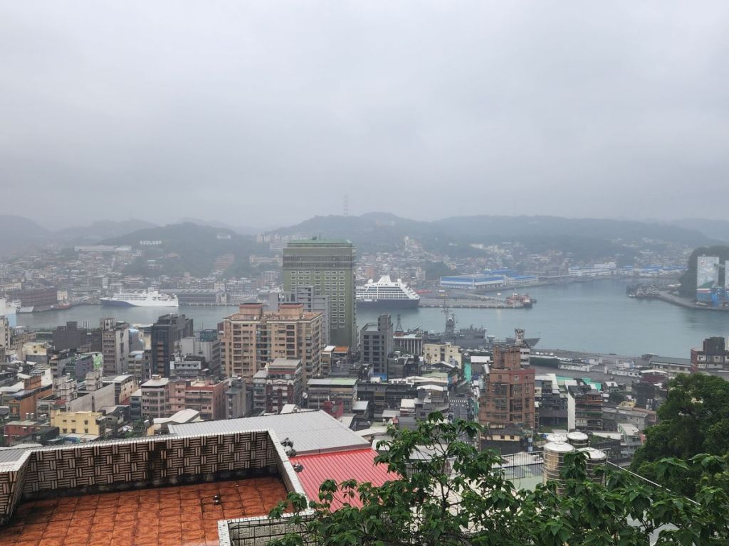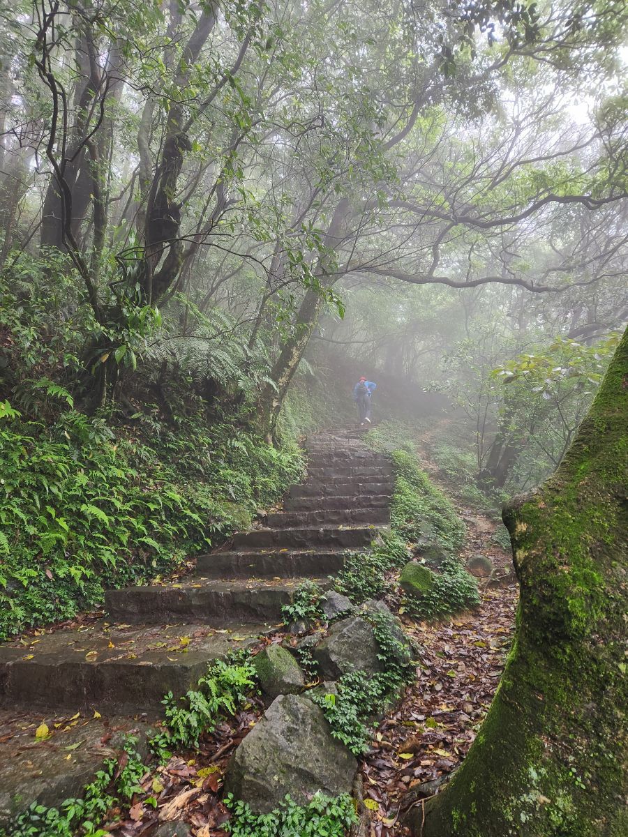 On through the traffic we go, skirting around the main center of Taipei, then up into the mountains on a winding road that would have beautiful vistas if not for the fog. It wasn’t raining when we started out, but now it is sort of misty, foggy, drizzle. Oh well – not like we aren’t used to this type of weather! We’re equipped.