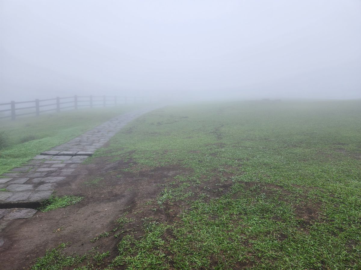 Following along more misty paths, we finally reach the grasslands, which are barely visible, but enough that we can get the feel of how vast they are. Oh, and we can clearly see the bull bollards placed strategically along the top of the pasture. Yeah, we don’t want to have to test these things out – not in this fog, or not at any time really!