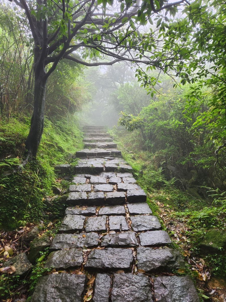 And then we’re off again, climbing through the forest, up these long trails with graduated stair steps and along stone paths in the misty fog. It is really fun, and literally cool because of the fog. We make it to the old Henan Soldiers training camp with the more modern age anti-aircraft pillbox placed strategically at the top of the hill – which probably overlooks the city or some other fabulous vista – but we aren’t seeing that today!