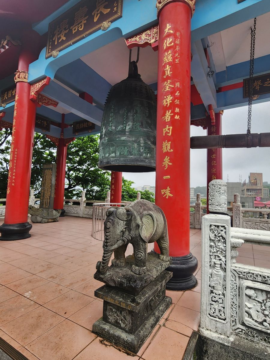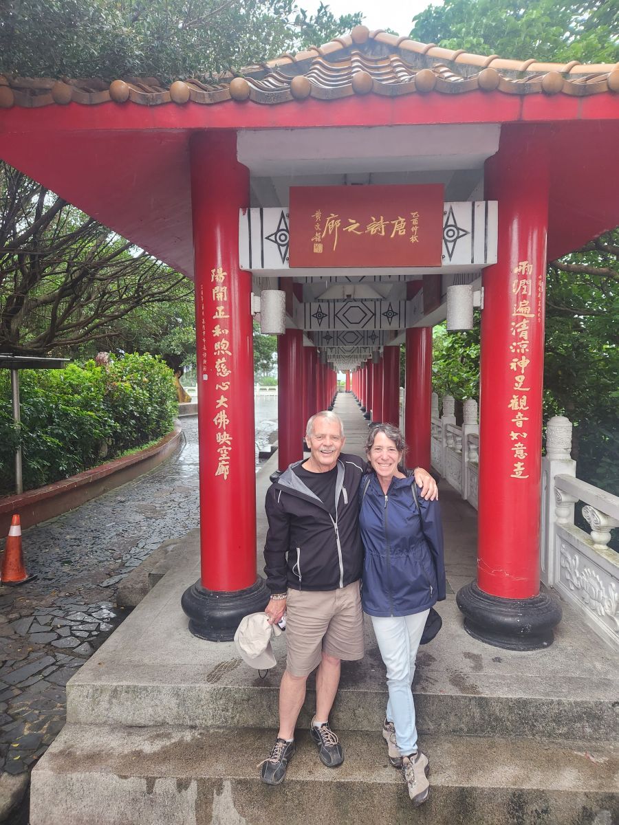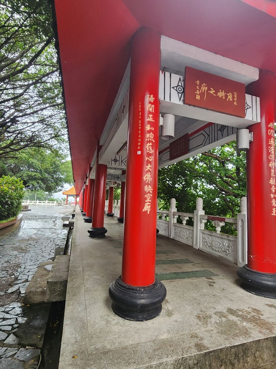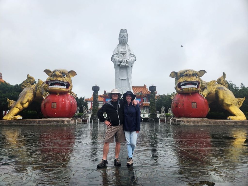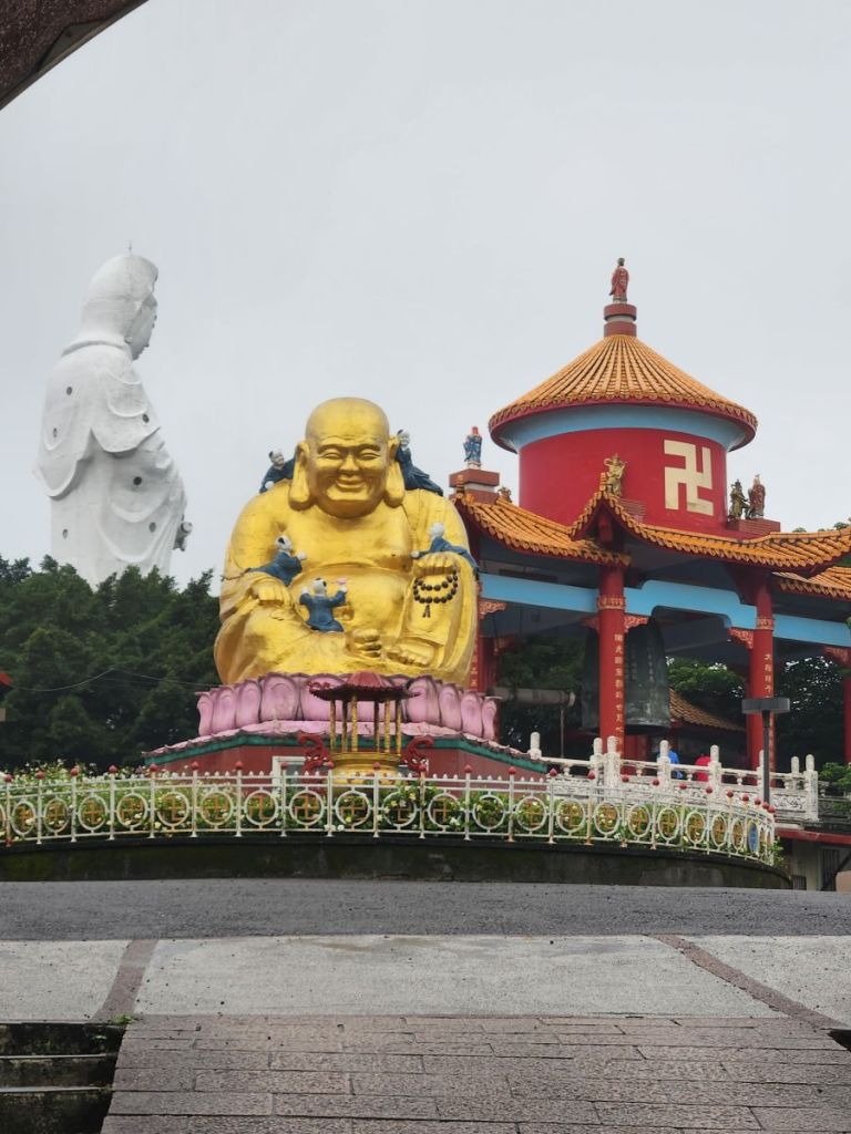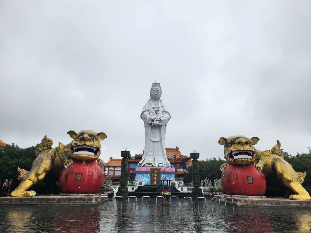 Back in the car, we head toward the Wangougu trail, but it begins to rain again, and we decide to skip the trail, which looks lovely, but with tons of stairs that would be better in the sunshine. Vincent wants to take us to a temple anyway, so he makes a quick u-turn and off we go, up into the hills of Keelung to this amazing Buddhist temple on the hill. It is immense and lovely and bonus! There are these columns that look like the gates of the Kyoto shrine we visited in the rain, so we take fake Inari shrine photos under the columns and will pretend that is our Kyoto visit. LOL.