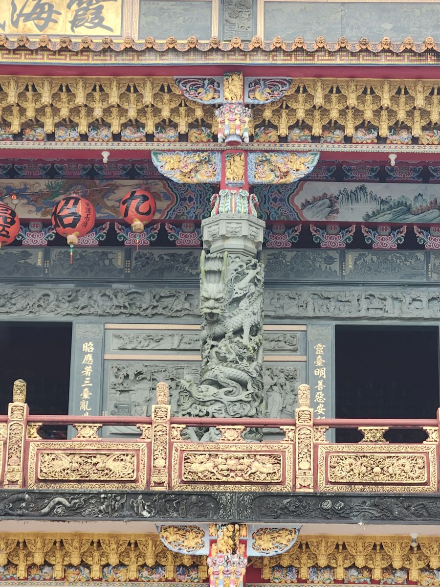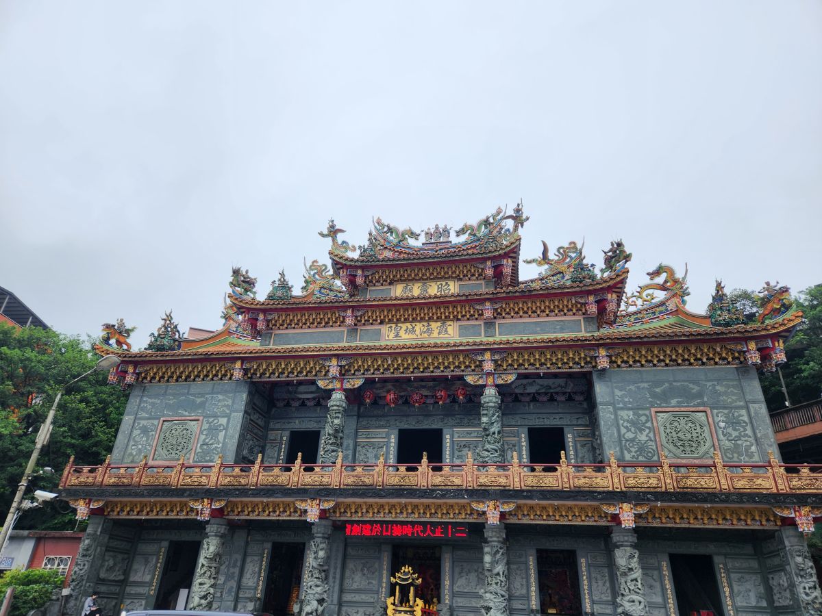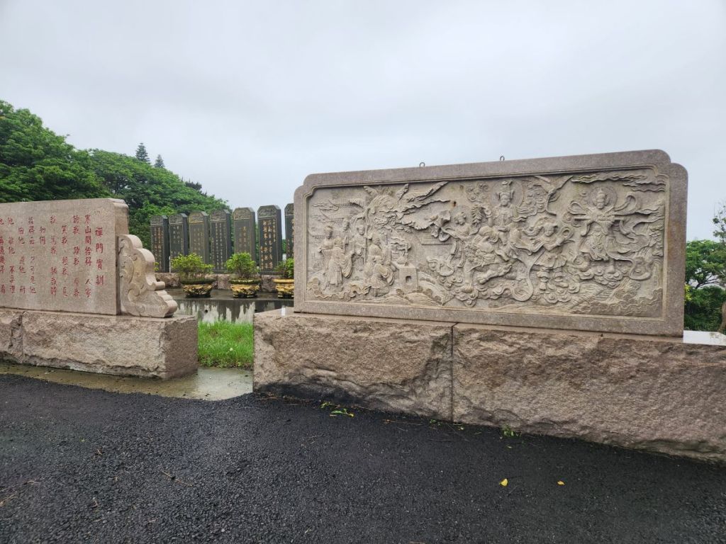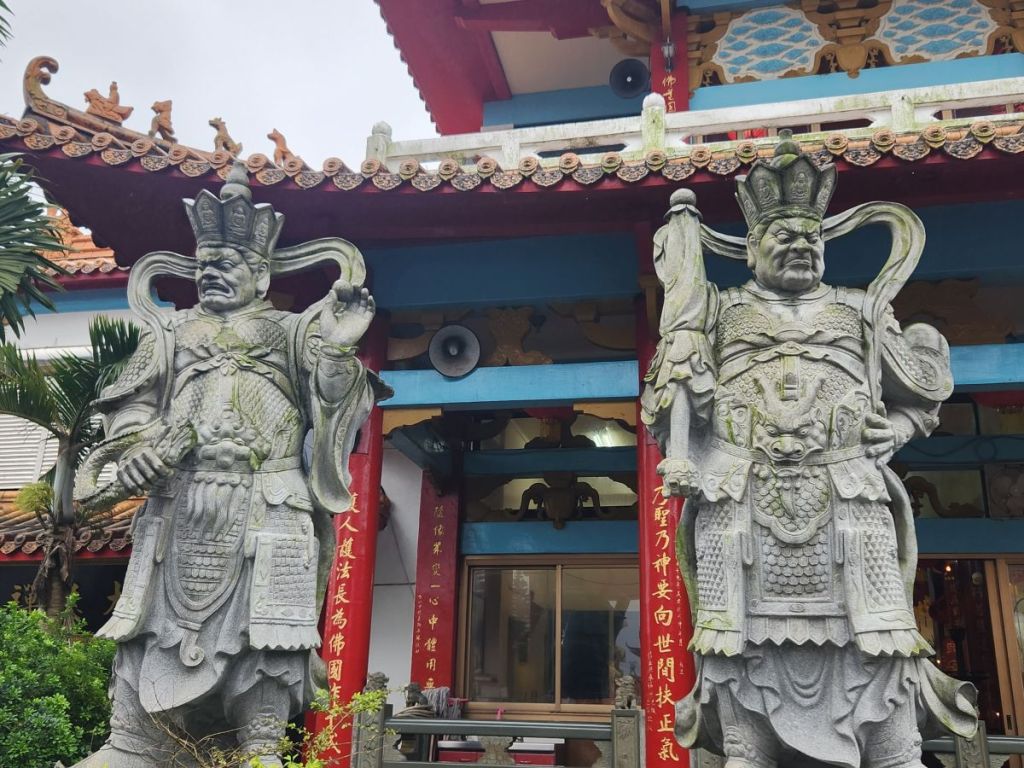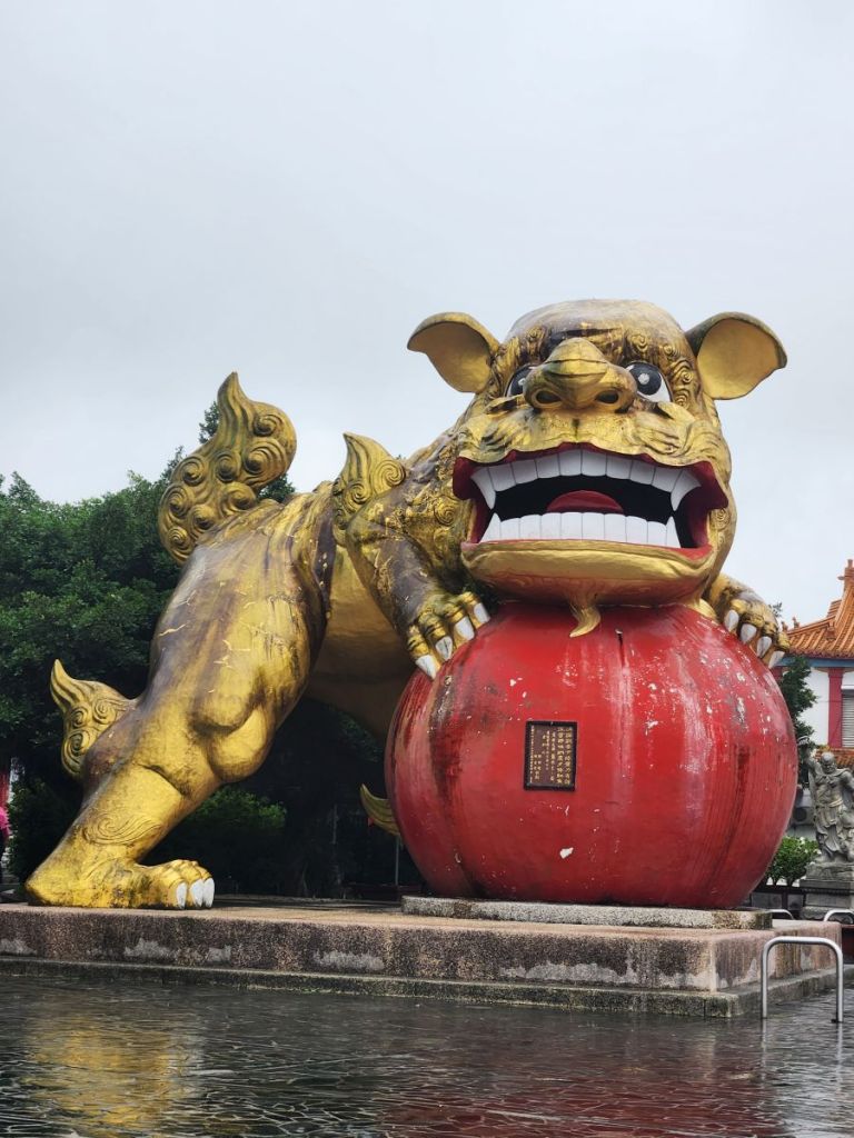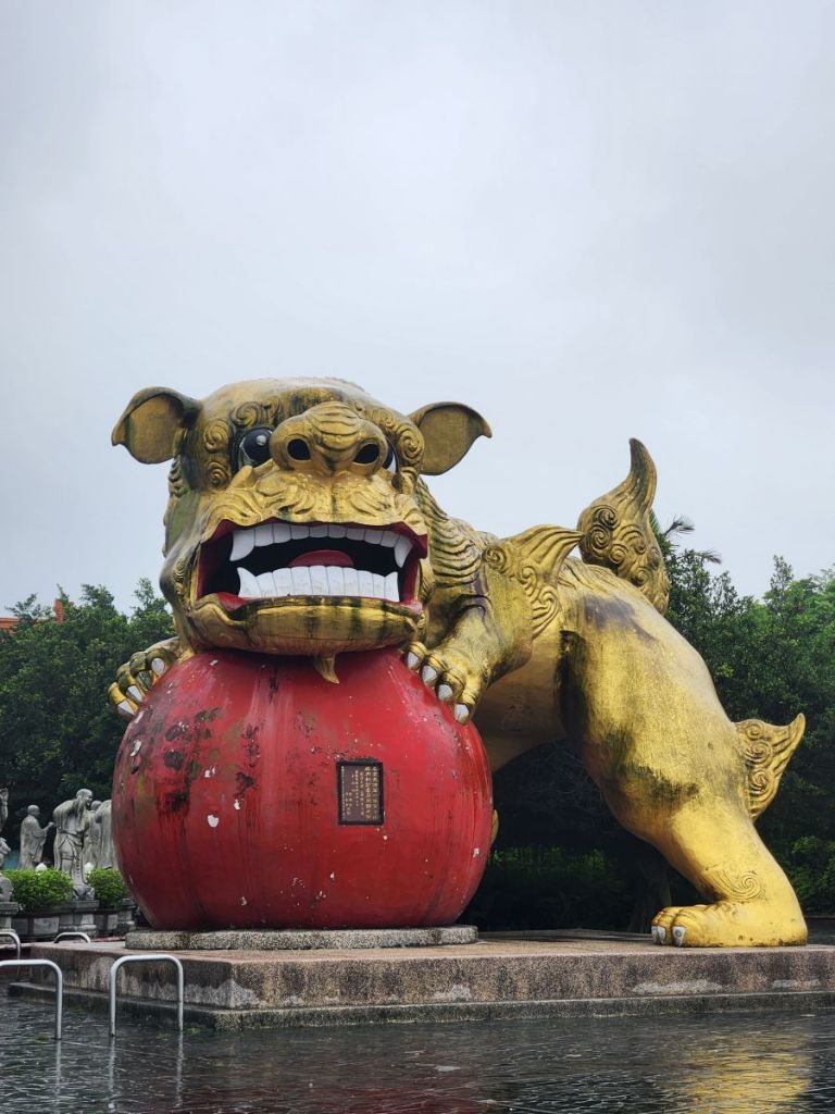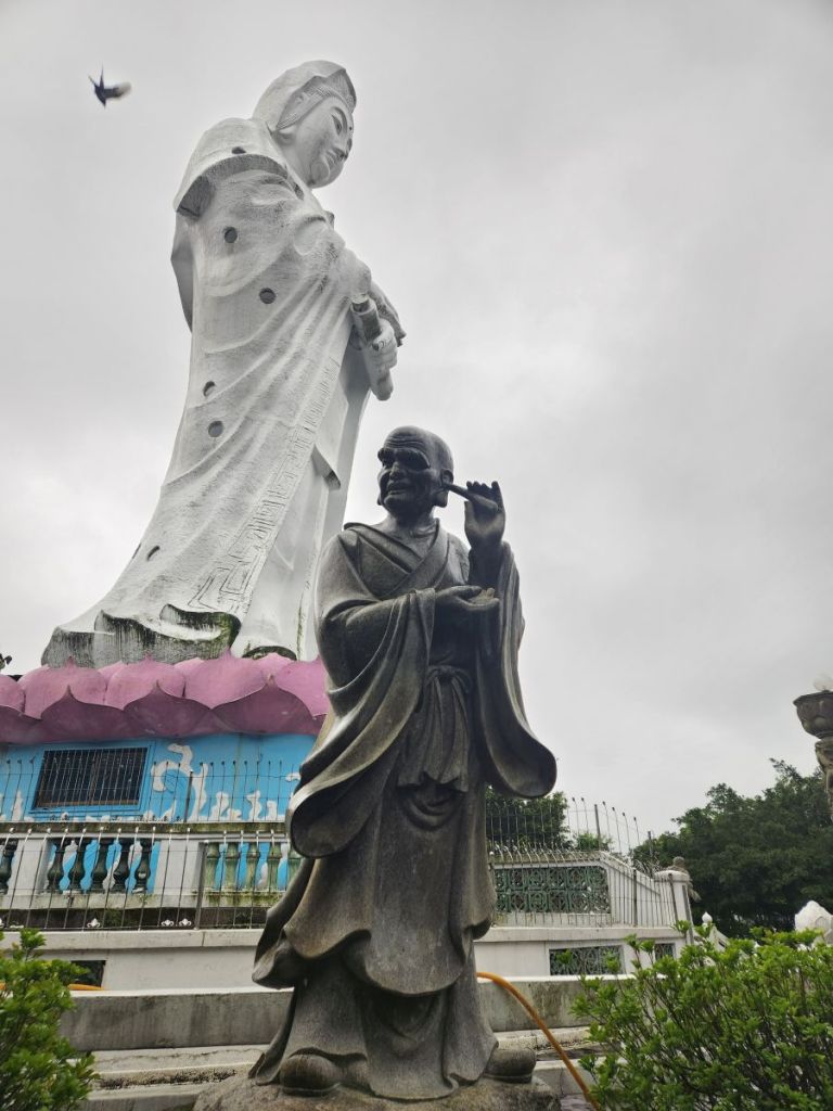 Back in the car, we head toward the Wangougu trail, but it begins to rain again, and we decide to skip the trail, which looks lovely, but with tons of stairs that would be better in the sunshine. Vincent wants to take us to a temple anyway, so he makes a quick u-turn and off we go, up into the hills of Keelung to this amazing Buddhist temple on the hill. It is immense and lovely and bonus! There are these columns that look like the gates of the Kyoto shrine we visited in the rain, so we take fake Inari shrine photos under the columns and will pretend that is our Kyoto visit. LOL.