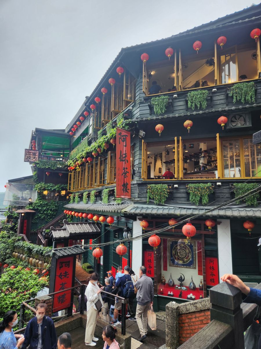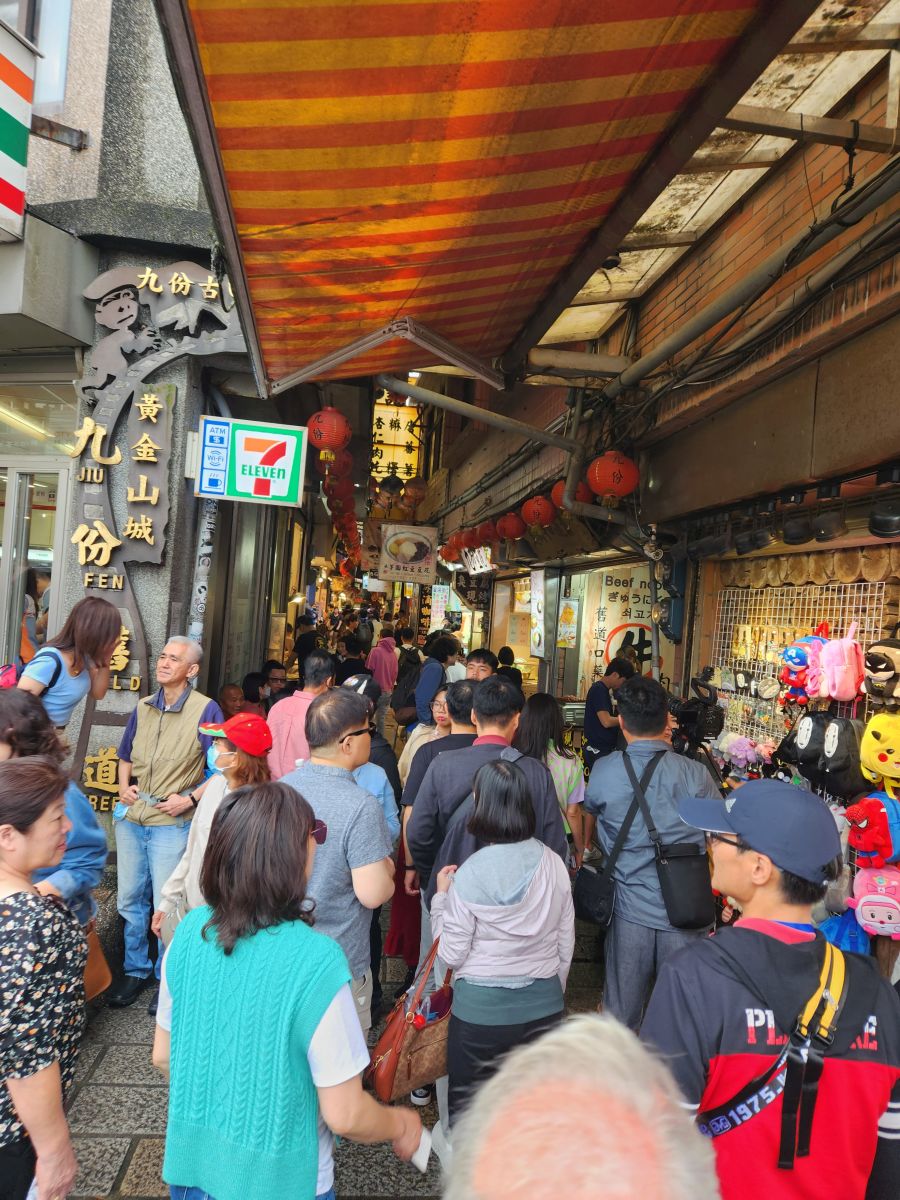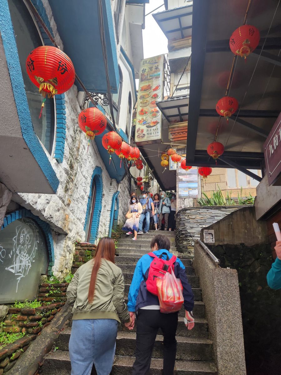 Then we are off, past Taipei city, and the Grand Hotel (where of course we visited last time here) and finally onto the Chuifen, the old gold mining town turned tourist attraction! This is our lunch spot – street food, and tons of specialties to try. We luck into a parking space right at the foot of the old street by a cool looking temple, then make the trek up the stairs to the little teeny street.
