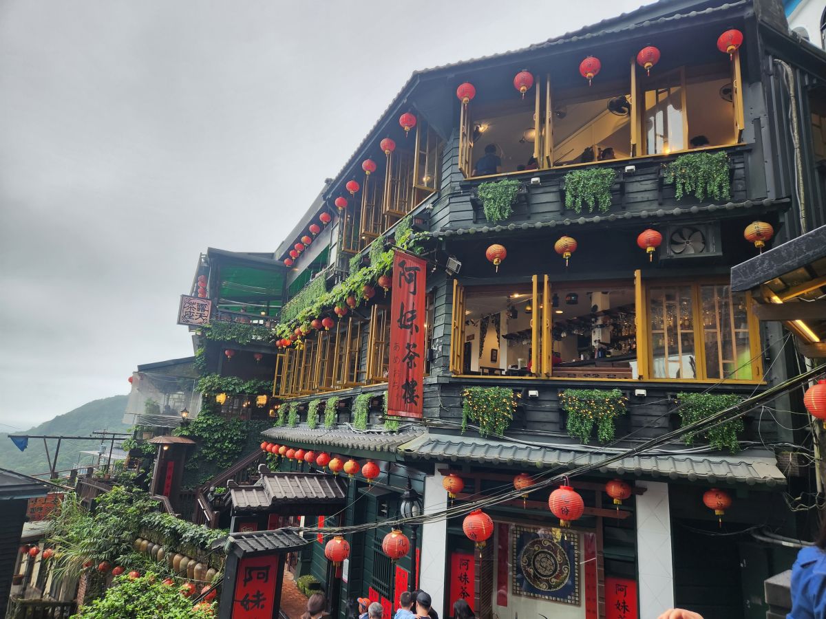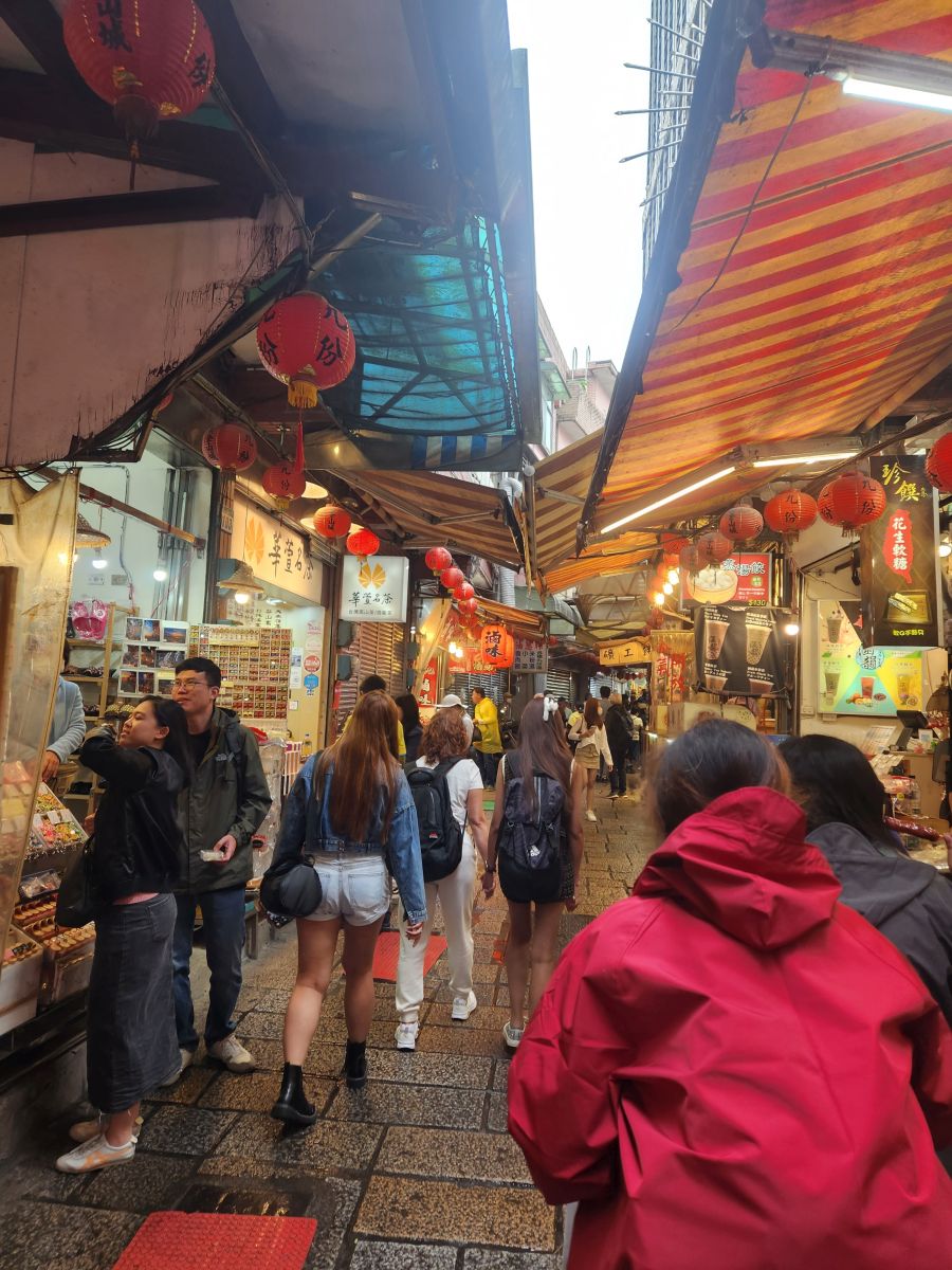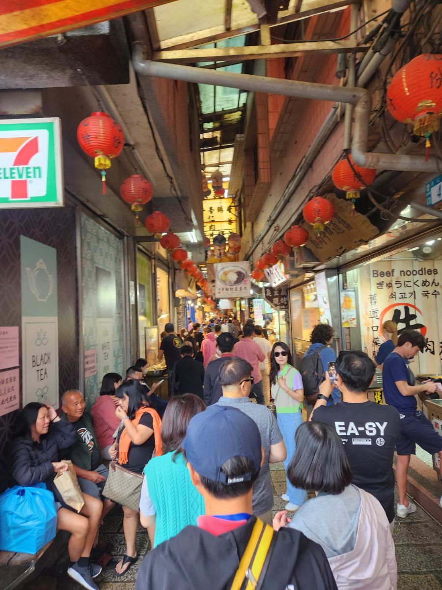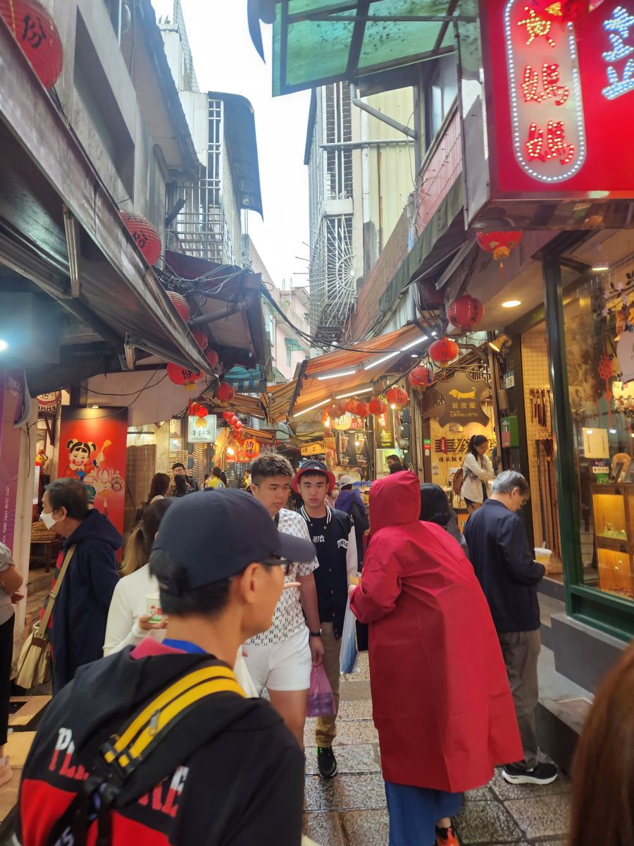 Then we are off, past Taipei city, and the Grand Hotel (where of course we visited last time here) and finally onto the Chuifen, the old gold mining town turned tourist attraction! This is our lunch spot – street food, and tons of specialties to try. We luck into a parking space right at the foot of the old street by a cool looking temple, then make the trek up the stairs to the little teeny street.